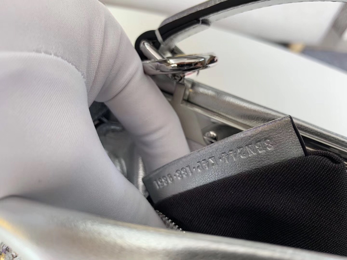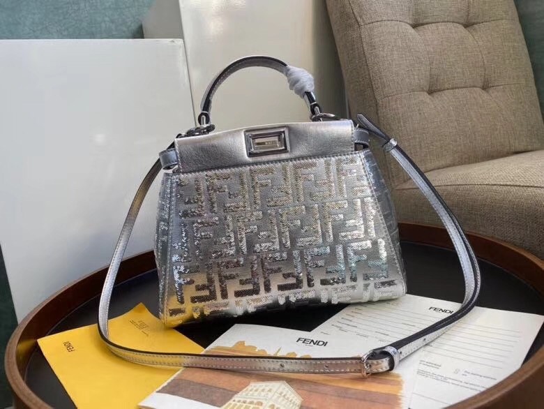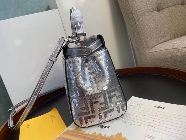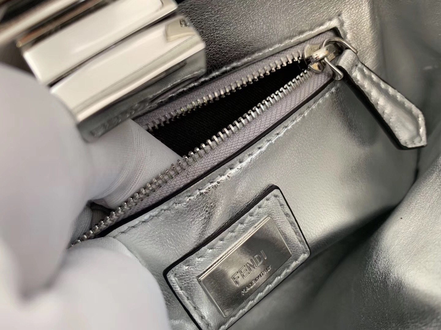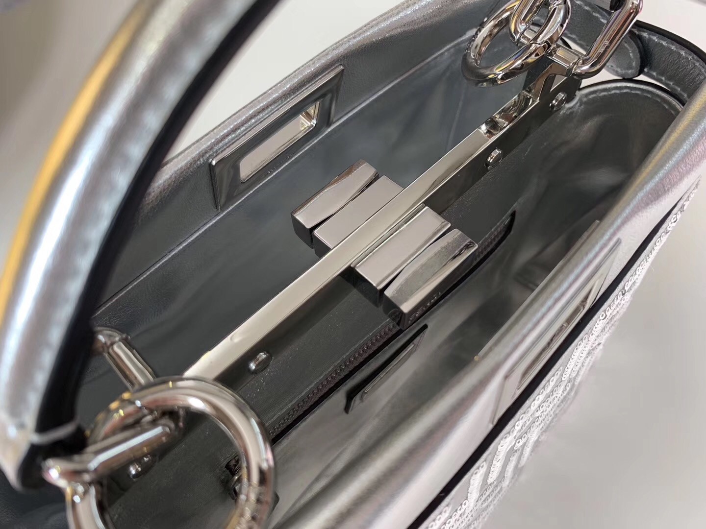 Fast forward one year, and the rapper, singer and songwriter has released her own collection with FENDI, appropriately titled — FENDI Prints On. Part of the next chapter in FENDI’s FF series. This Peekaboo Mini bag has been ade of mirror-effect silver leather. Decorated with FF embroidery in silver sequins.