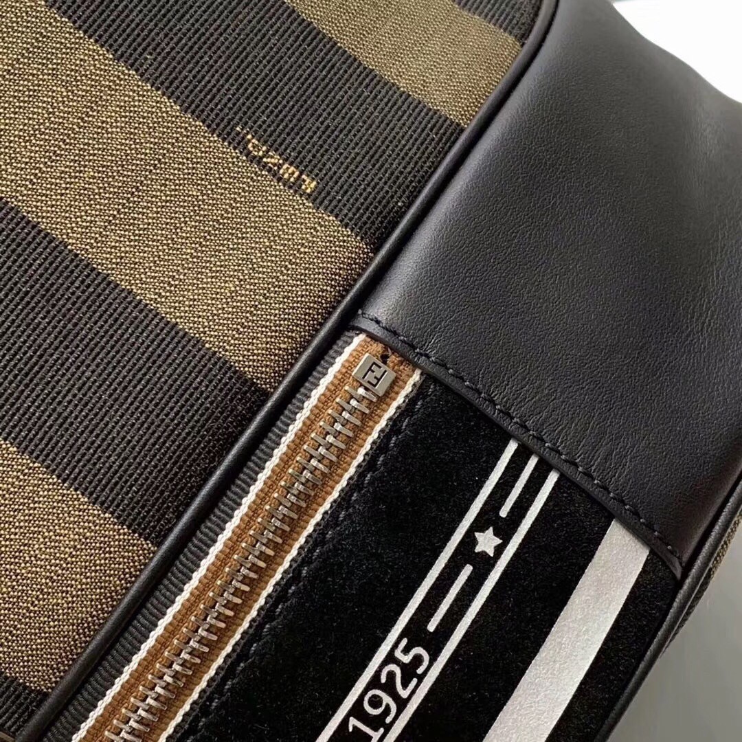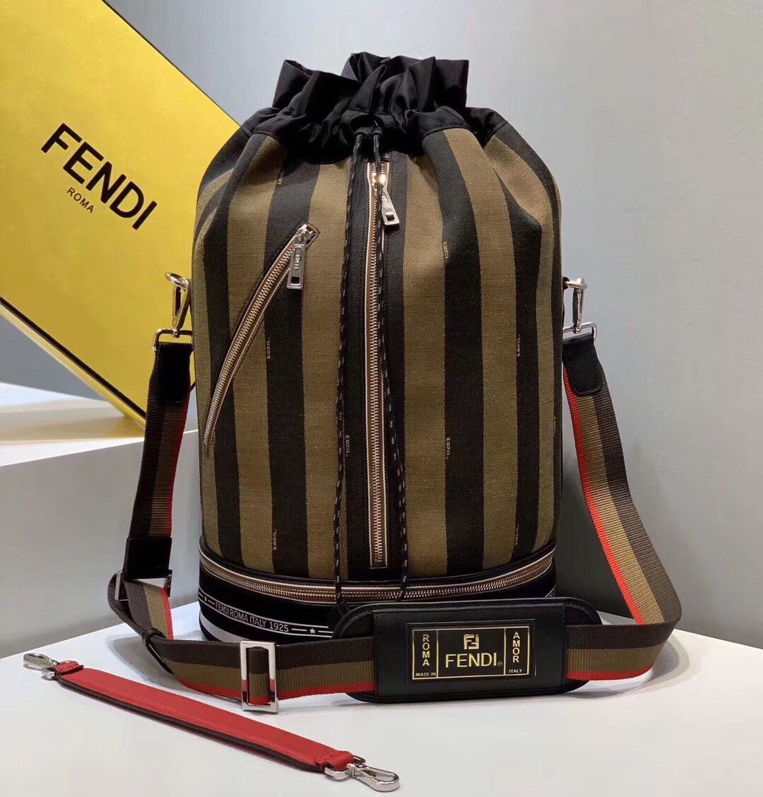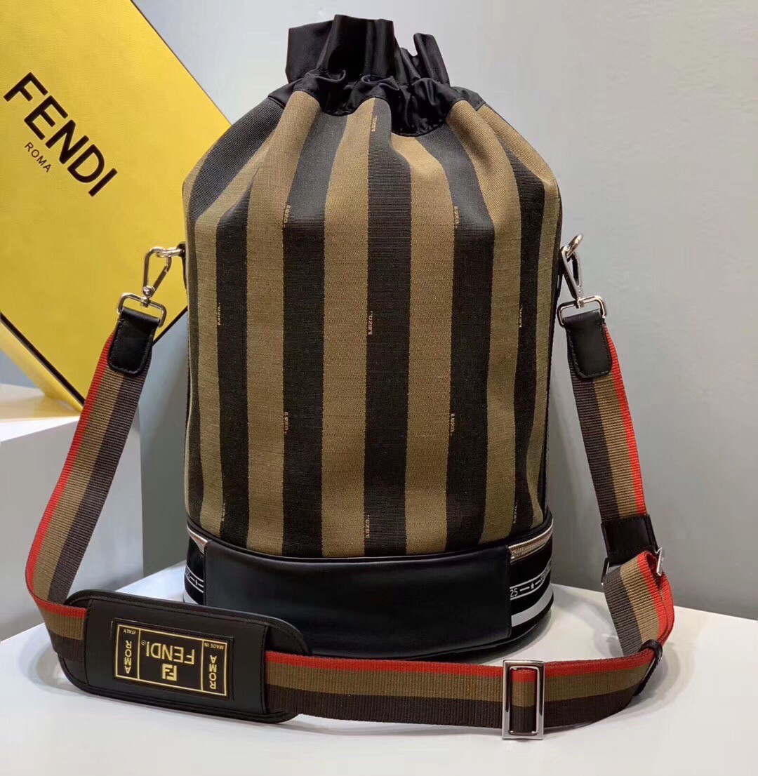 Sports bag with drawstring closure. Two pockets with external zips and structured compartment on the bottom. The bag is equipped with removable handle and shoulder strap. Made in Pequin striped fabric in brown. Trimmed with sport inspired reflector details. The tricolour strap is branded with a Fendi Label shoulder piece printed in gold. Palladium-finish metalware.