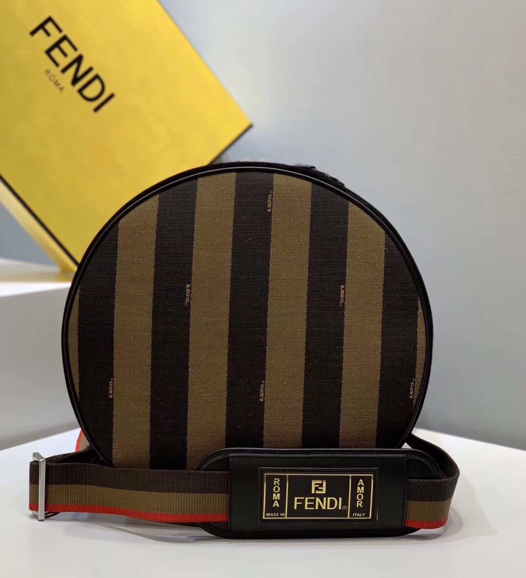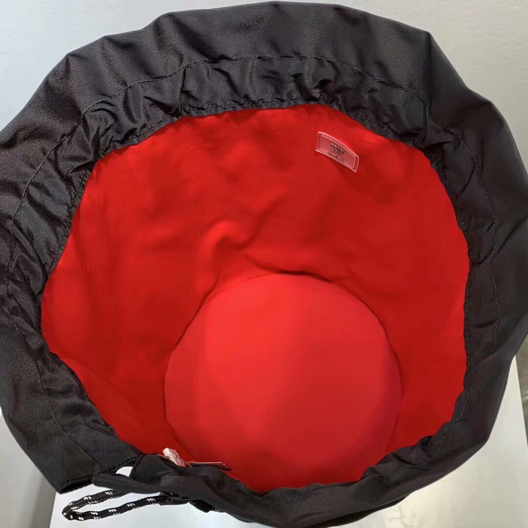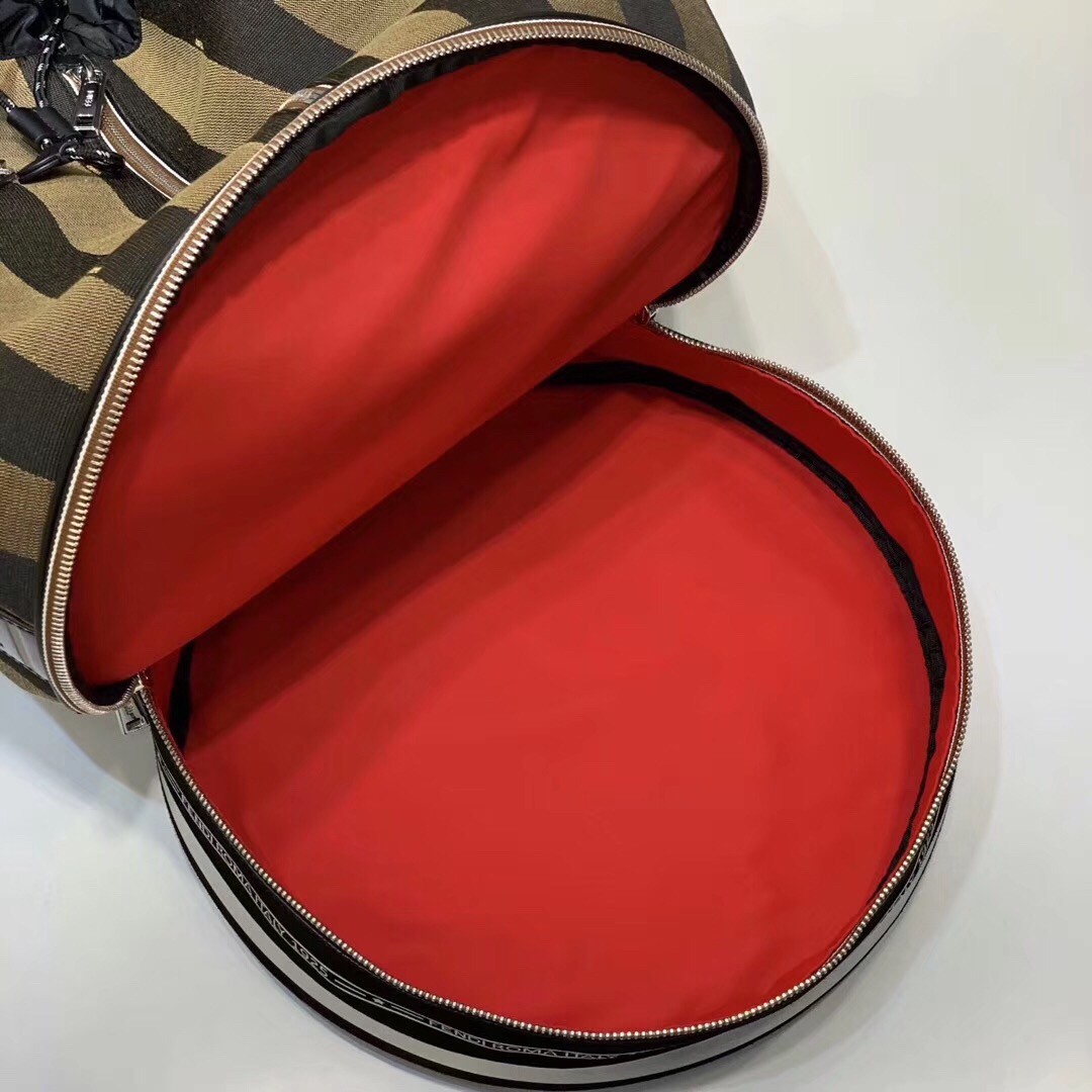 Sports bag with drawstring closure. Two pockets with external zips and structured compartment on the bottom. The bag is equipped with removable handle and shoulder strap. Made in Pequin striped fabric in brown. Trimmed with sport inspired reflector details. The tricolour strap is branded with a Fendi Label shoulder piece printed in gold. Palladium-finish metalware.