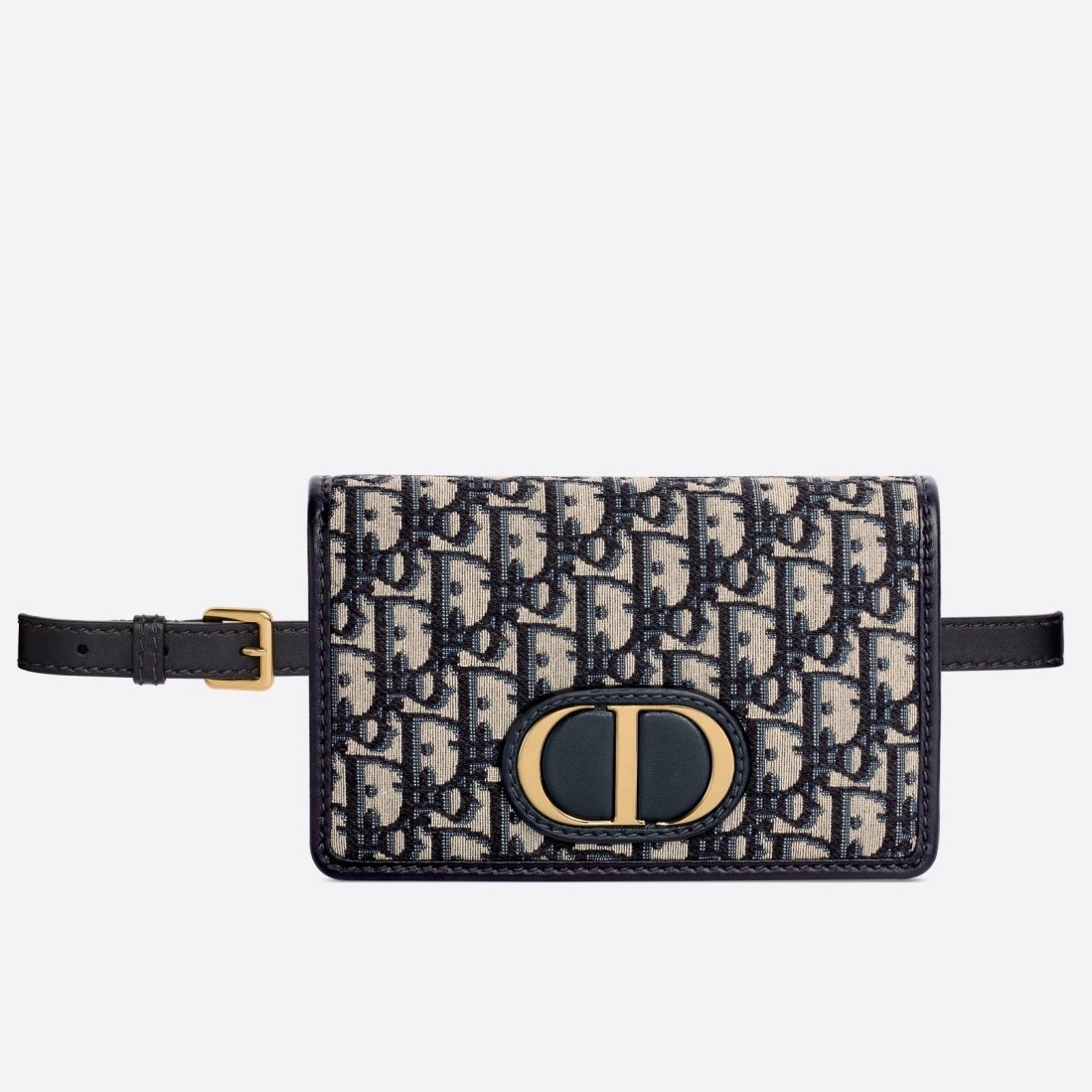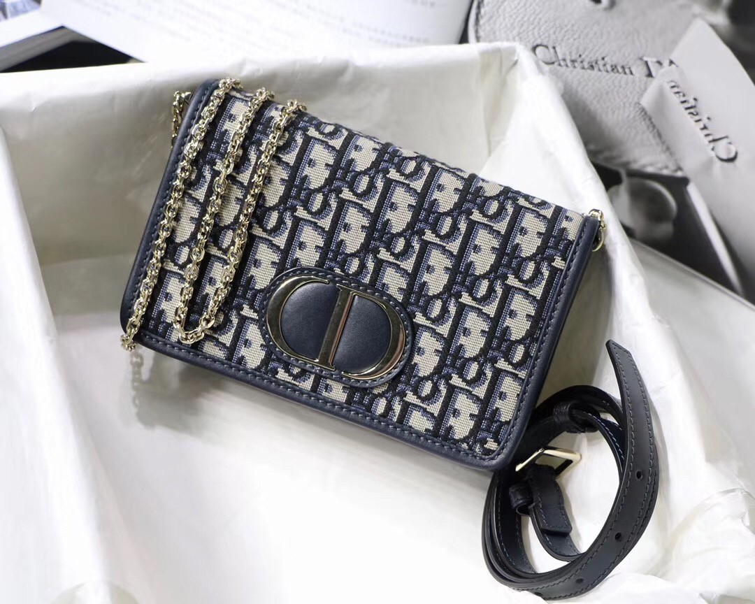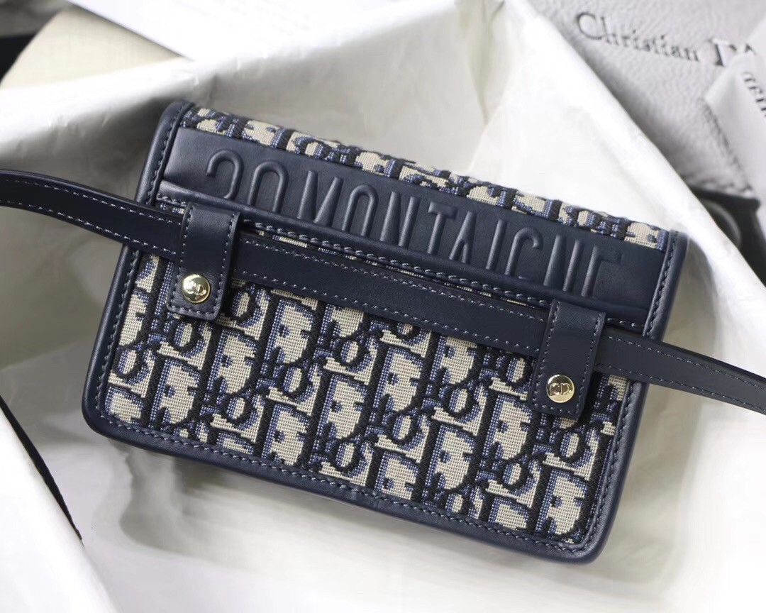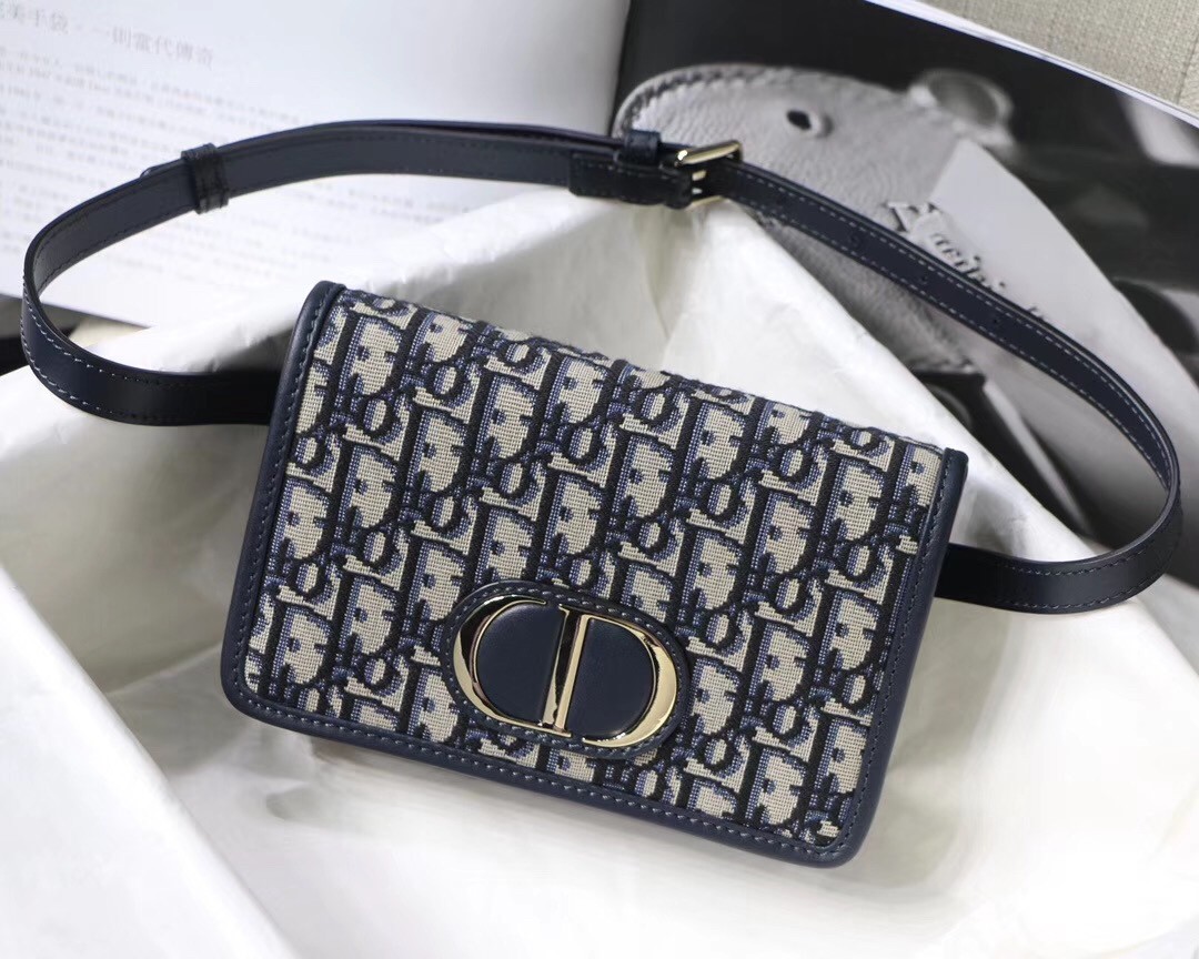 The blue Dior Oblique 2-in-1 pouch is a versatile design that features a 'CD' element at the front to showcase the signature look of the 30 Montaigne line. A single interior compartment is accented by 4 card slots, 1 zip pocket, and 2 patch pockets. The piece can be worn as a belt, on the shoulder, crossbody, or carried as a clutch.
