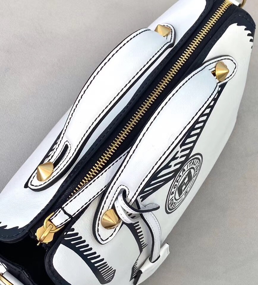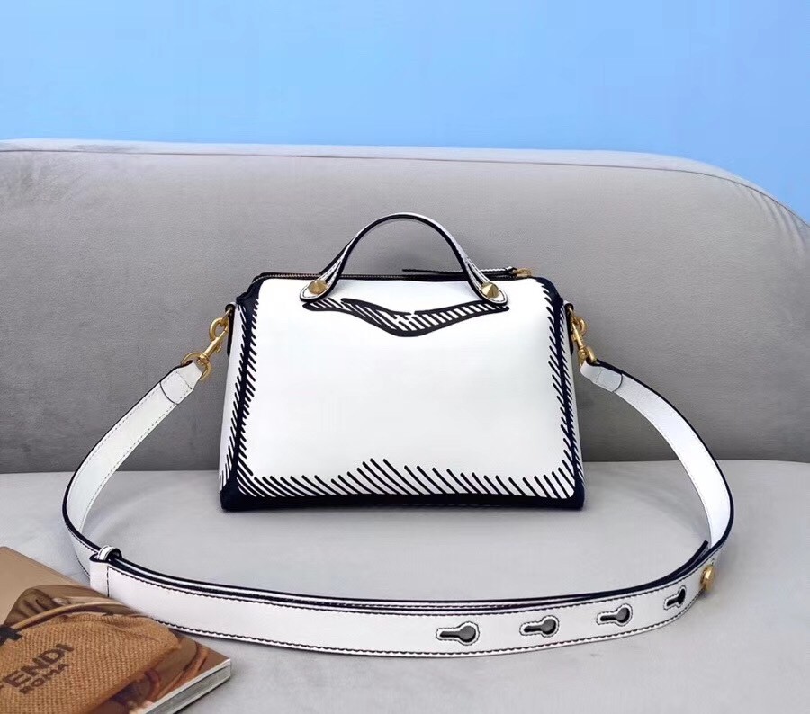 Medium Iconic By The Way Boston bag, in white leather decorated with edges and details marked by a contrasting graphic outline in black that creates a two-dimensional effect and a Fendi Stamp design in black, with zip fastening. Equipped with a spacious lined interior, an inner pocket with zip, and gold-finish metalware.The bag can be carried by hand with the handles, or worn either on the shoulder or cross-body with the adjustable, detachable shoulder strap. Customisable leather pendant.