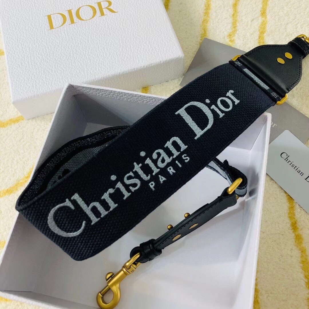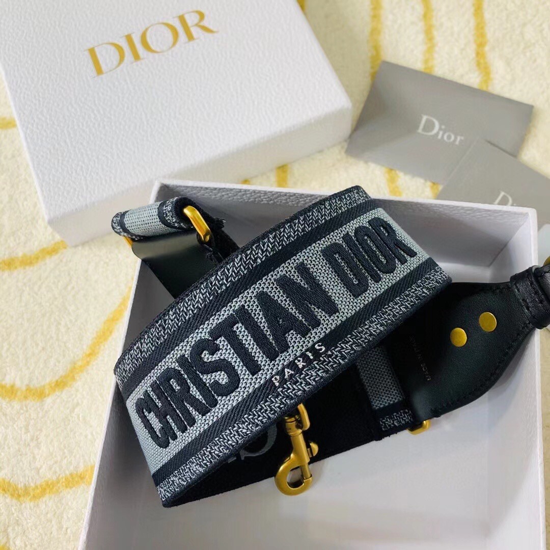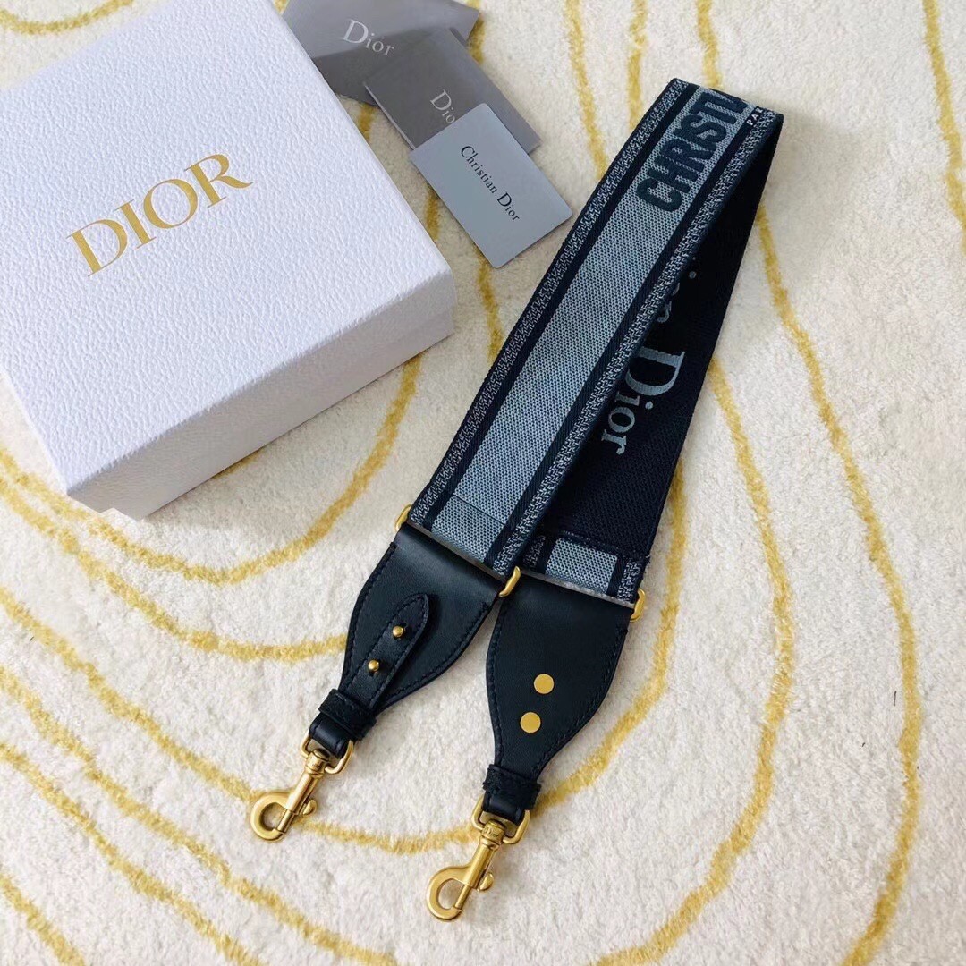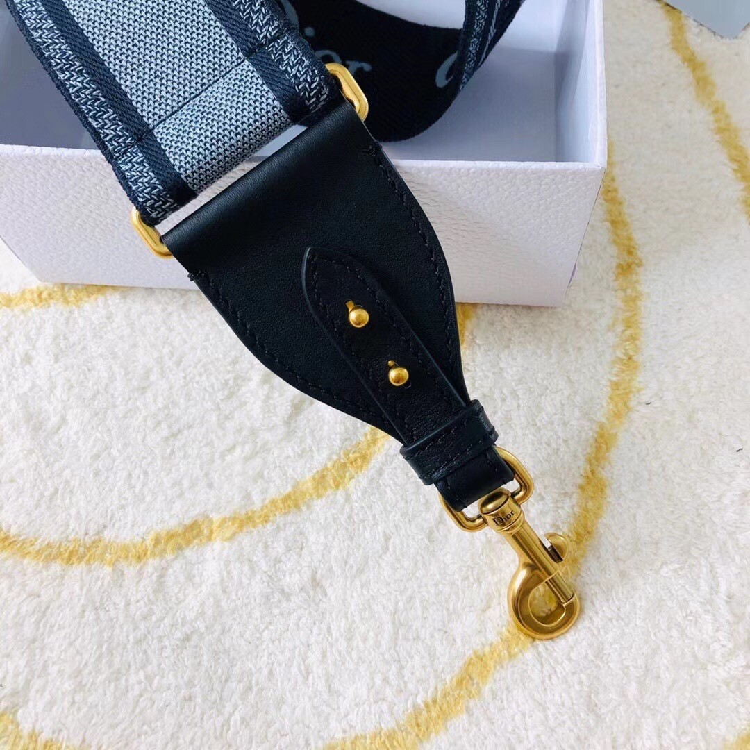The blue denim embroidered strap is a distinctive accessory to personalize the Lady Dior or Saddle bag. Spotlighting a bold 'Christian Dior' signature, the strap is finished with black calfskin and antique gold hooks to attach it to the bag. Try wearing it over the shoulder or crossbody with your favorite bag to add a personal signature.