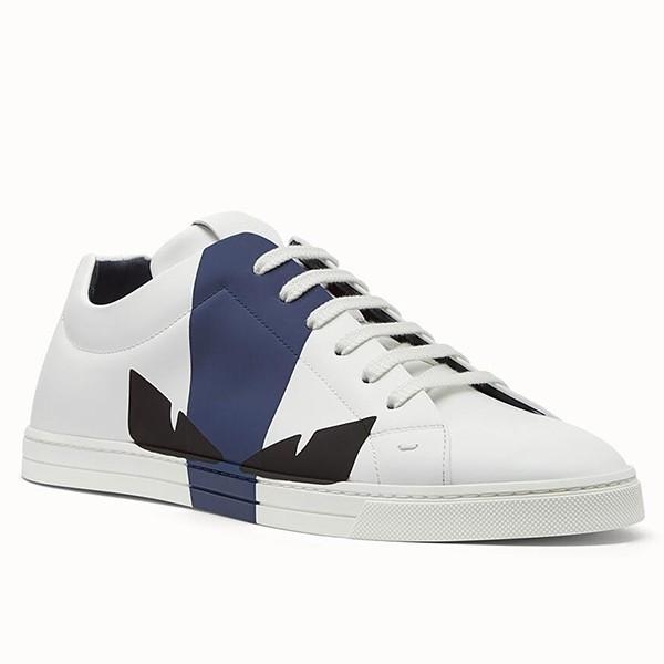 Lace-up sneakers lined in micromesh tech fabric. Rubber box sole. Made of white calfskin leather. Two-tone black and blue sprayed patent leather details which reproduce the Bag Bugs motif.