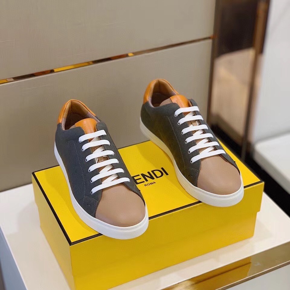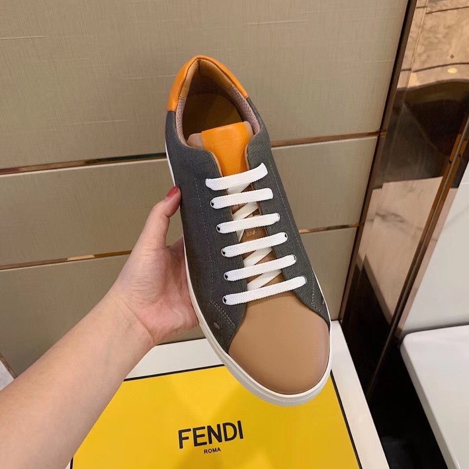 Lace-up low-top sneakers with rubber soles. Made of canvas with jacquard FF motif in shades of brown. Finished in contrasting leather with orange details on the tongue and heel.