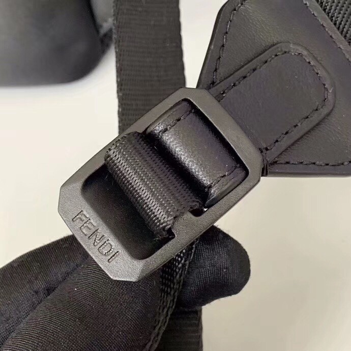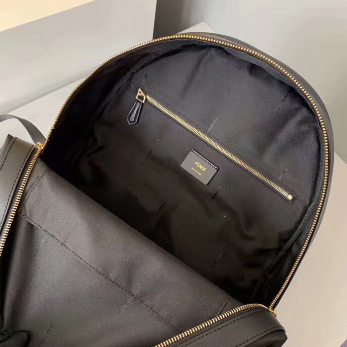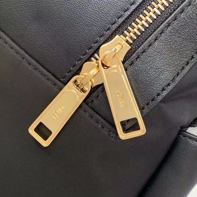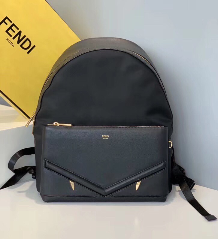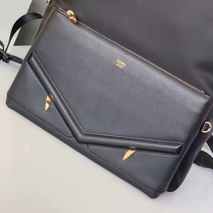 Large backpack with front pocket. Breathable technical mesh back and adjustable shoulder straps. Zip fastening with double slider and inside pocket. Made of black nylon. The leather pocket is decorated with embossed appliqués and metal studs that evoke the Bag Bugs eyes. Gold-finish metalware.
