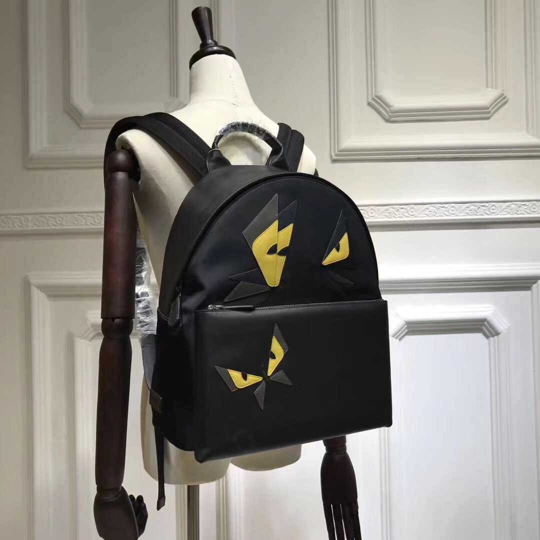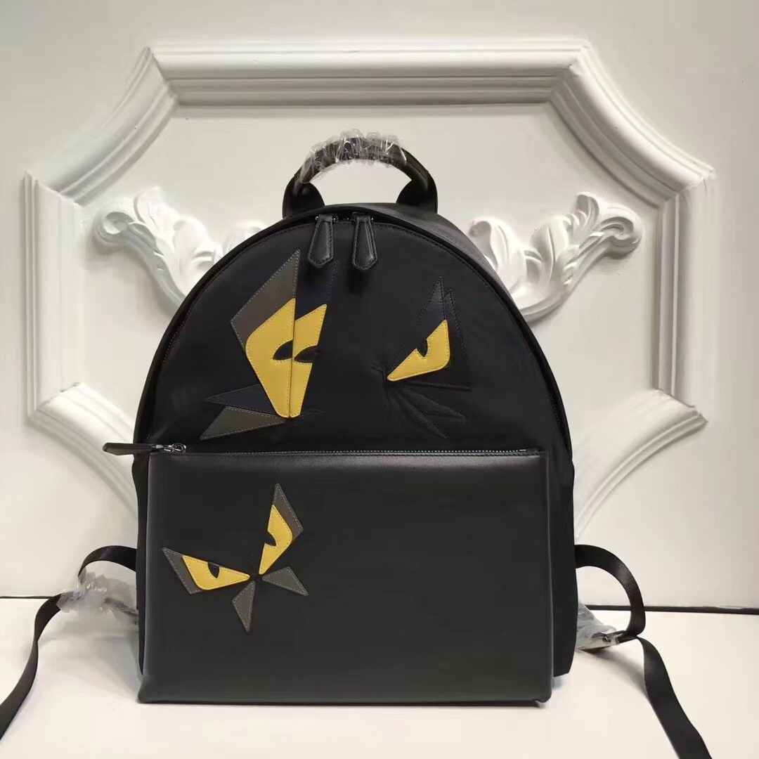 Carry all your daily essentials in style with this Butterfleyes backpack from Fendi. Crafted in Italy and presented in a classic black, this backpack is decorated with the Butterfleyes motif embroidered in various sizes in dark grey and yellow appliqués. This Fendi backpack also features a round top handle, adjustable shoulder straps, a main compartment with an internal zipped pocket and a front zip compartment.
