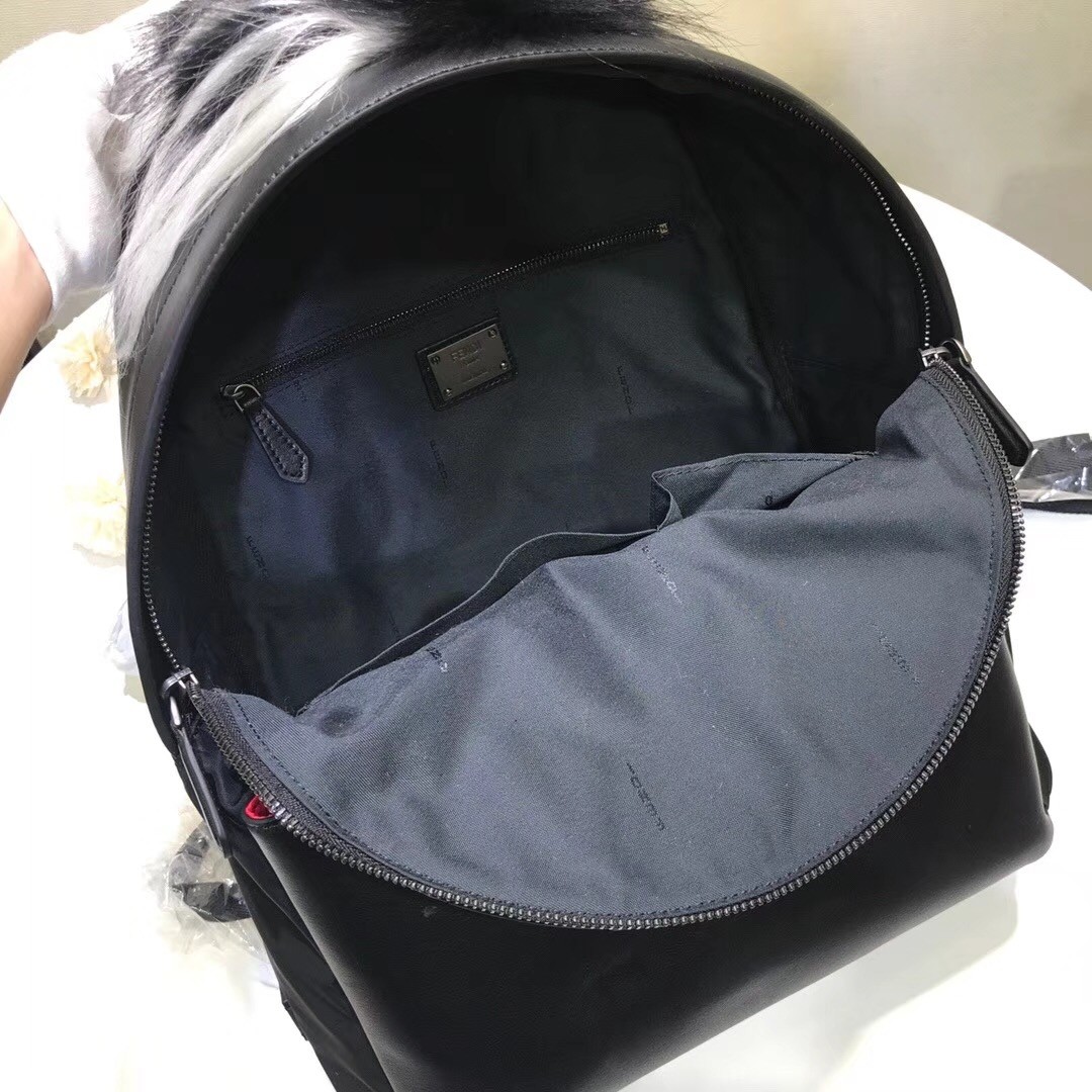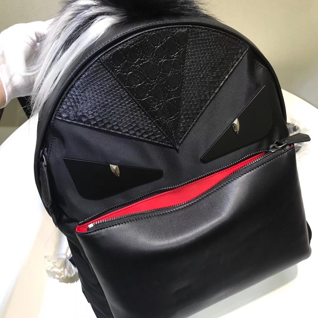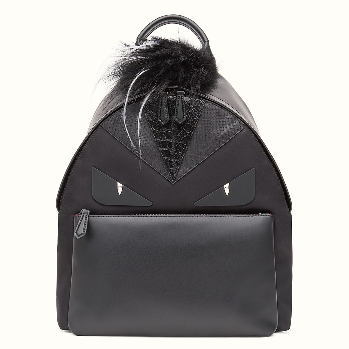Black nylon backpack with inlaid Bag Bugs eyes in tone-on-tone python and cayman, fur accent and front zip pocket. The eyes are made from black satin-finish metal. Fabric handle and shoulder straps and breathable technical mesh backing. Zip fastening with leather pull, 1 internal pocket.