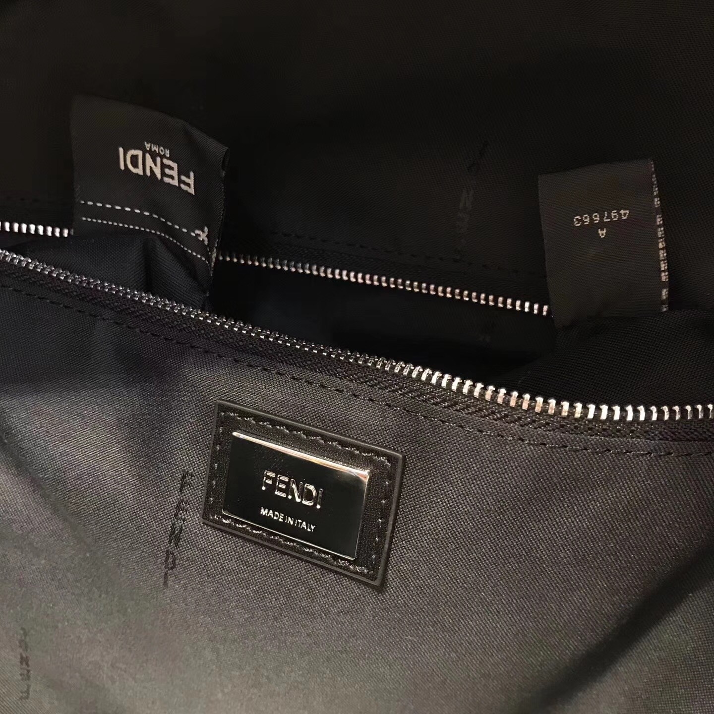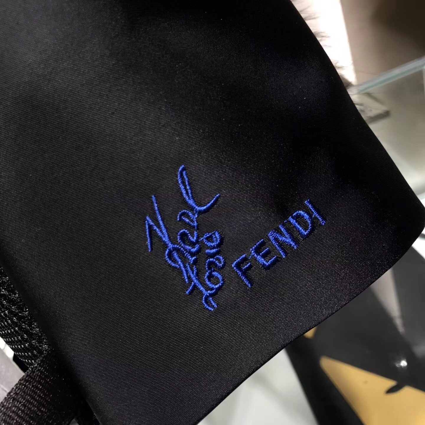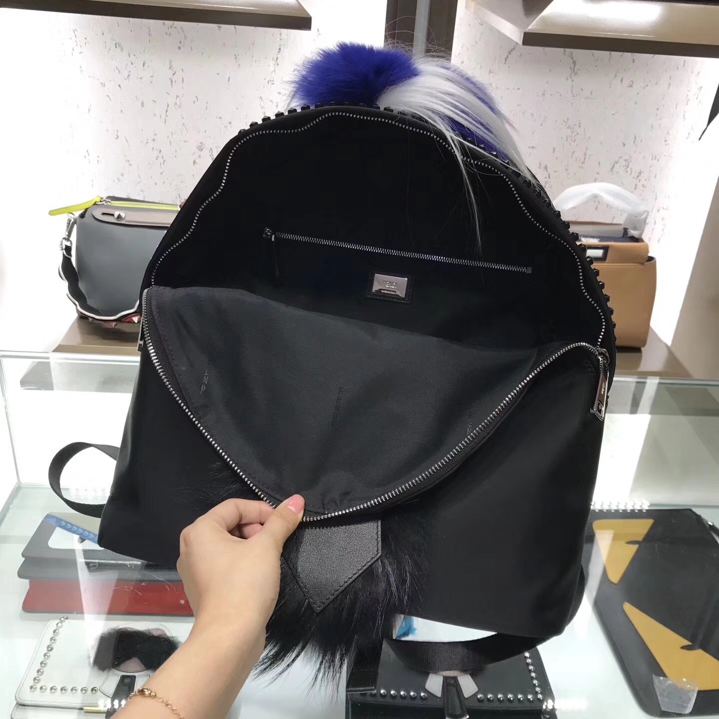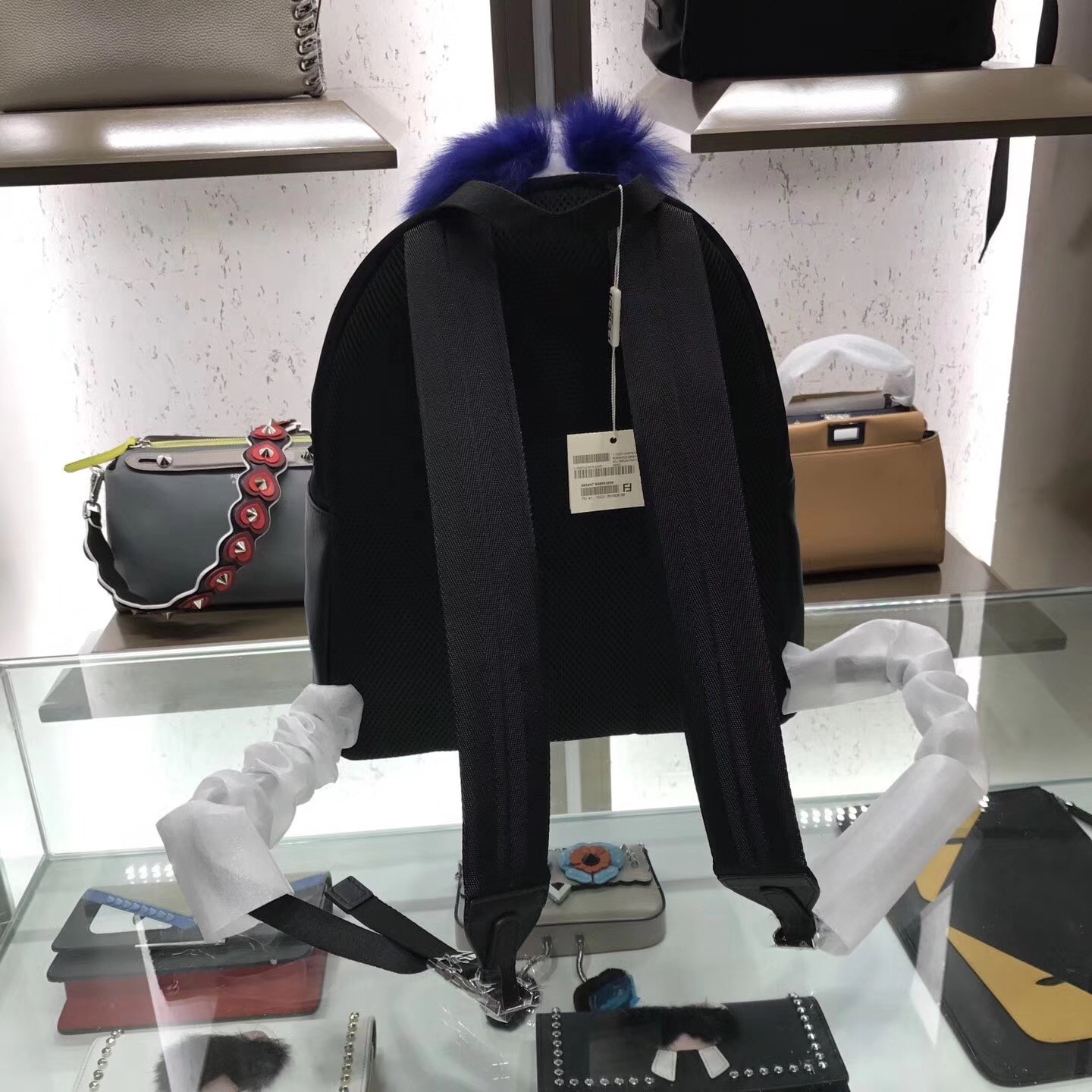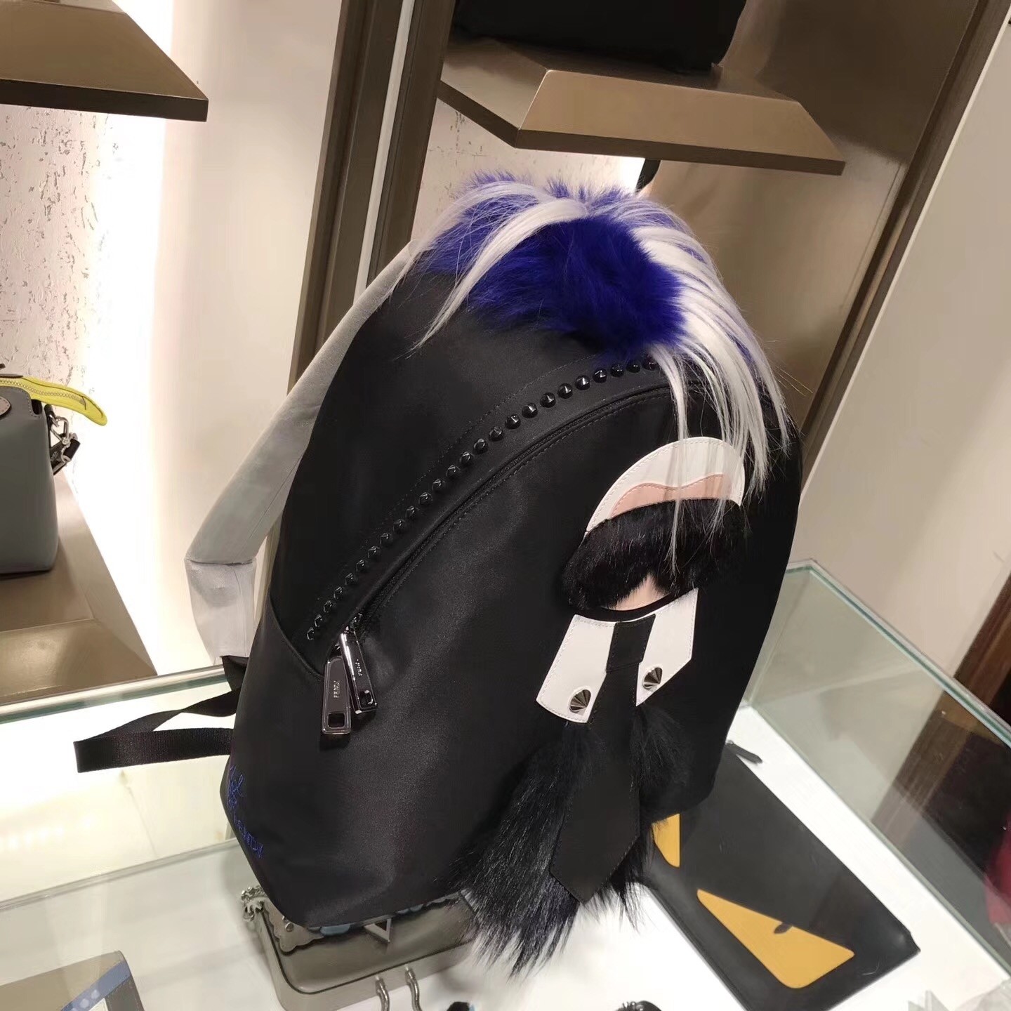 Backpack in black nylon with appliqués in leather and fur that depict Karlito. Enriched with tone-on-tone studs and a crest in white and neon blue fur. Zip pull, handle and details in black calfskin, palladium metalware. Fabric shoulder straps and technical mesh backing. Double zip fastening and interior pocket.