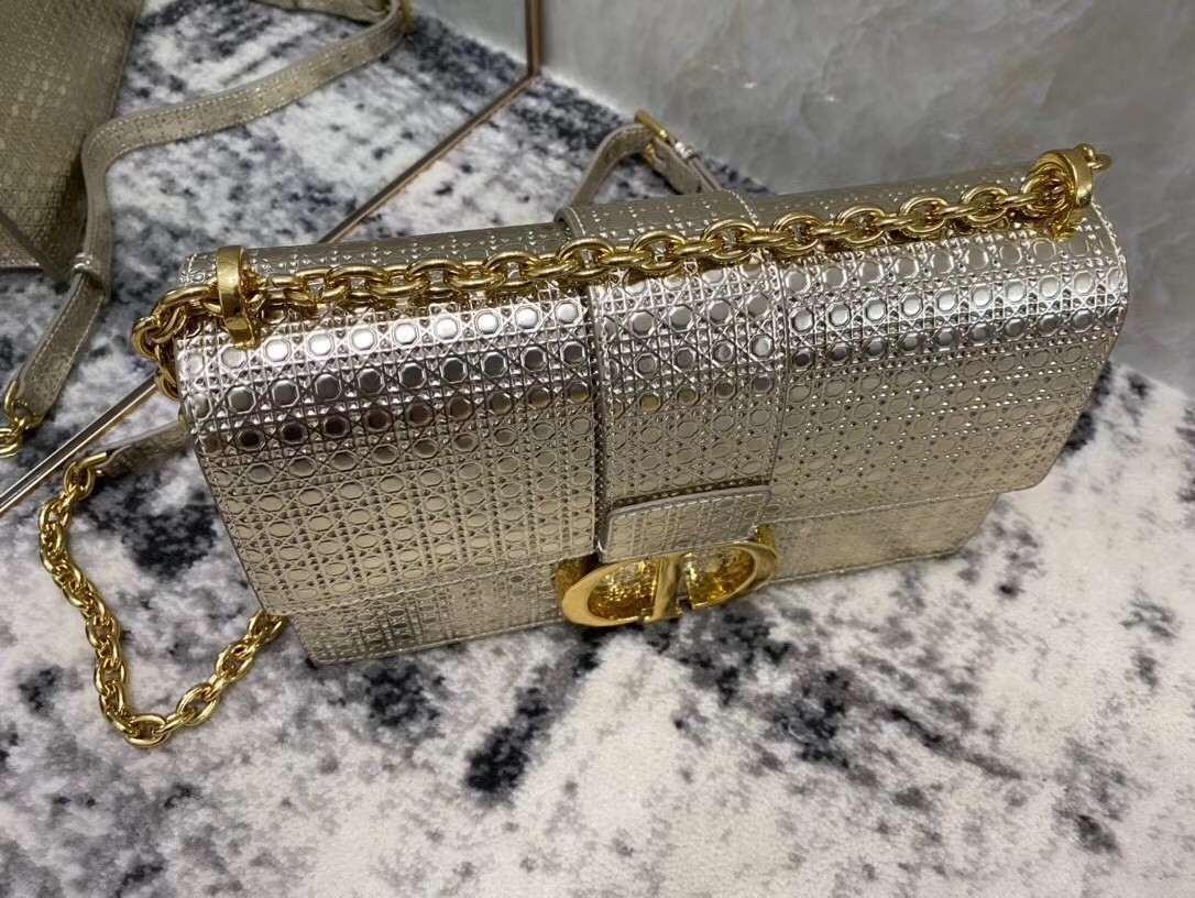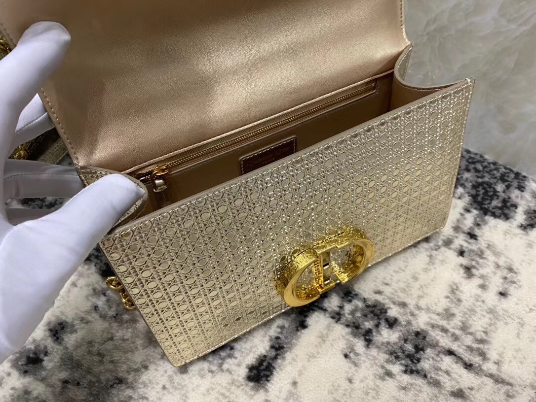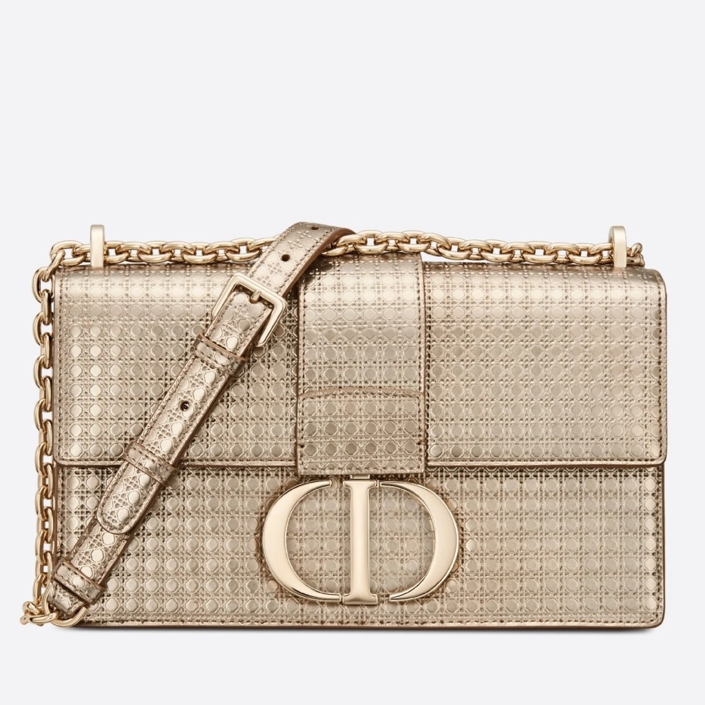 The 30 Montaigne line, inspired by the historic, emblematic address, presents essential pieces that portray the iconic codes of the House. This handbag is crafted in metallic gold calfskin imprinted with Microcannage texture for an elegant and timeless look. The flap is embellished with a pale gold-finish metal 'CD' clasp, inspired by the seal of a Christian Dior perfume bottle. Refined details such as an embossed '30 Montaigne' signature on the back highlight the sleek design.
