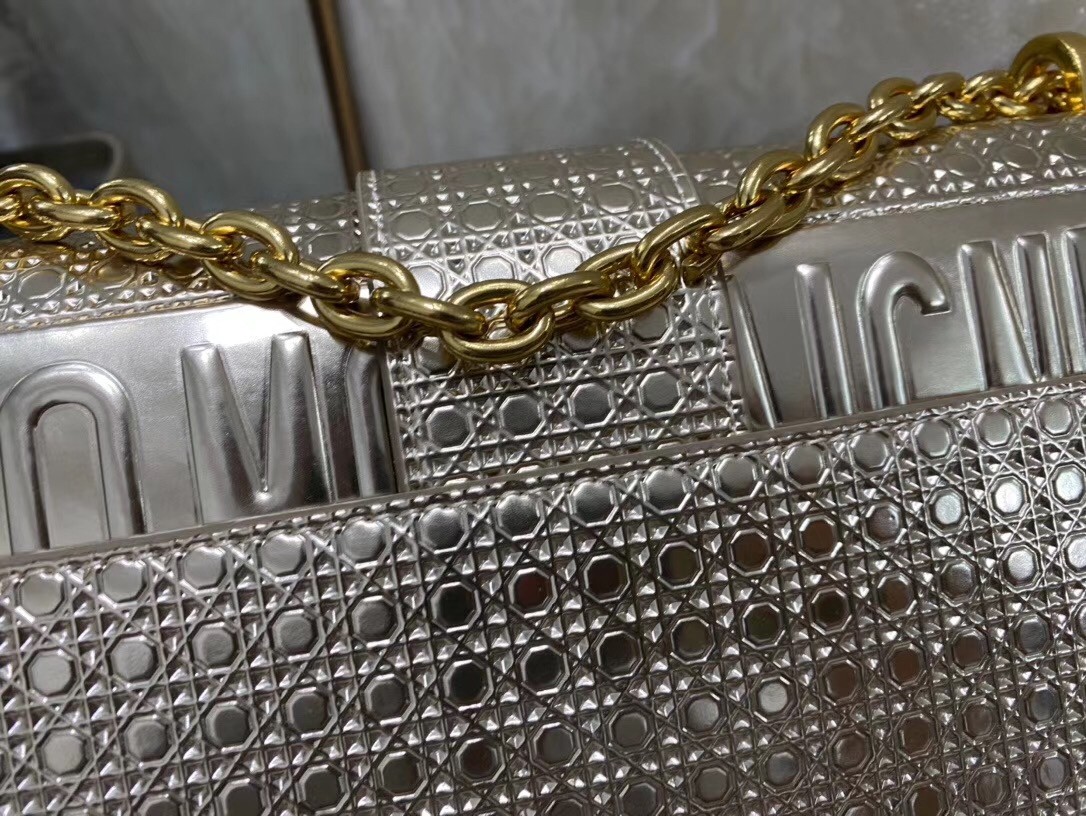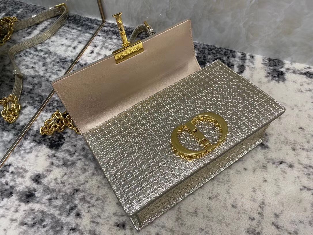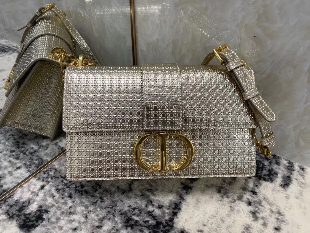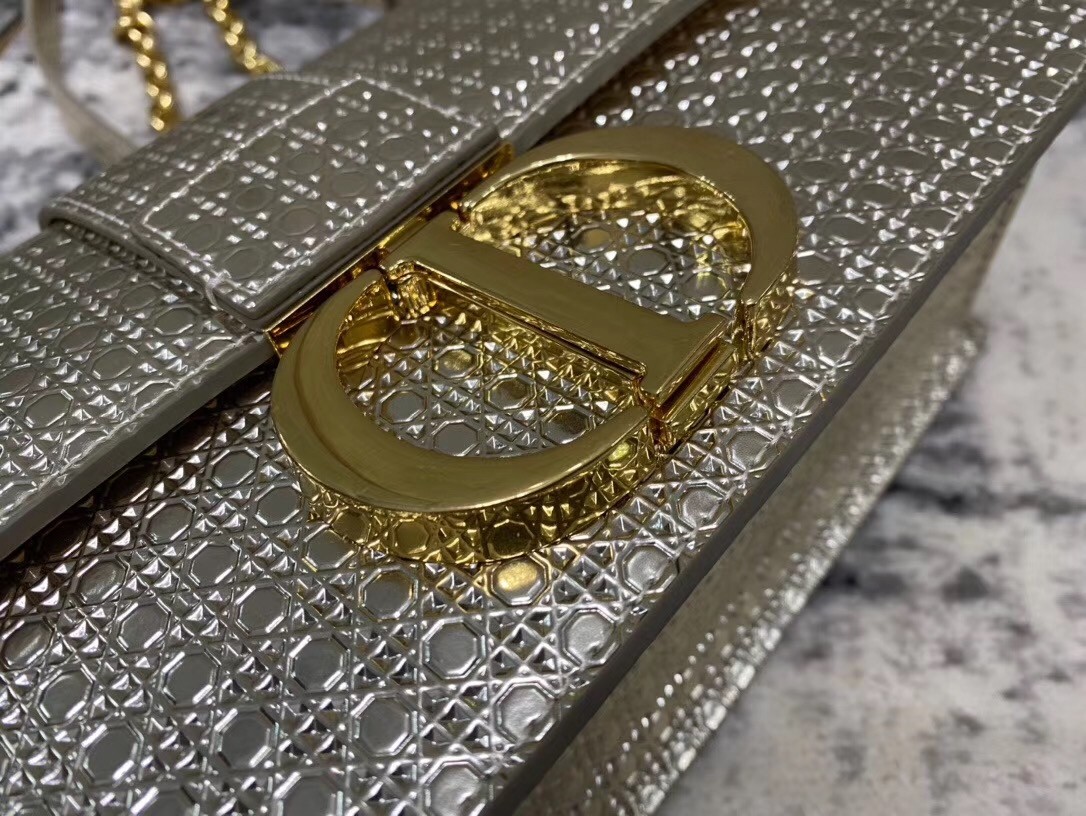 The 30 Montaigne line, inspired by the historic, emblematic address, presents essential pieces that portray the iconic codes of the House. This handbag is crafted in metallic gold calfskin imprinted with Microcannage texture for an elegant and timeless look. The flap is embellished with a pale gold-finish metal 'CD' clasp, inspired by the seal of a Christian Dior perfume bottle. Refined details such as an embossed '30 Montaigne' signature on the back highlight the sleek design.