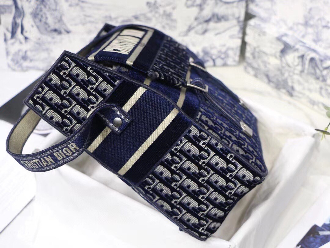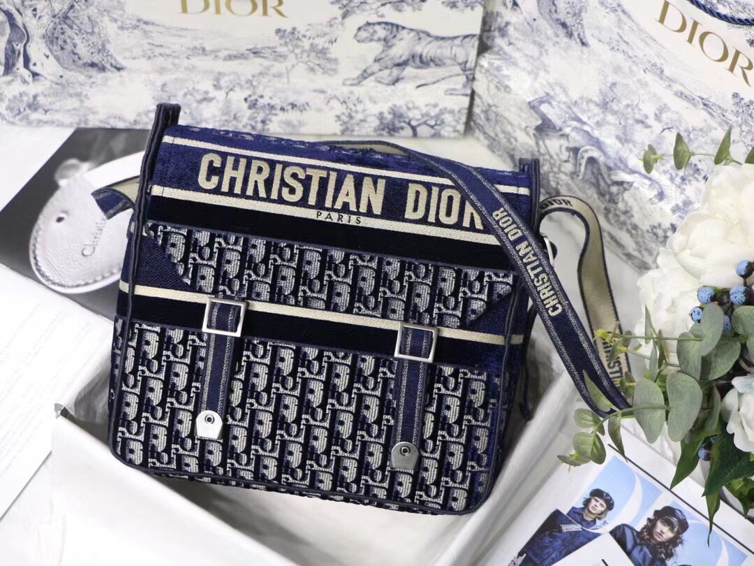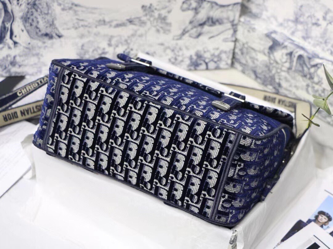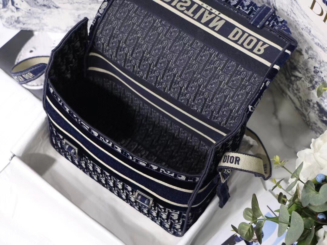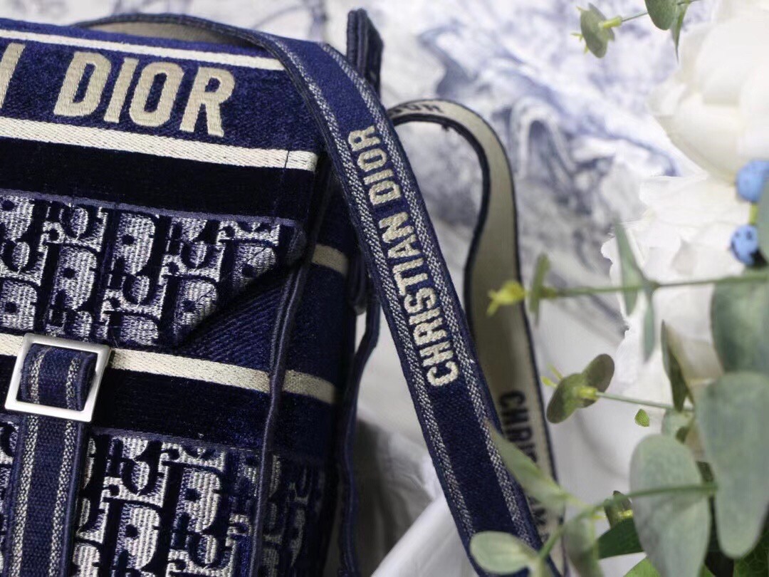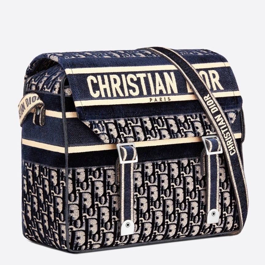 The Diorcamp bag is Maria Grazia Chiuri's update to the classic messenger bag, incorporating signature Dior elements for a relaxed yet contemporary look. The bag is crafted in blue velvet that is entirely embroidered with the Dior Oblique motif, and features the iconic 'Christian Dior' signature across the front flap. Its spacious form and ease of wear make it an effortless daily companion.