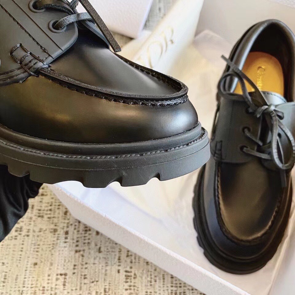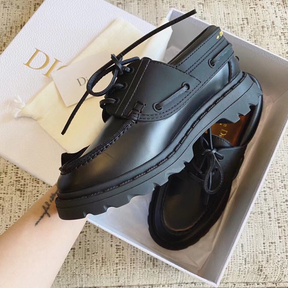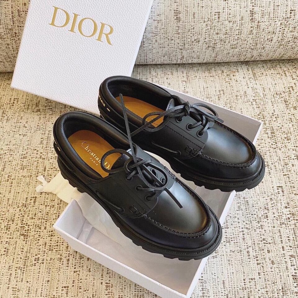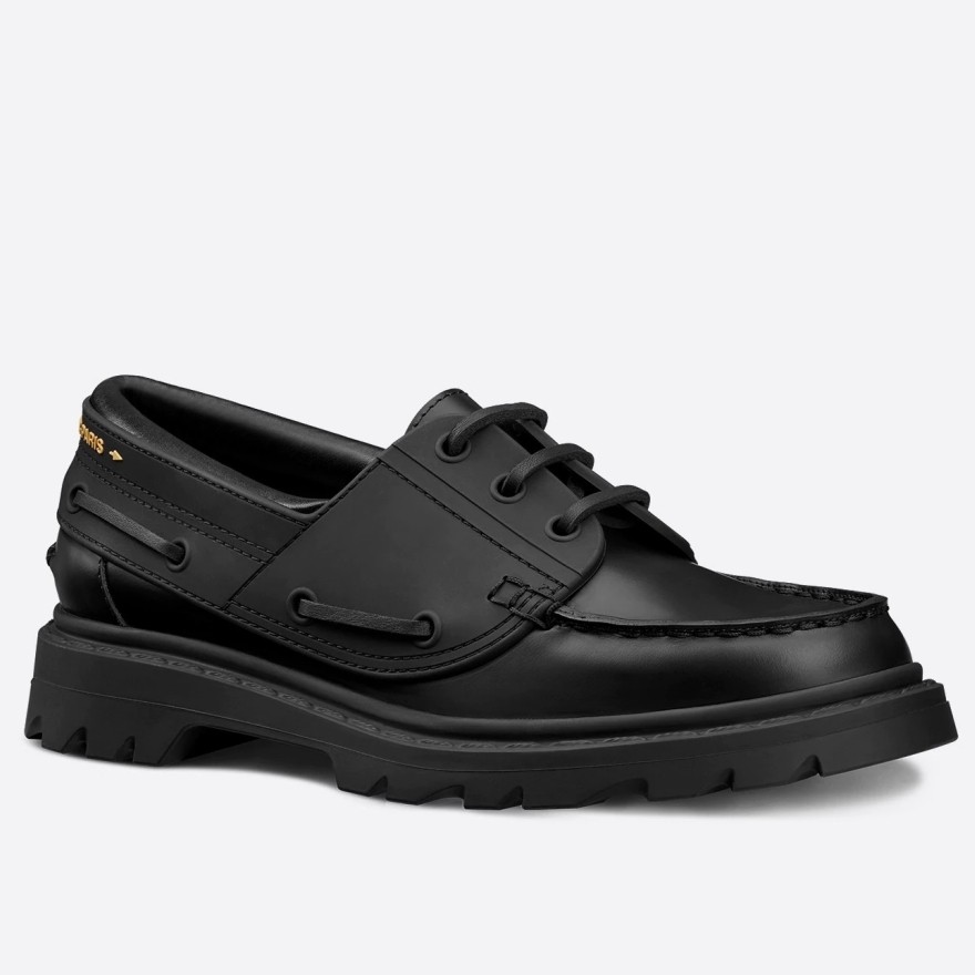 The Dior Walker style is the first boat shoe in the Dior collection by Maria Grazia Chiuri. The design's classic boat shoe is crafted using hand-sewn topstitching on black calfskin, effortlessly complemented by its rubber pieces and crimped sole. A debossed 'Christian Dior' signature on the back completes this style.