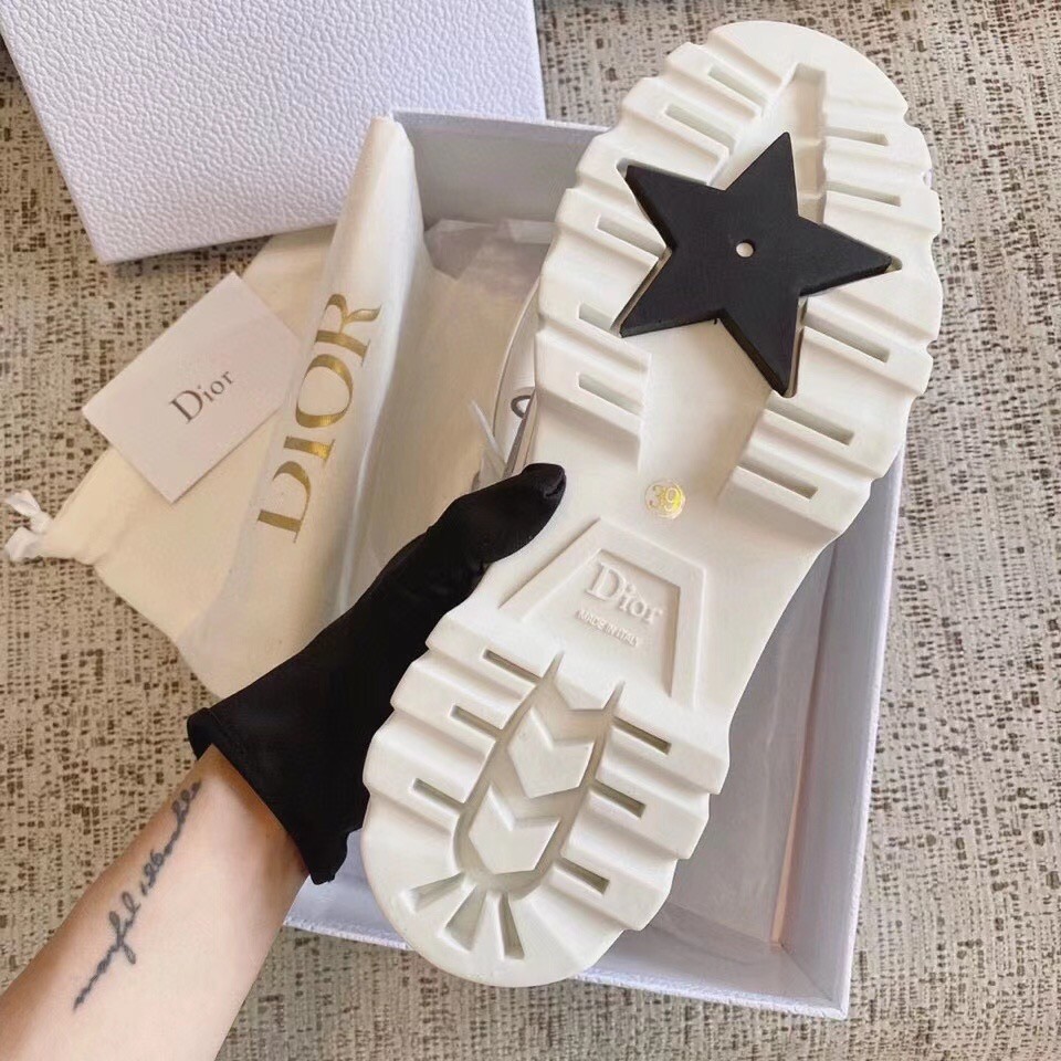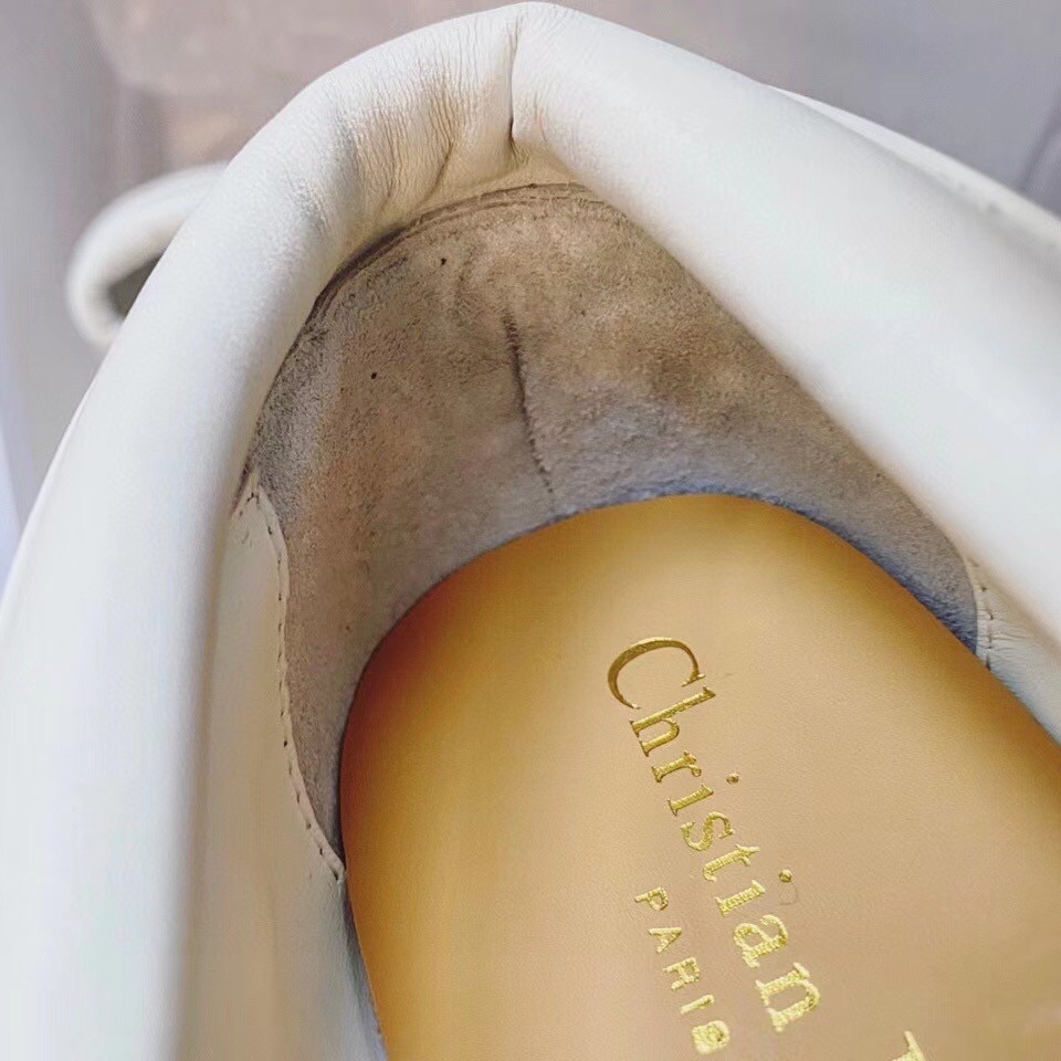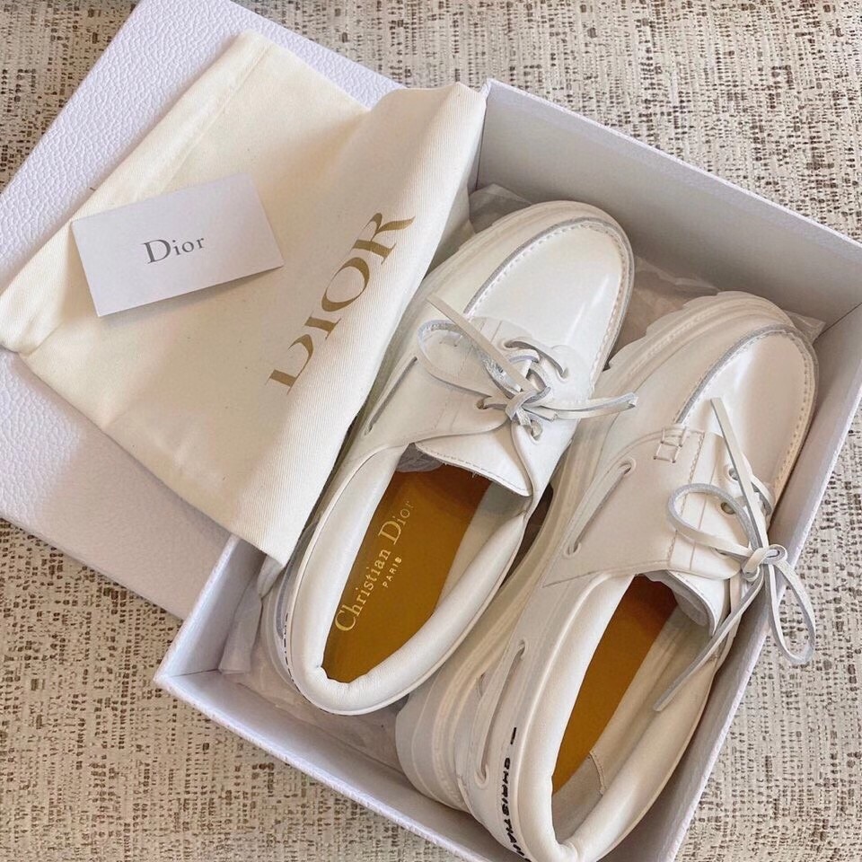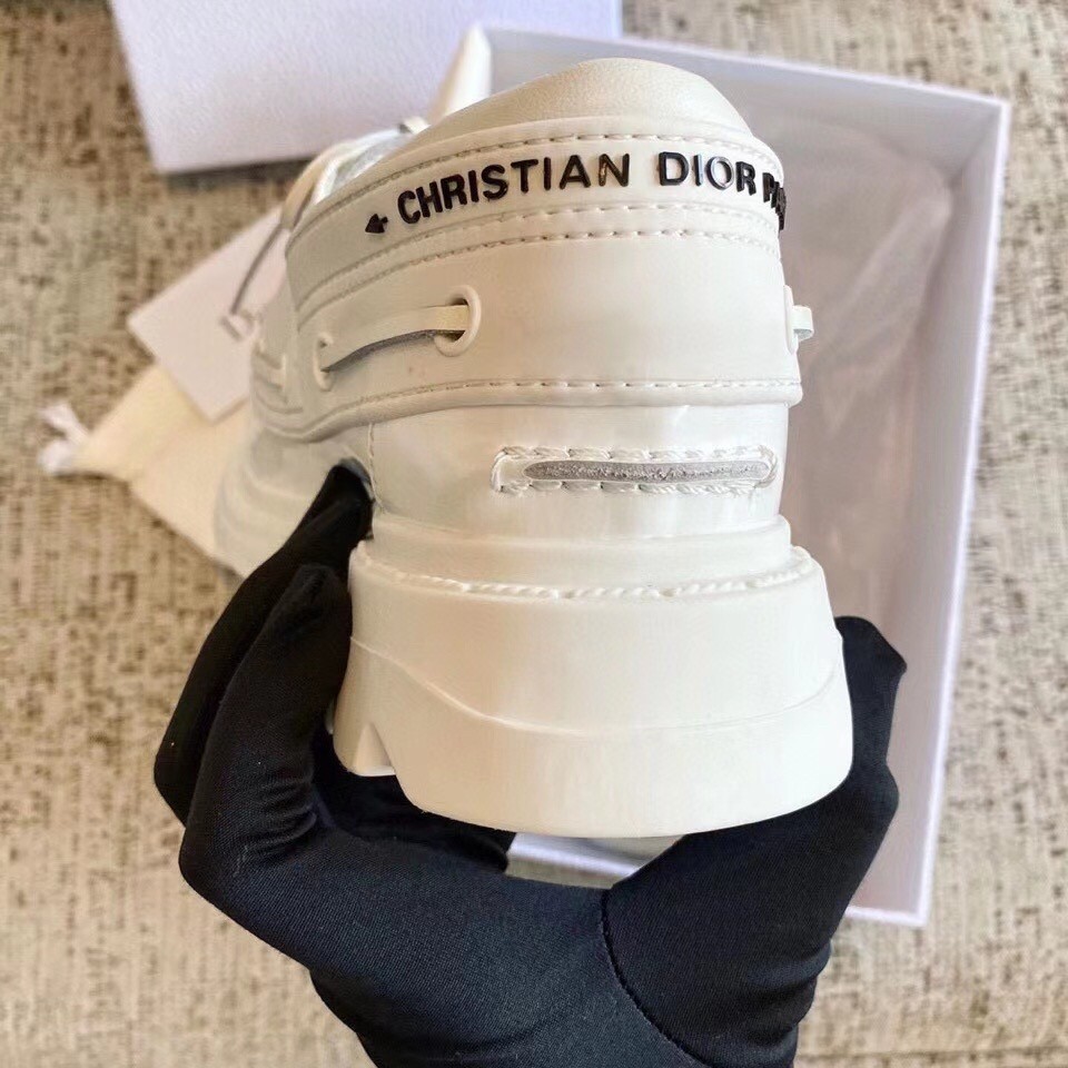 The Dior Walker style is the first boat shoe in the Dior collection by Maria Grazia Chiuri. The design's classic boat shoe is crafted using hand-sewn topstitching on off-white calfskin, effortlessly complemented by its rubber pieces and crimped sole. A debossed 'Christian Dior' signature on the back completes this style.