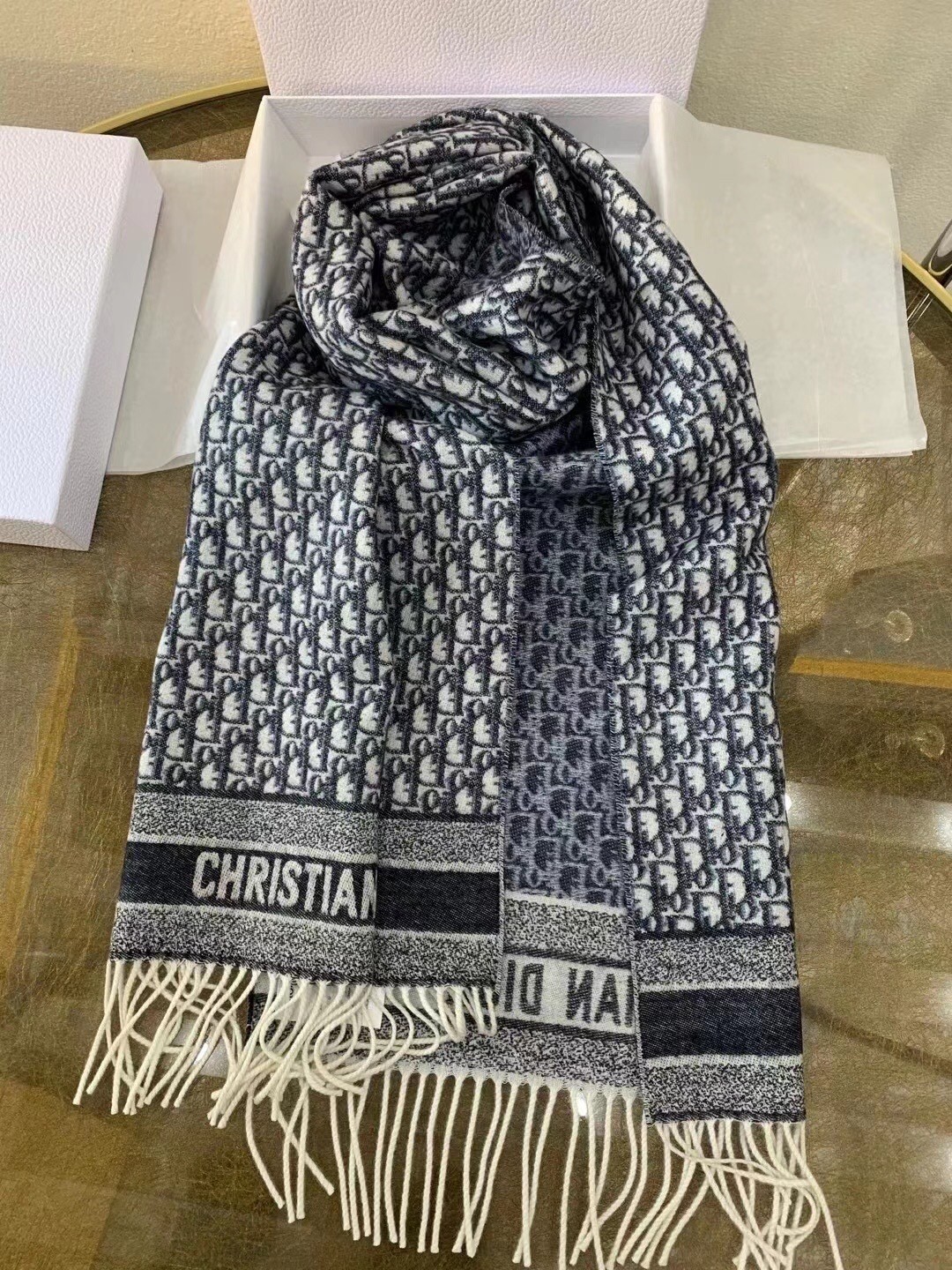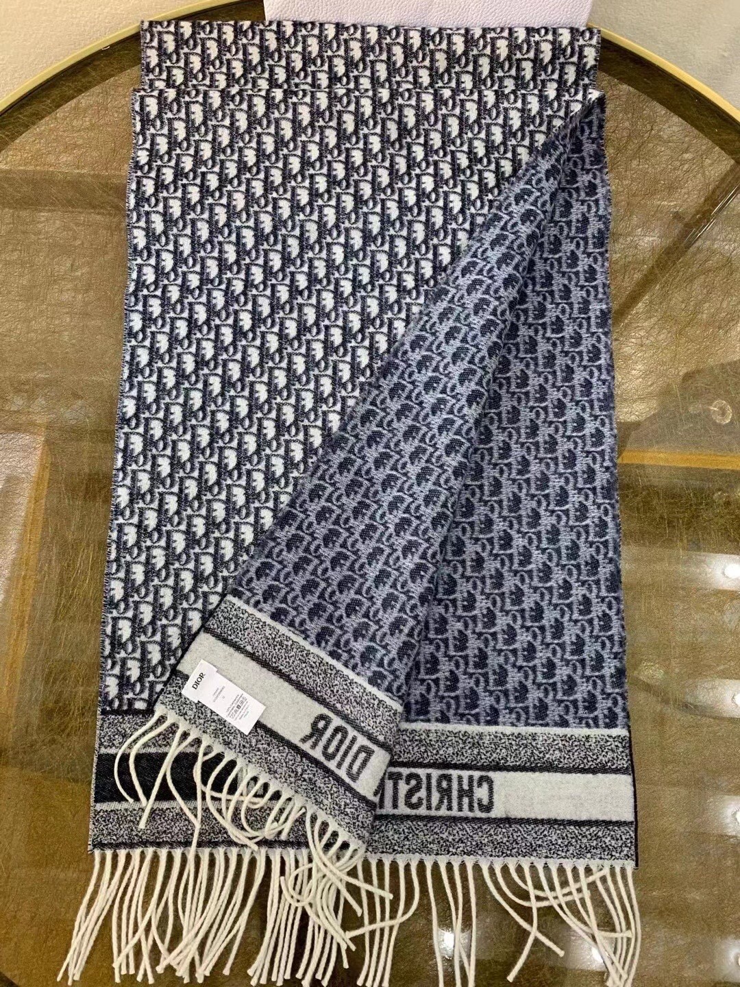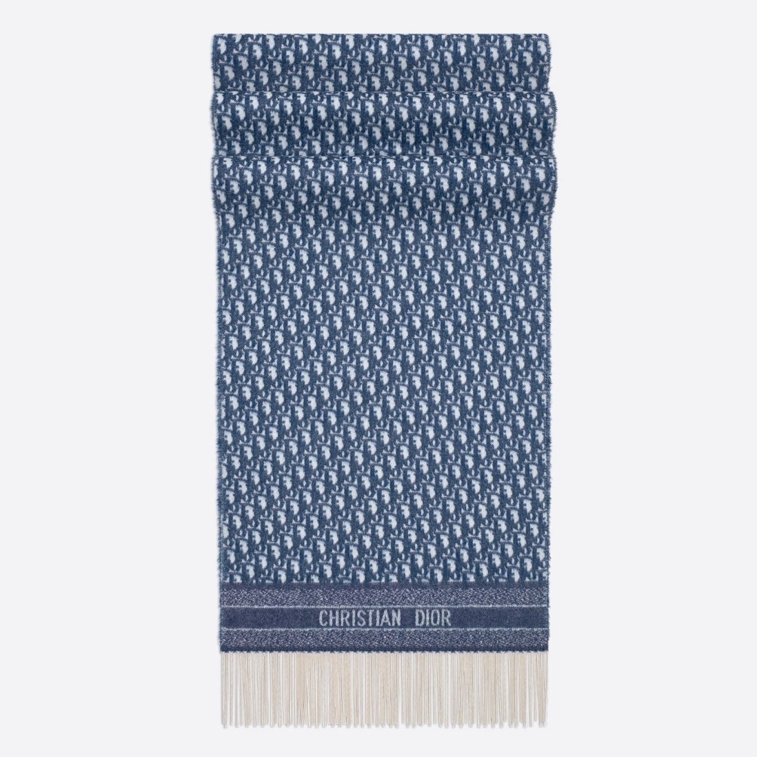 The blue cashmere scarf is enhanced by the Dior Oblique motif, designed in 1967. Practical and refined, it is enhanced by contrasting fringed edges, highlighting the 'Christian Dior' signature in capital letters. The scarf may be tied around the neck and pairs with any look.