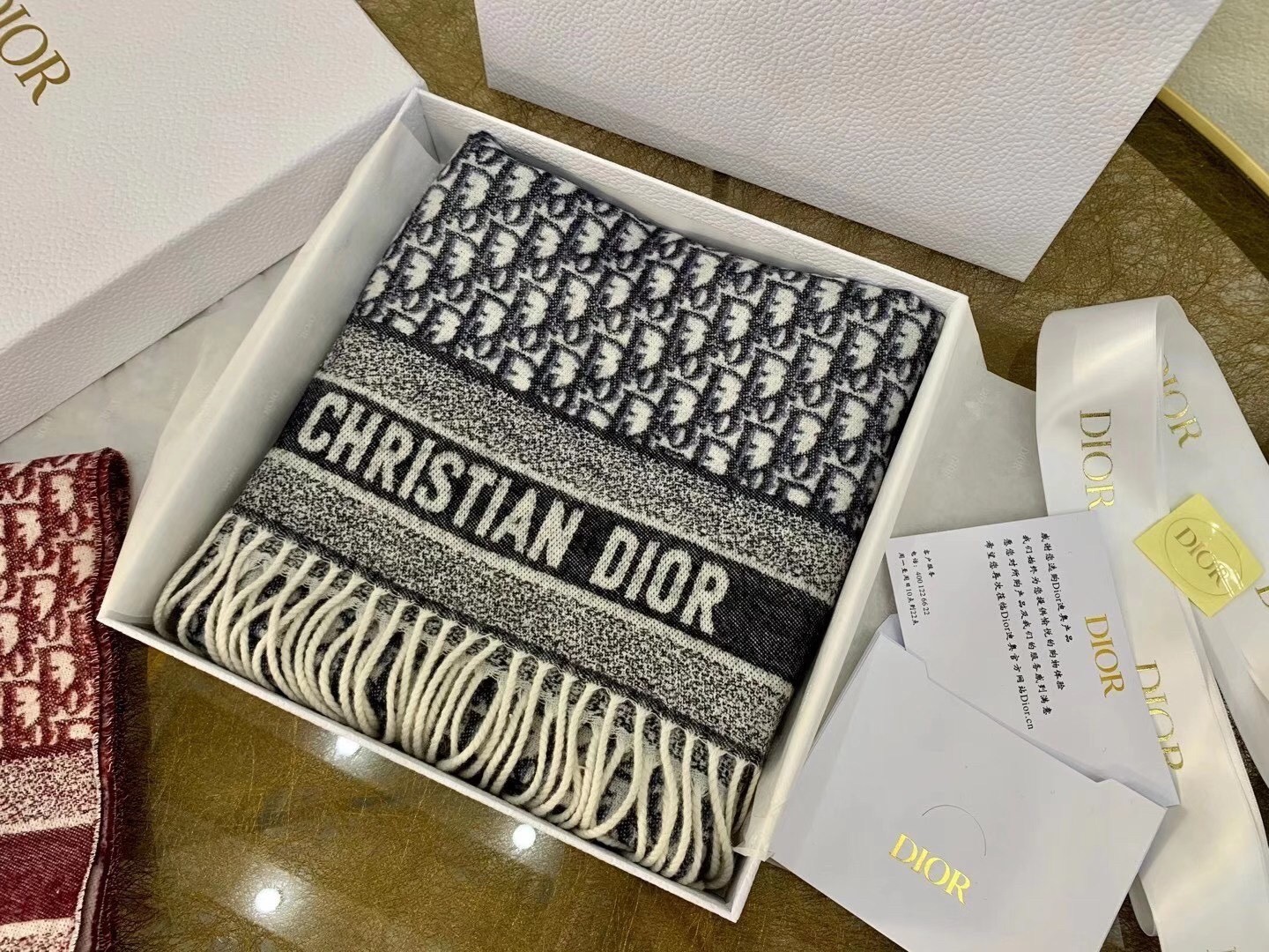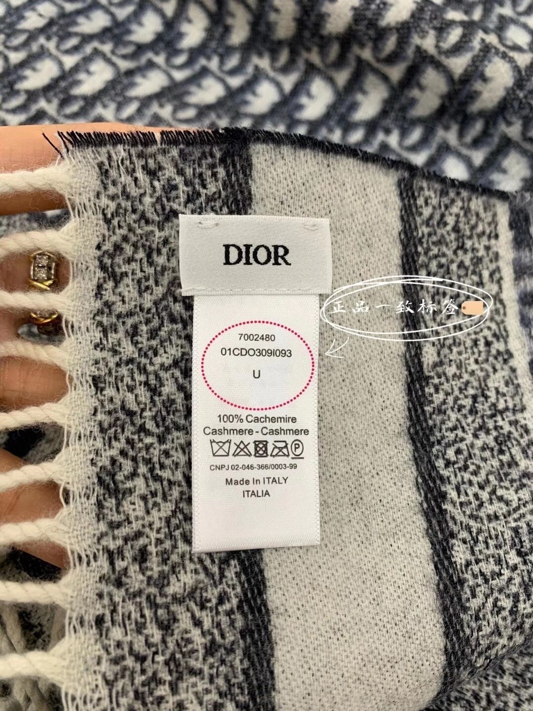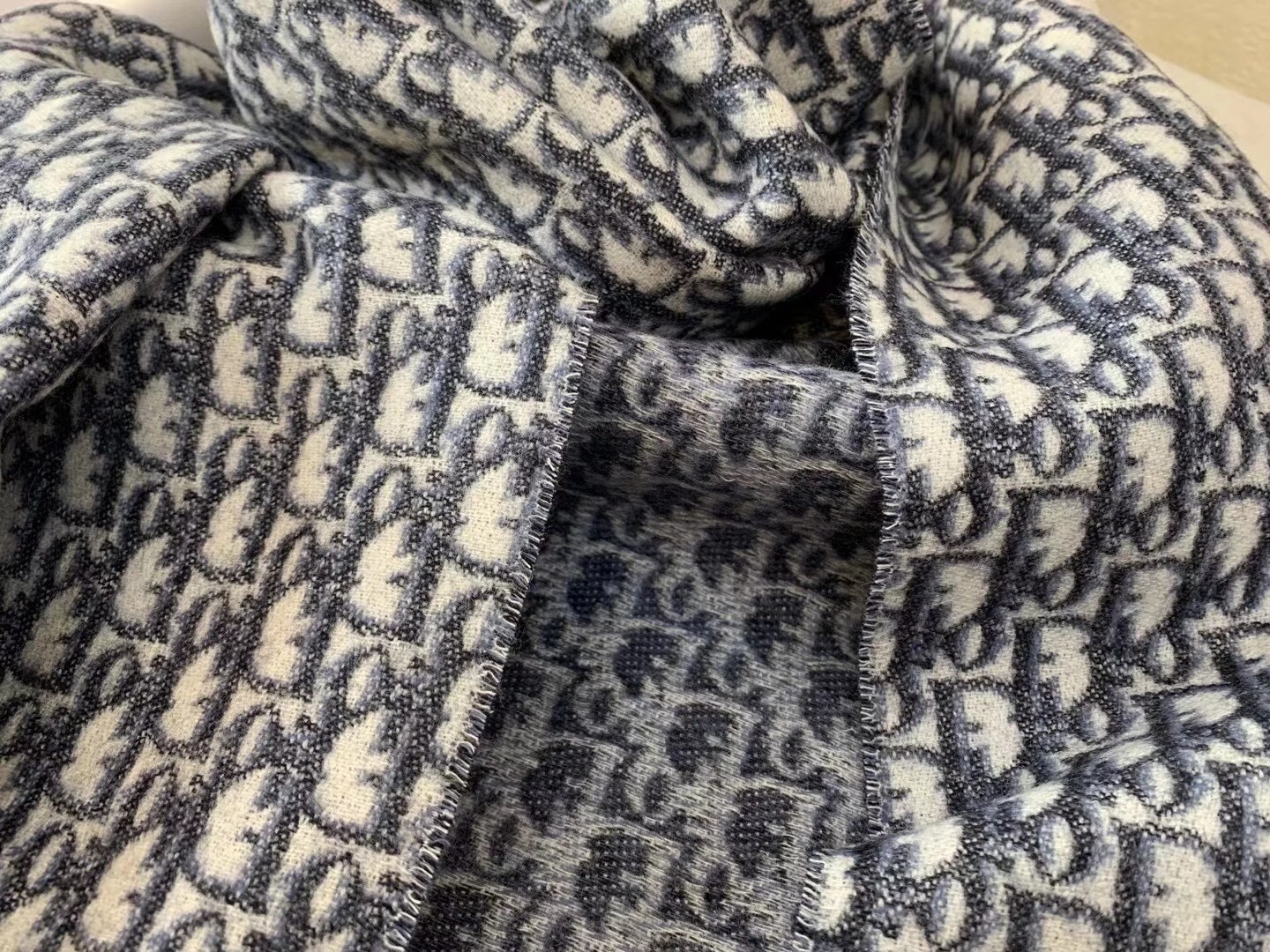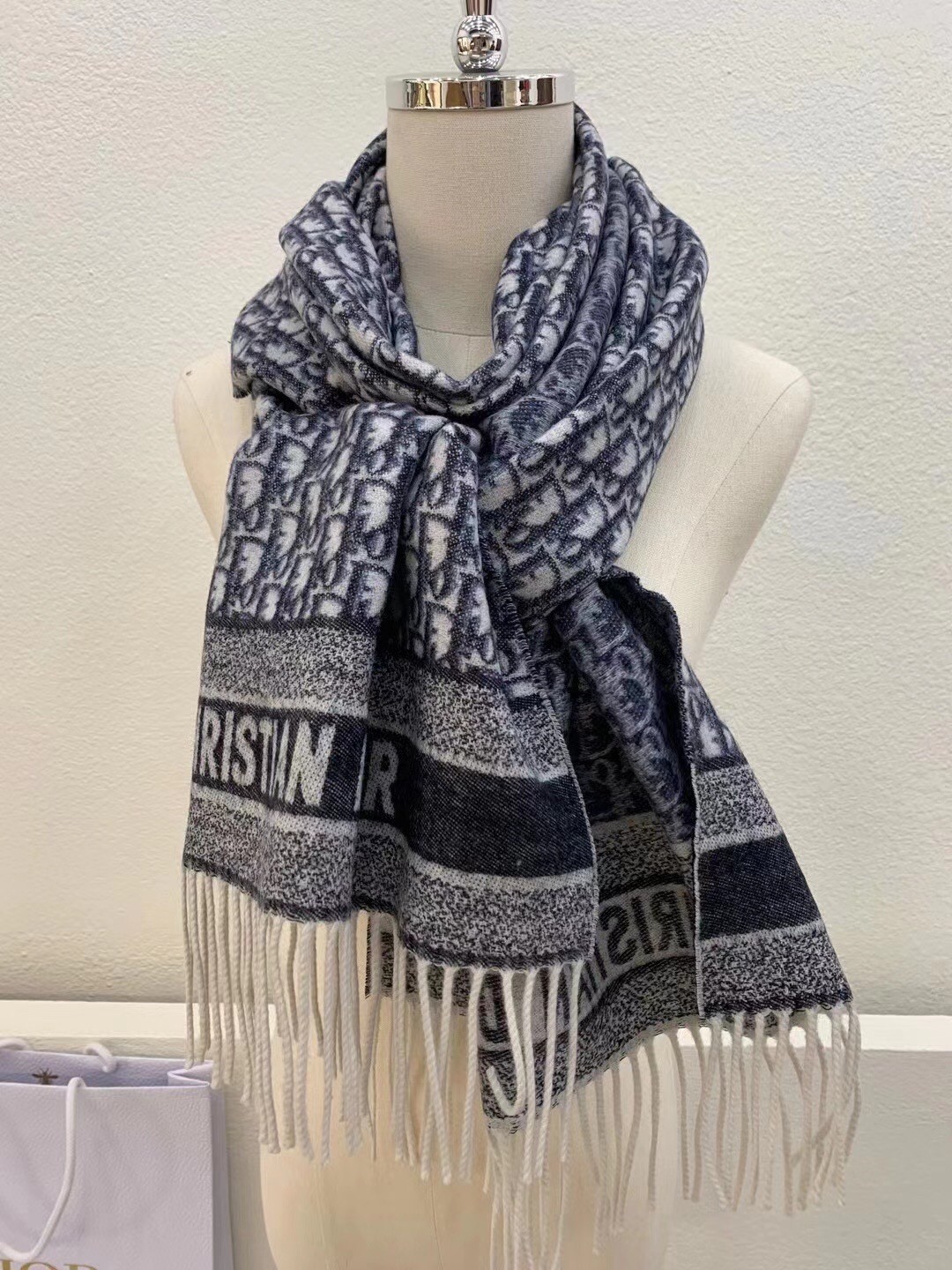 The blue cashmere scarf is enhanced by the Dior Oblique motif, designed in 1967. Practical and refined, it is enhanced by contrasting fringed edges, highlighting the 'Christian Dior' signature in capital letters. The scarf may be tied around the neck and pairs with any look.