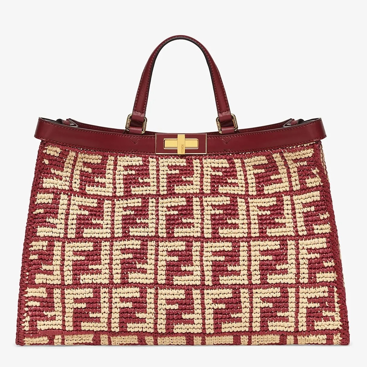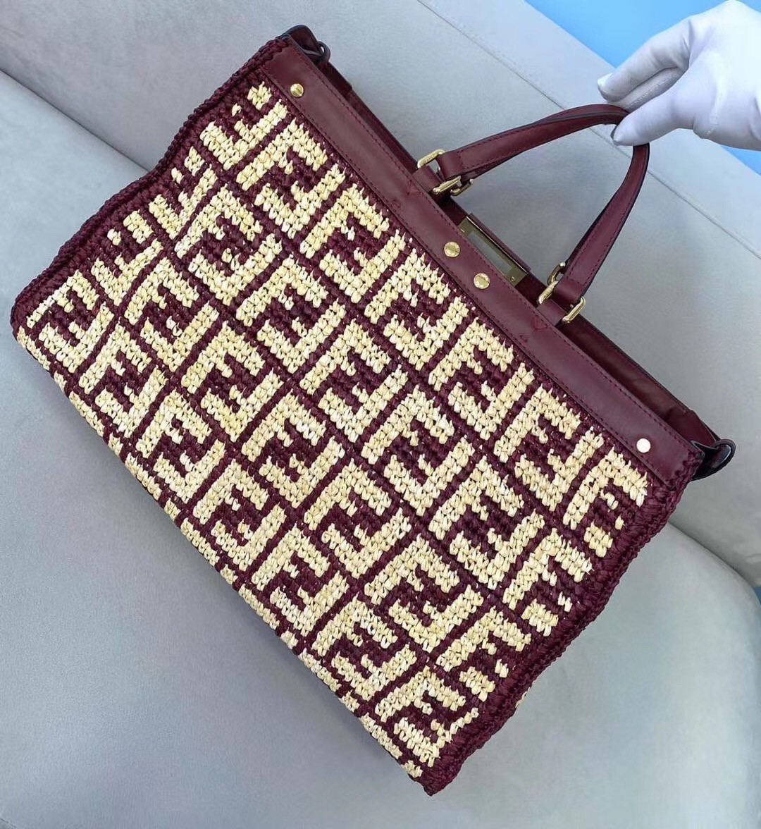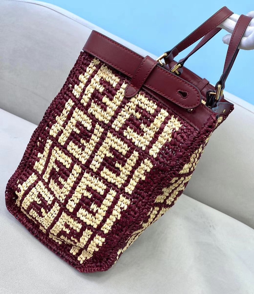 Large Peekaboo X-tote bag, made of raffia with beige FF motif on a burgundy background, finished with burgundy leather edges and decorated with the classic twist lock. Featuring an unlined internal compartment, a large inner pocket and gold-finish metalware. Can be carried by hand thanks to two short handles and over the shoulder with the two long handles that fold into the bag.