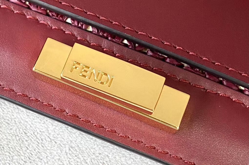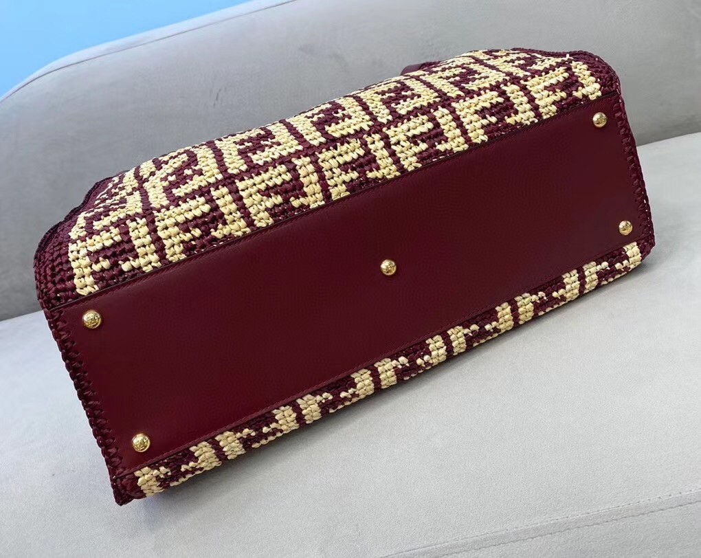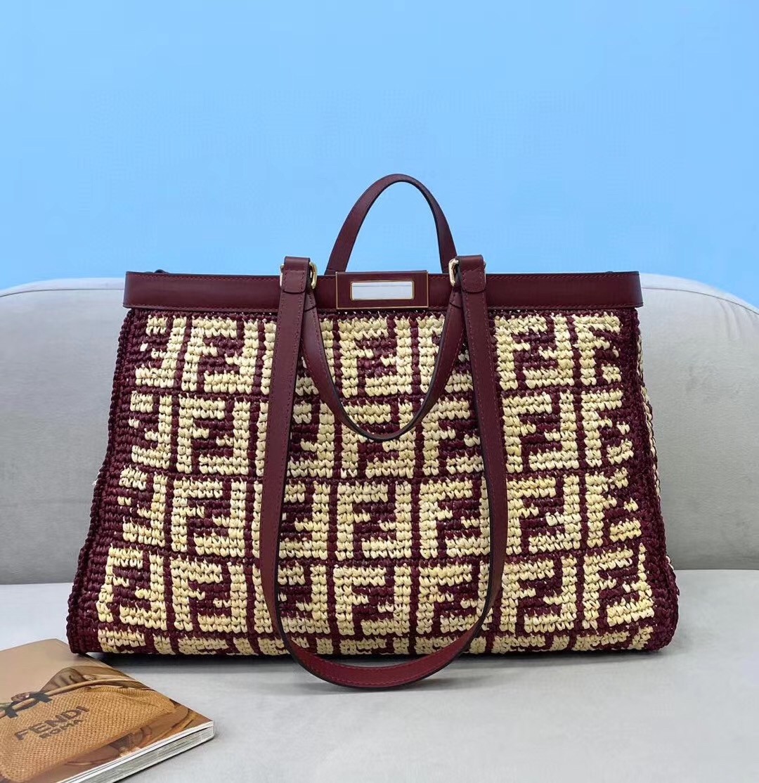 Large Peekaboo X-tote bag, made of raffia with beige FF motif on a burgundy background, finished with burgundy leather edges and decorated with the classic twist lock. Featuring an unlined internal compartment, a large inner pocket and gold-finish metalware. Can be carried by hand thanks to two short handles and over the shoulder with the two long handles that fold into the bag.