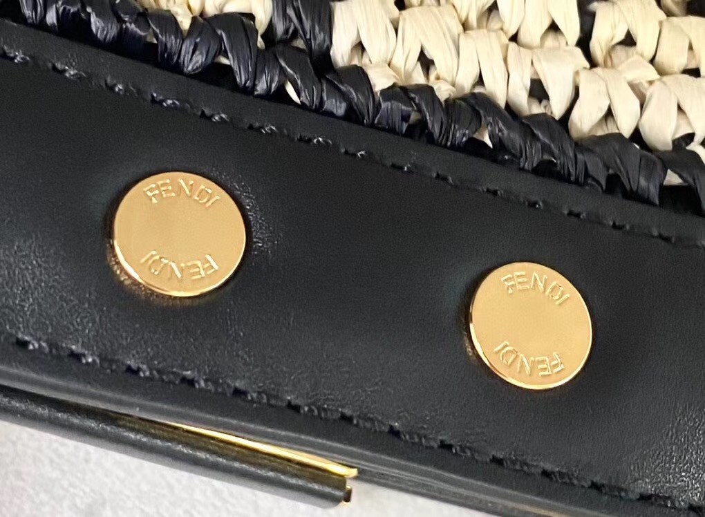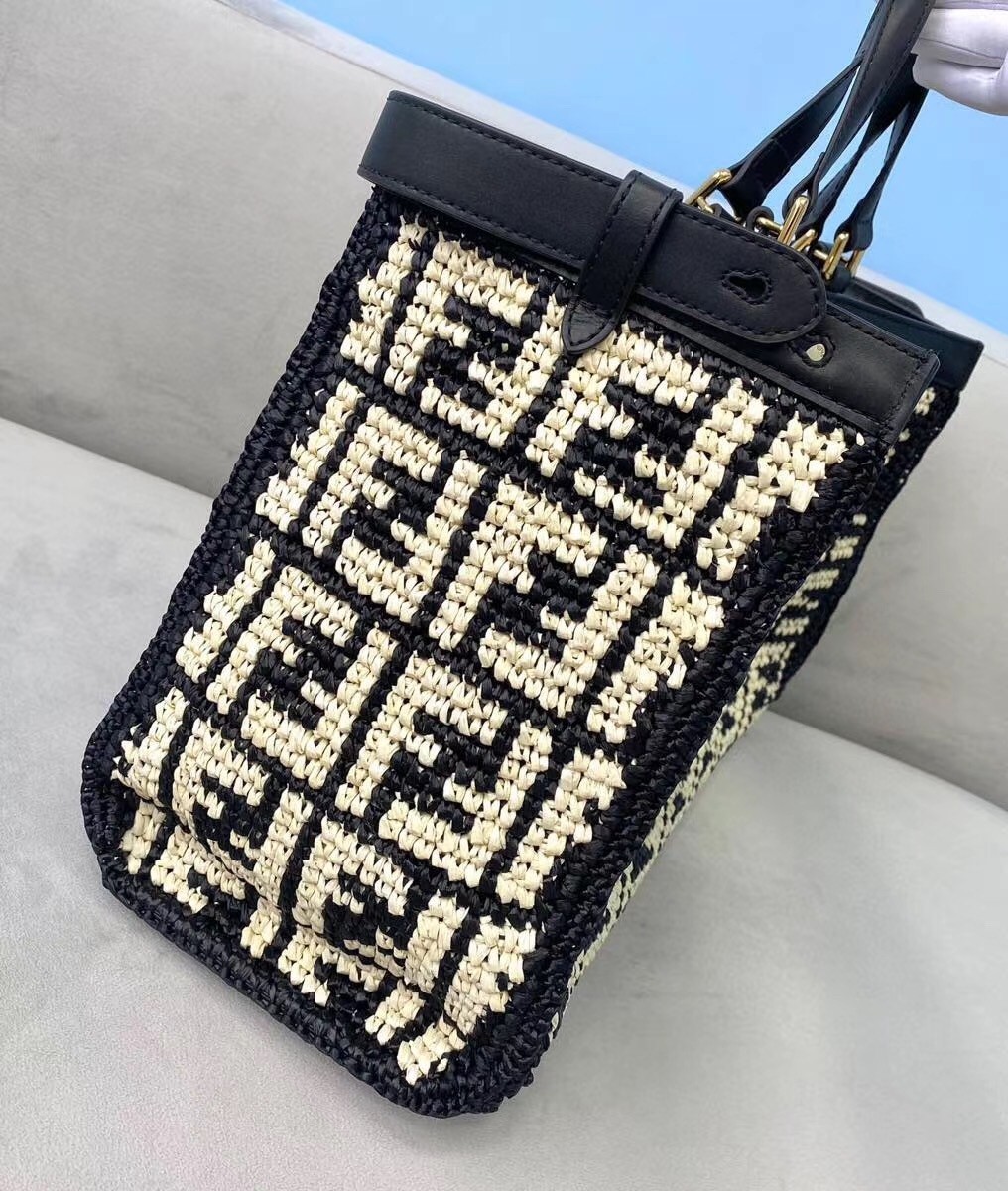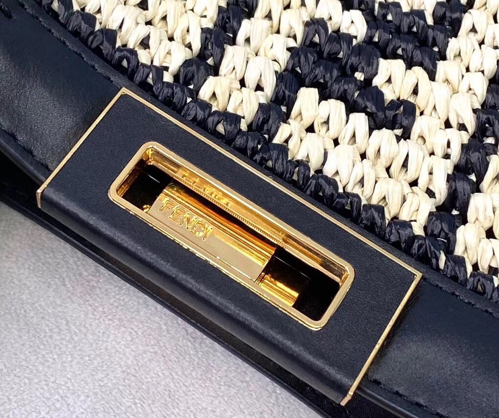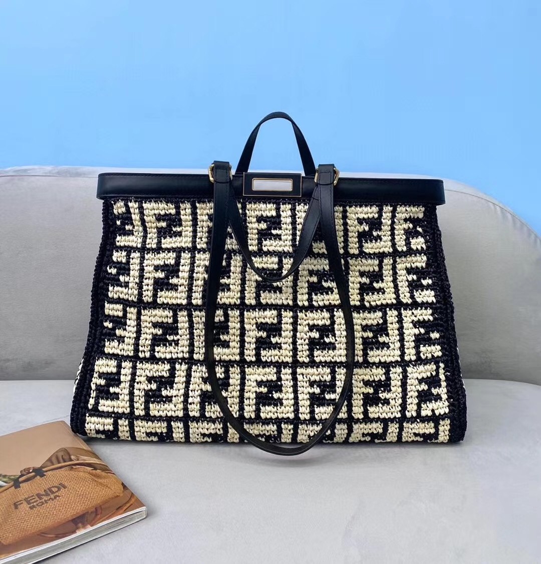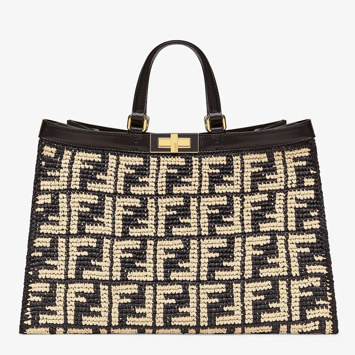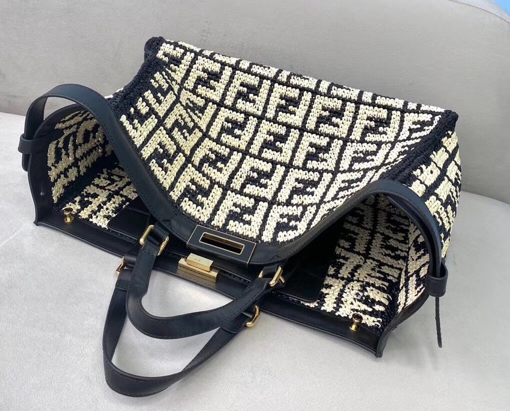 Large Peekaboo X-tote bag, made of raffia with beige FF motif on a black background, finished with burgundy leather edges and decorated with the classic twist lock. Featuring an unlined internal compartment, a large inner pocket and gold-finish metalware. Can be carried by hand thanks to two short handles and over the shoulder with the two long handles that fold into the bag.