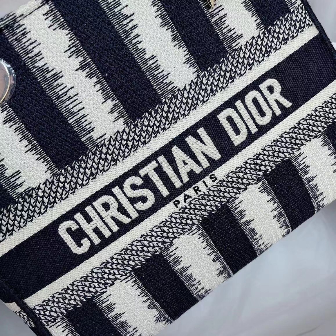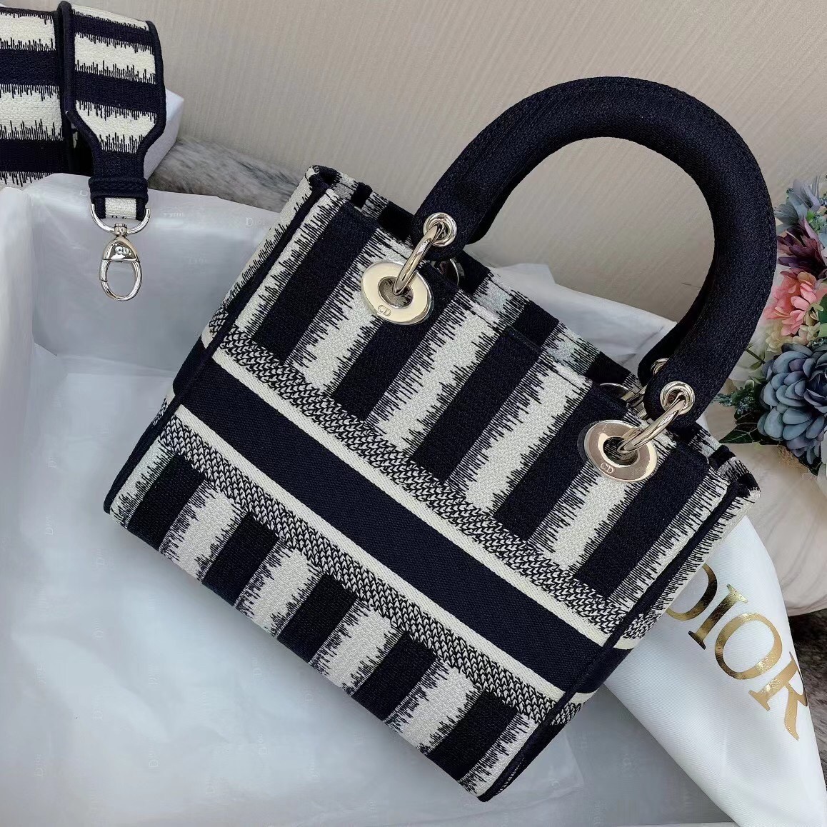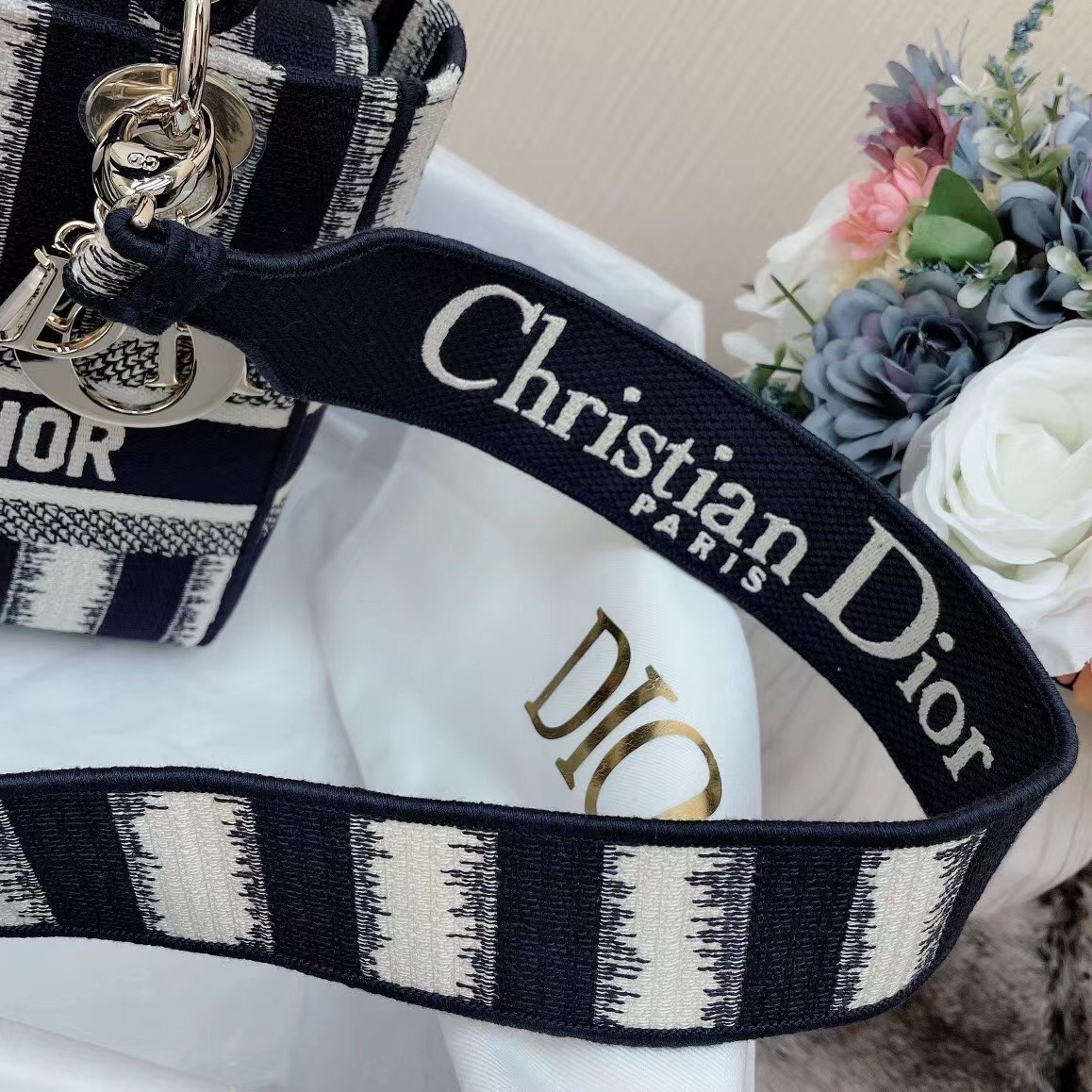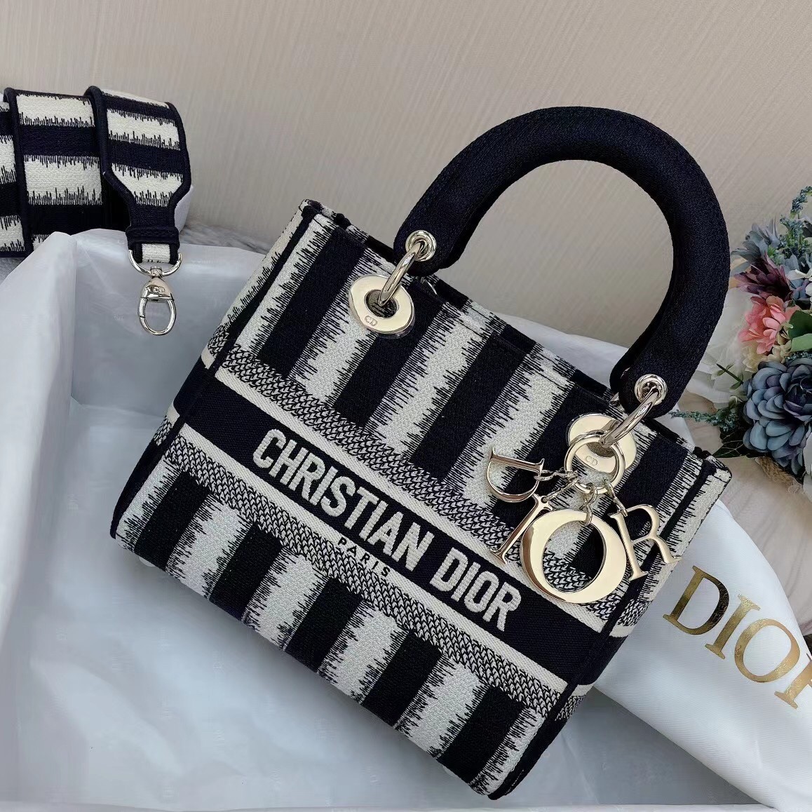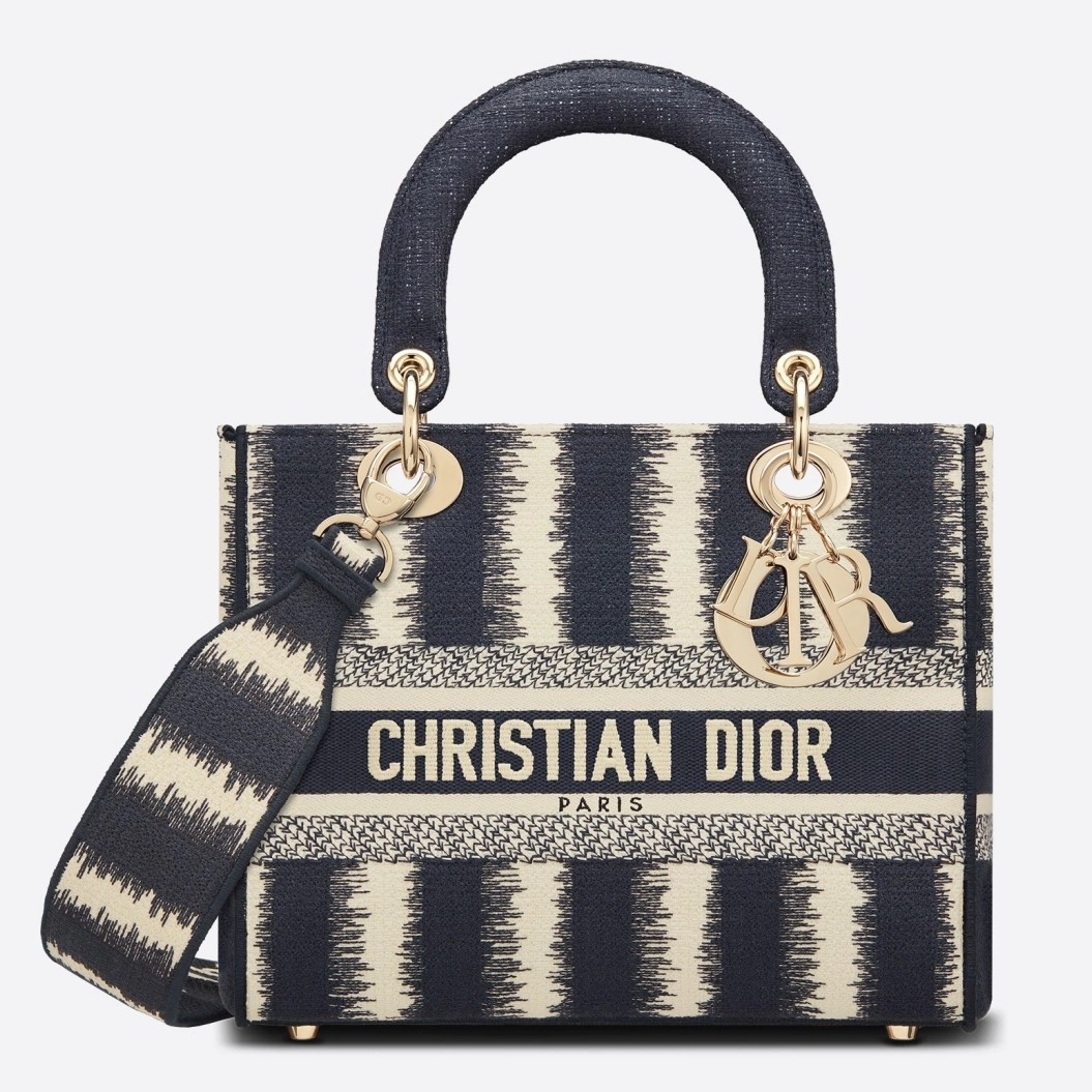 The Lady D-Lite bag combines classic elegance with House modernity. The design offers a new take on the bayadère motif, with a modern variation fully embroidered with the blue heathered-effect D-Stripes motif. The front boasts a 'Christian Dior' signature while the thick 'D.I.O.R.' charms in pale gold-finish metal embellish the style with a graphic touch. Equipped with a wide, reversible, and removable embroidered shoulder strap, the medium Lady D-Lite bag can be carried by hand, worn over the shoulder or crossbody