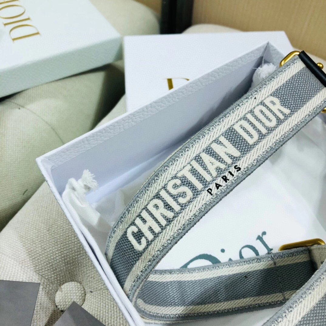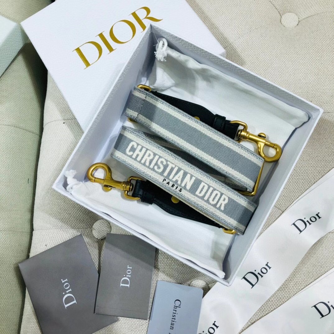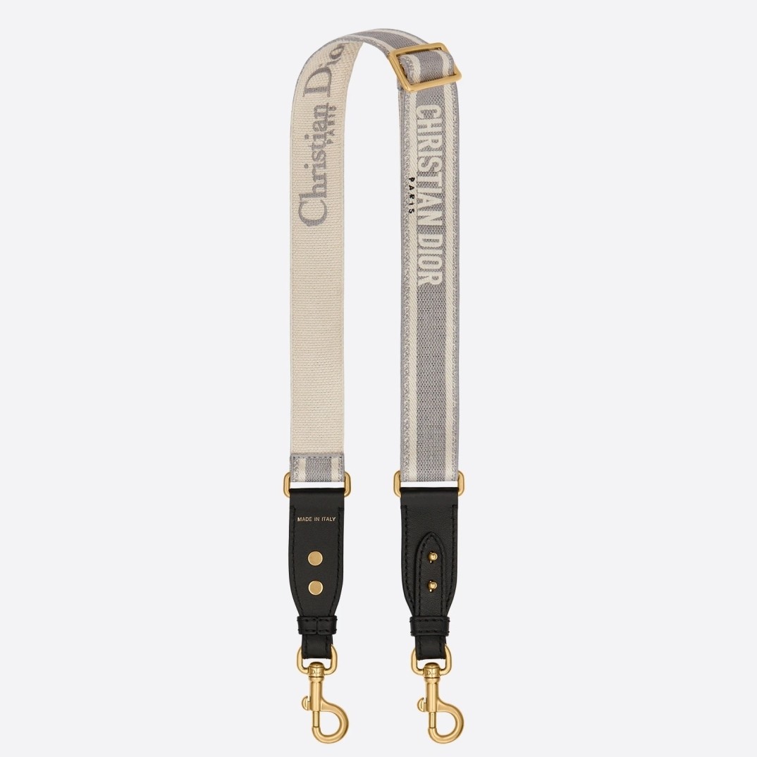 The gray embroidered shoulder strap is a unique accessory that allows the customization of certain House bags. The 'Christian Dior' signature is featured at the center of the slender shape, framed by black calfskin on either side. Two antique gold-finish metal snap hooks attach the strap to the bag of choice. The adjustable strap may be worn over the shoulder or crossbody for a highly personalized style.
