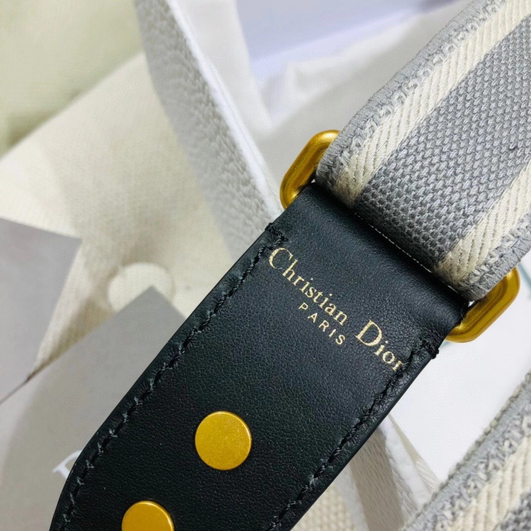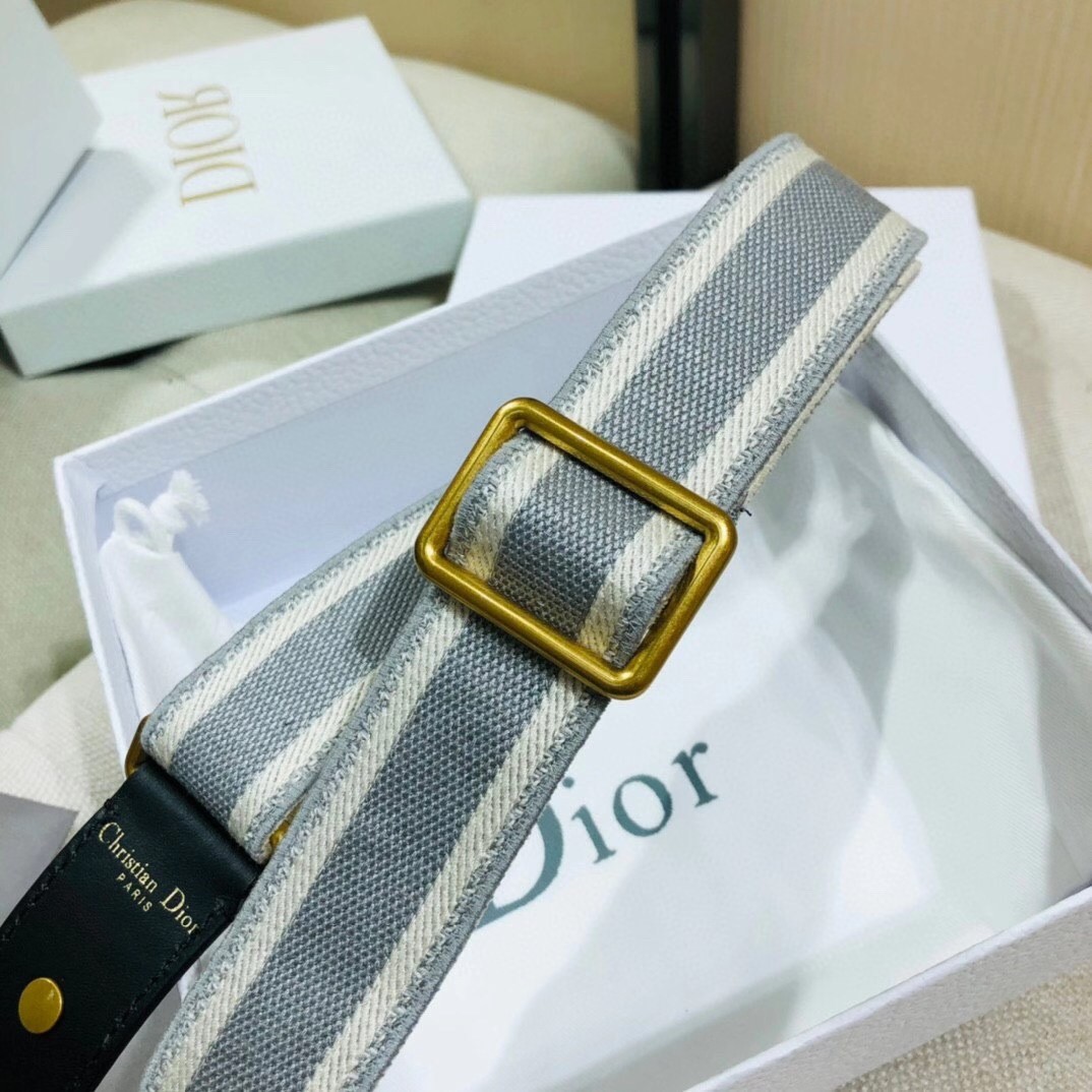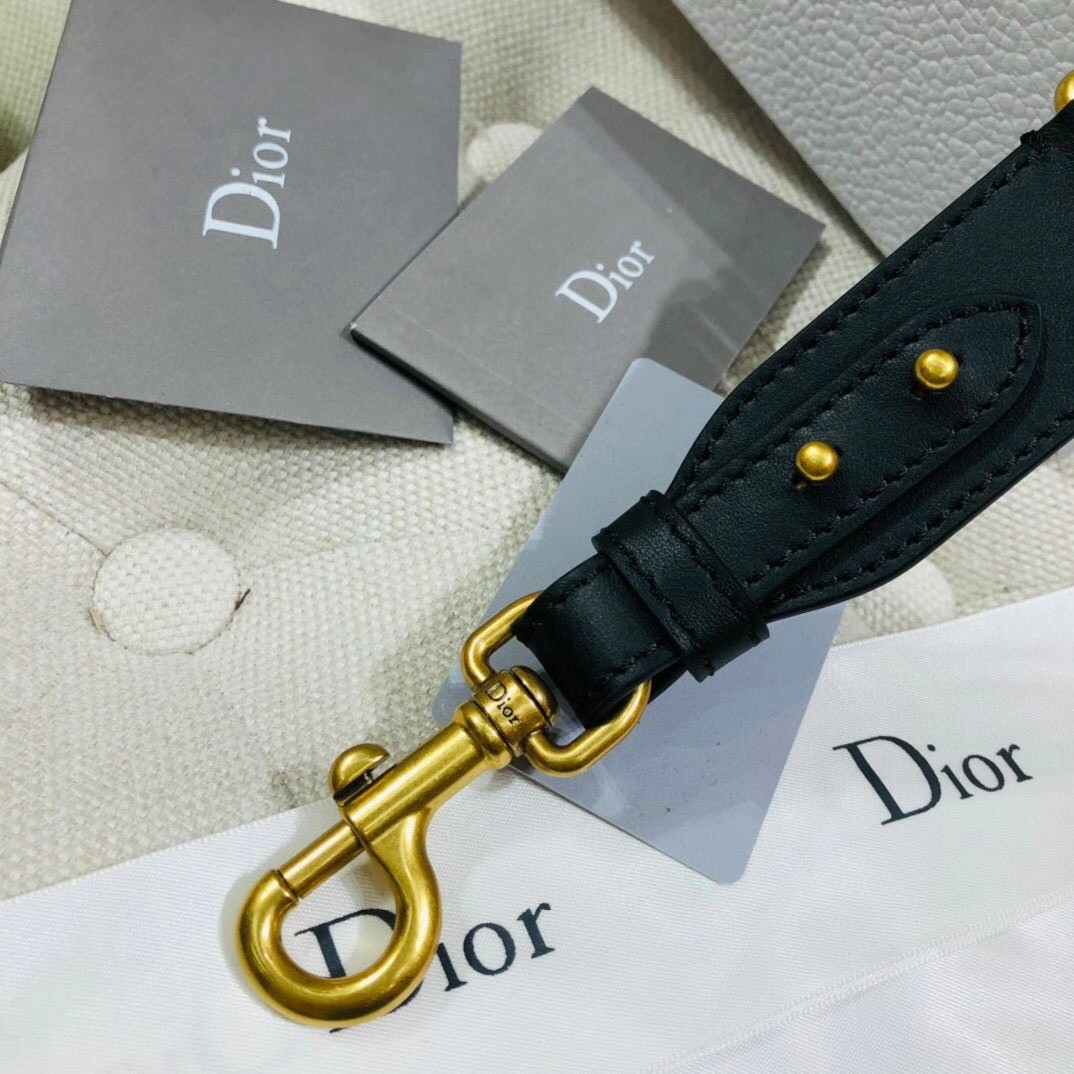 The gray embroidered shoulder strap is a unique accessory that allows the customization of certain House bags. The 'Christian Dior' signature is featured at the center of the slender shape, framed by black calfskin on either side. Two antique gold-finish metal snap hooks attach the strap to the bag of choice. The adjustable strap may be worn over the shoulder or crossbody for a highly personalized style.
