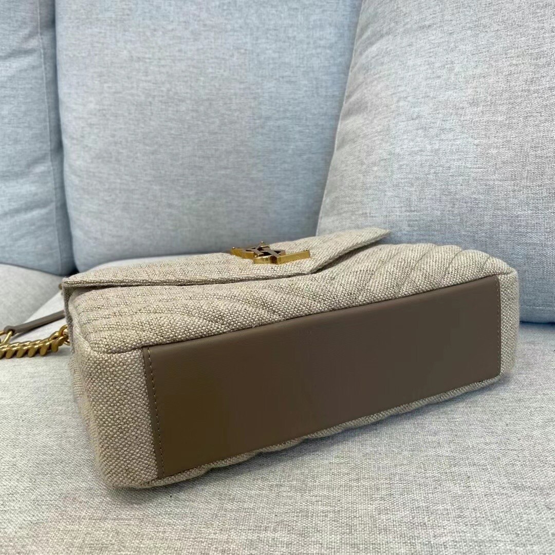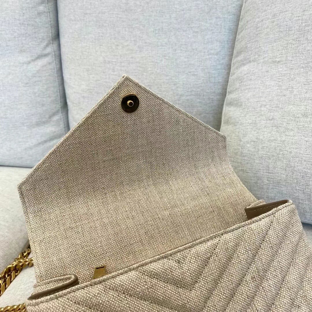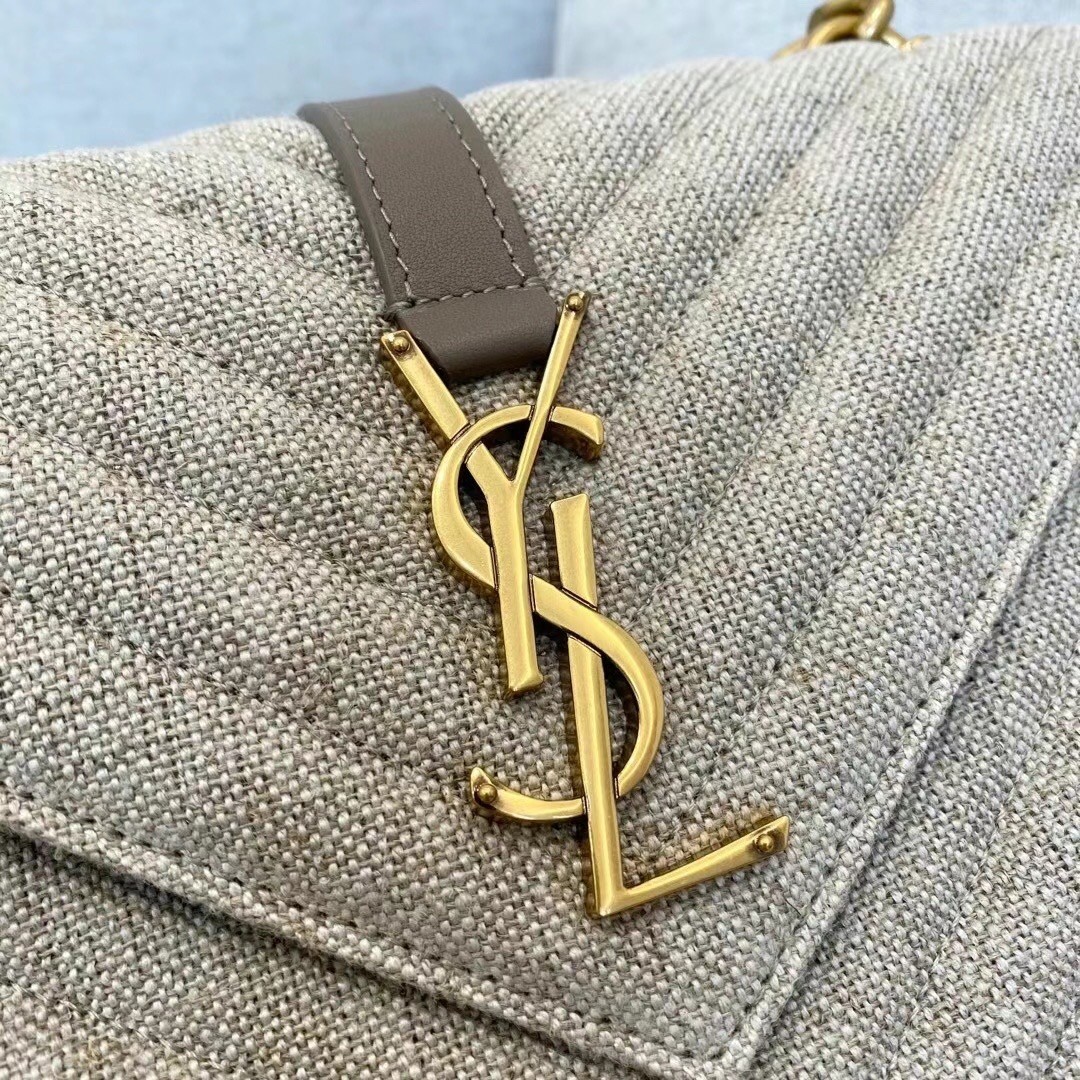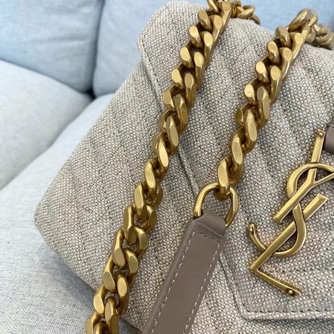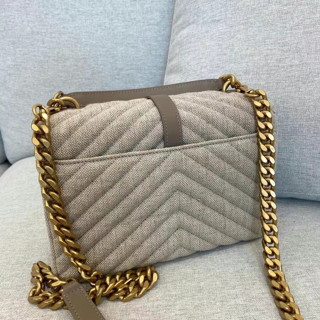 This neutral Saint Laurent College canvas cross body bag is crafted in Italy. It has a quilted design with a front flap, YSL logo plaque, a top handle and detachable chain strap. Gold tone hardware and leather trims complete this piece. Our College days will never be over thanks to this Saint Laurent bag.