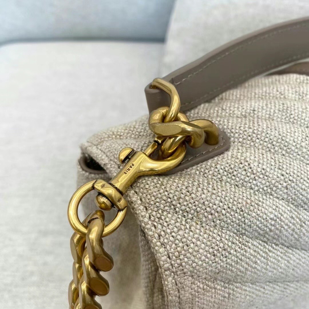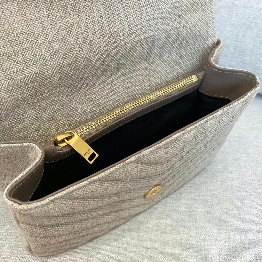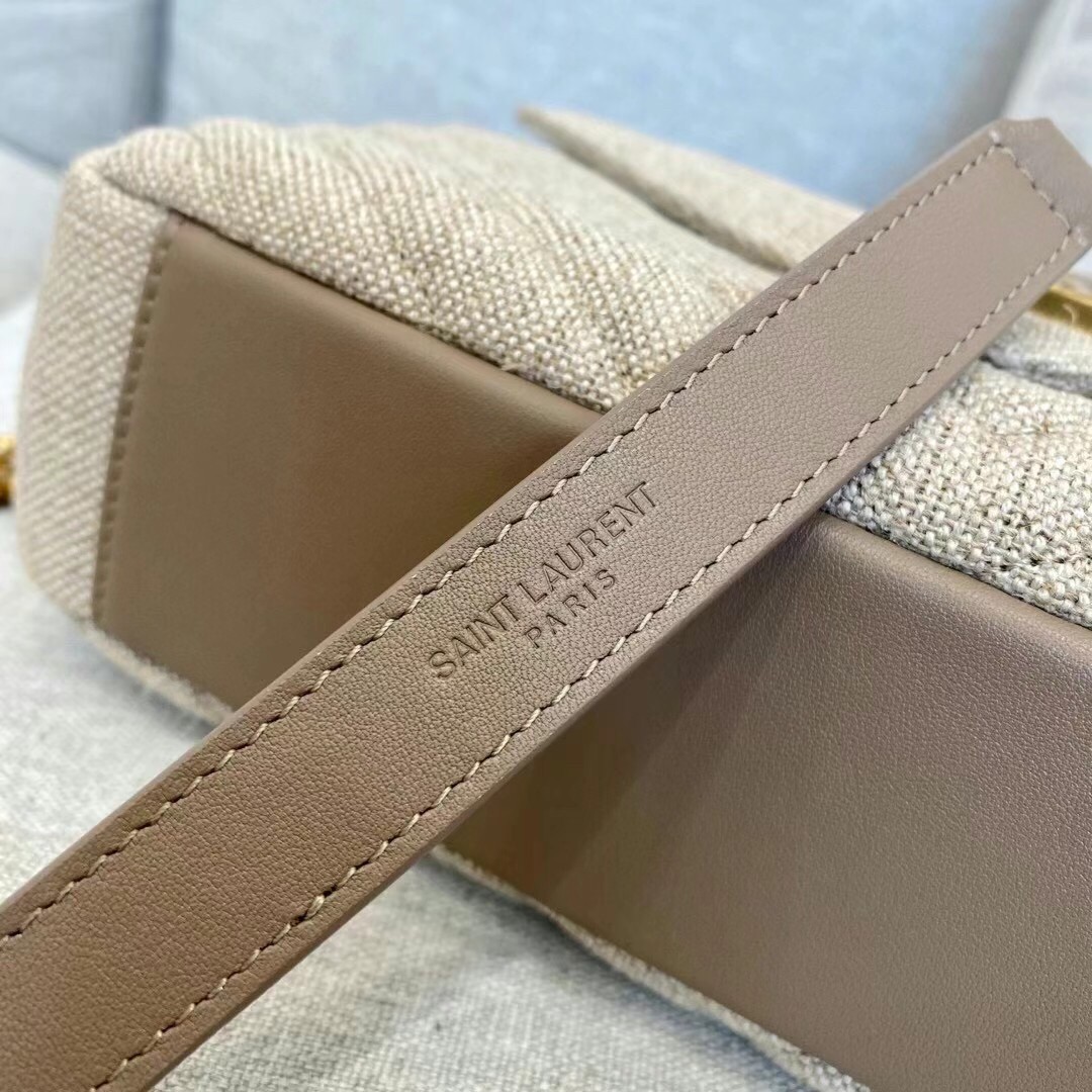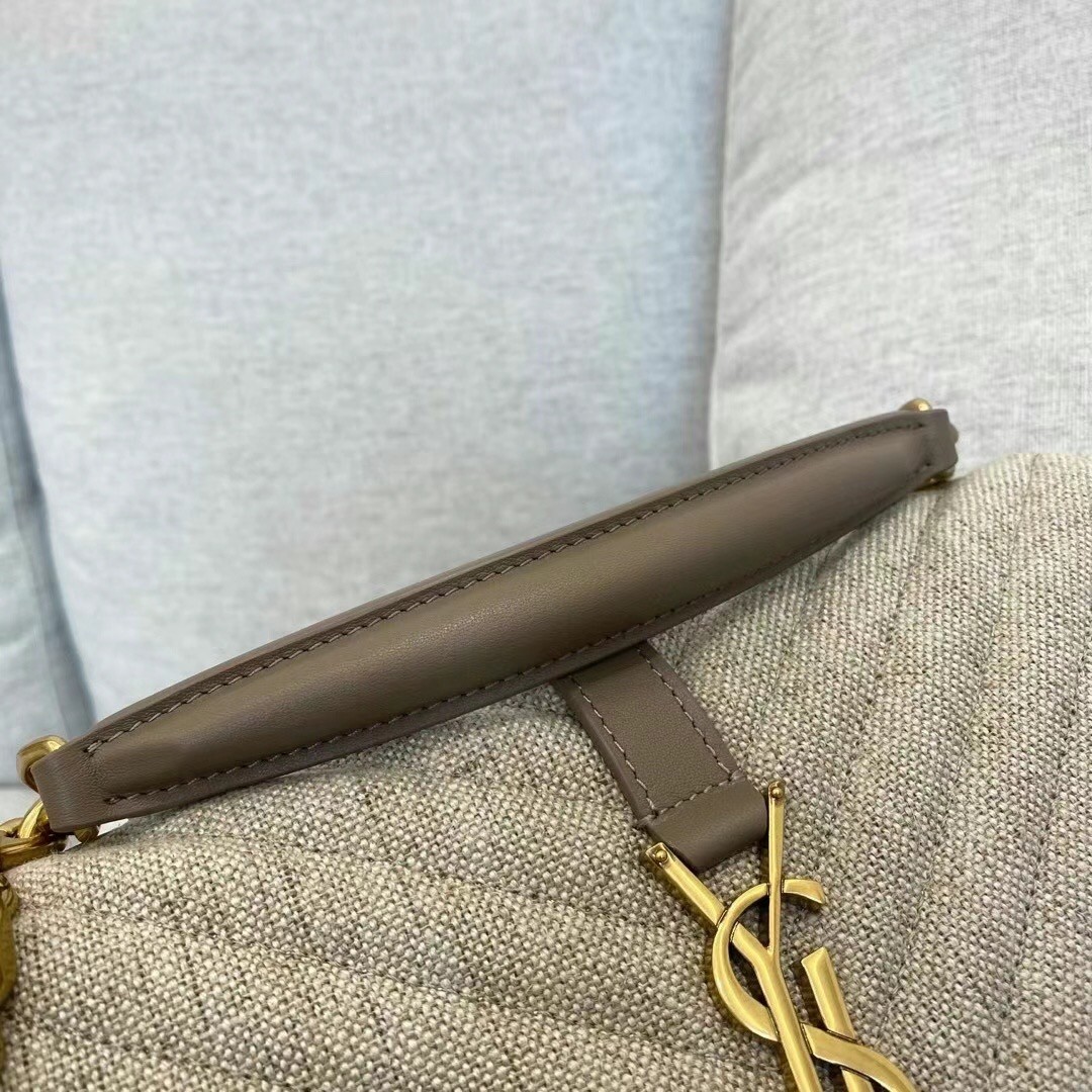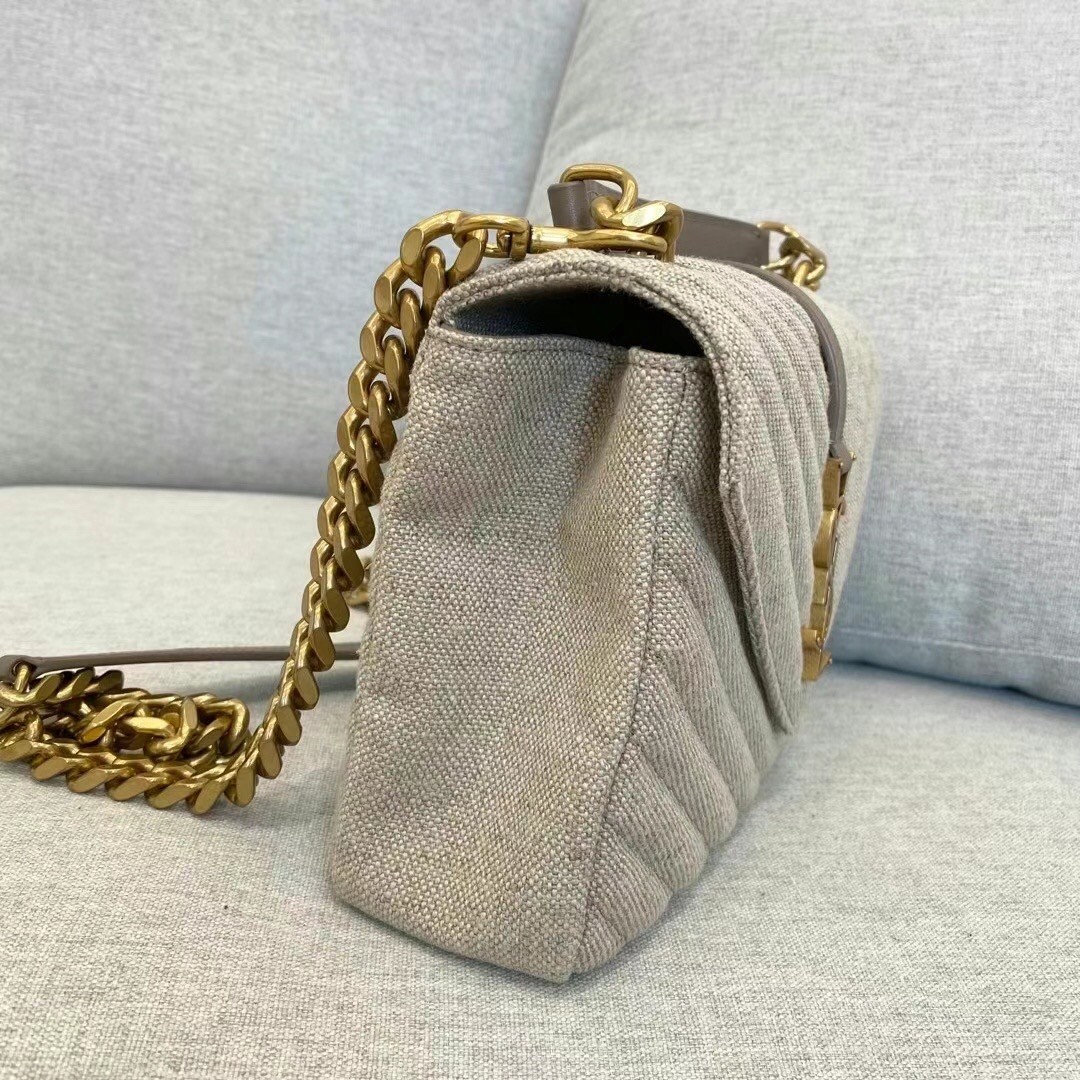 This neutral Saint Laurent College canvas cross body bag is crafted in Italy. It has a quilted design with a front flap, YSL logo plaque, a top handle and detachable chain strap. Gold tone hardware and leather trims complete this piece. Our College days will never be over thanks to this Saint Laurent bag.