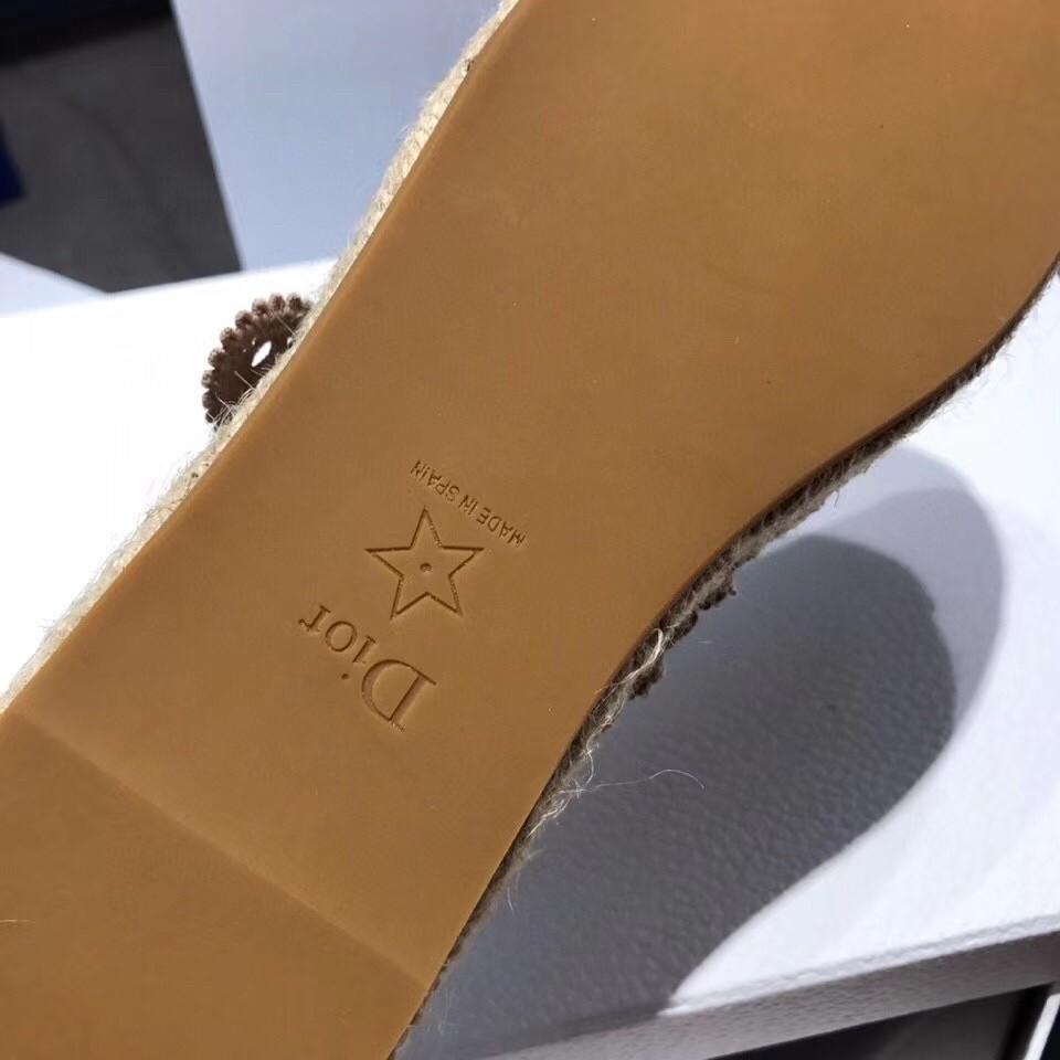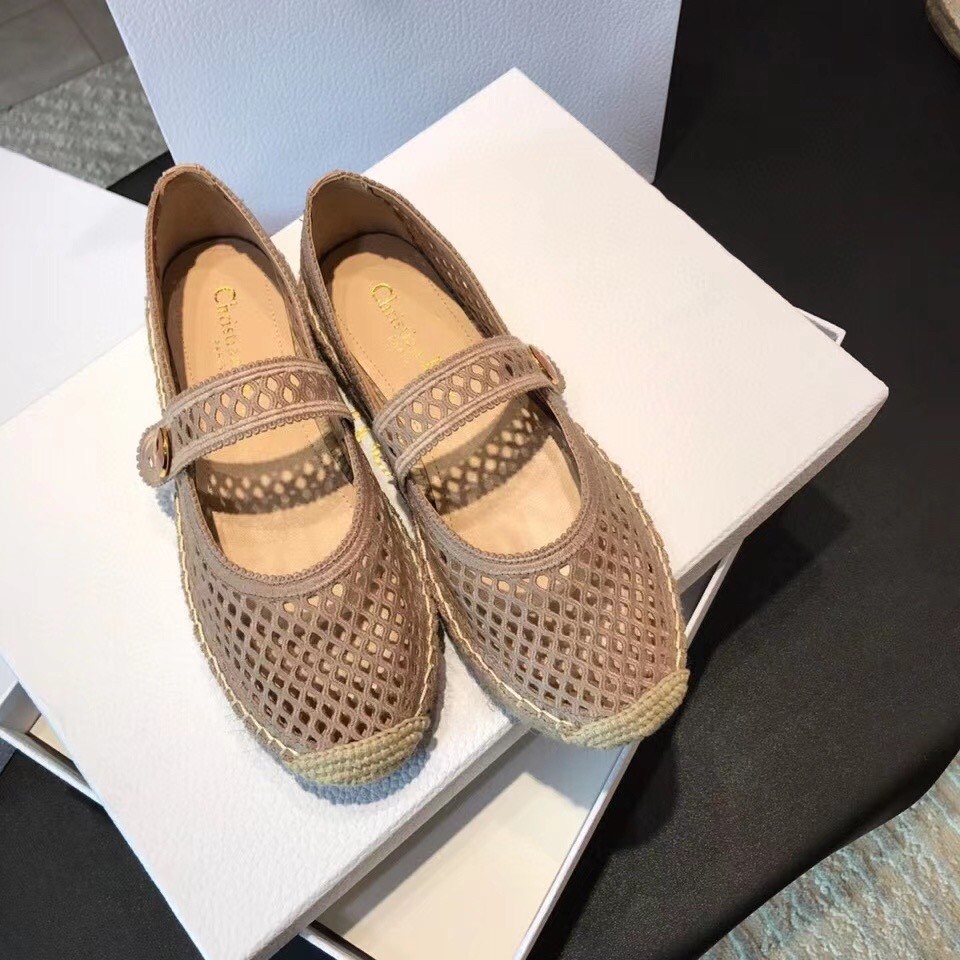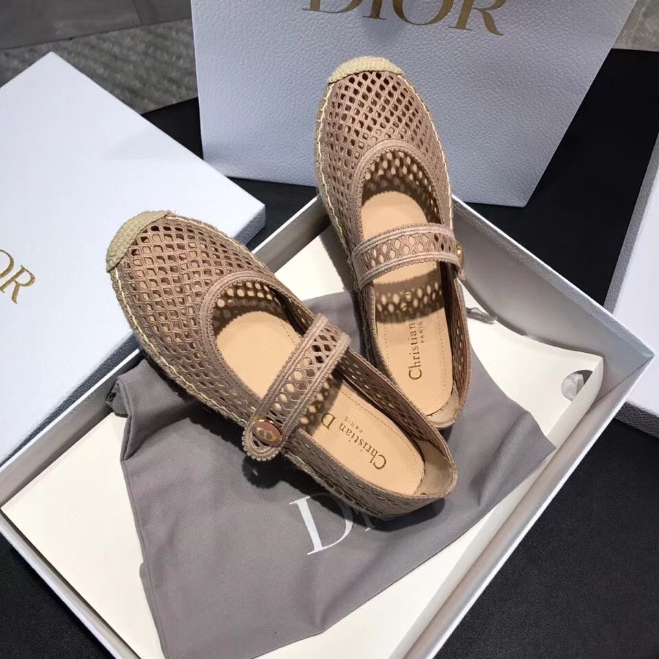 The Dior Caro ballerina flat has a hybrid style combining an espadrille with a Mary Jane design. Crafted in embroidered nude cotton in an openwork mesh effect, it is embellished with a strap featuring a non-removable button with a 'CD' signature and a rope sole handmade according to traditional methods. The shoe will elevate any seasonal look and can be paired with other mesh-like creations of the collection.