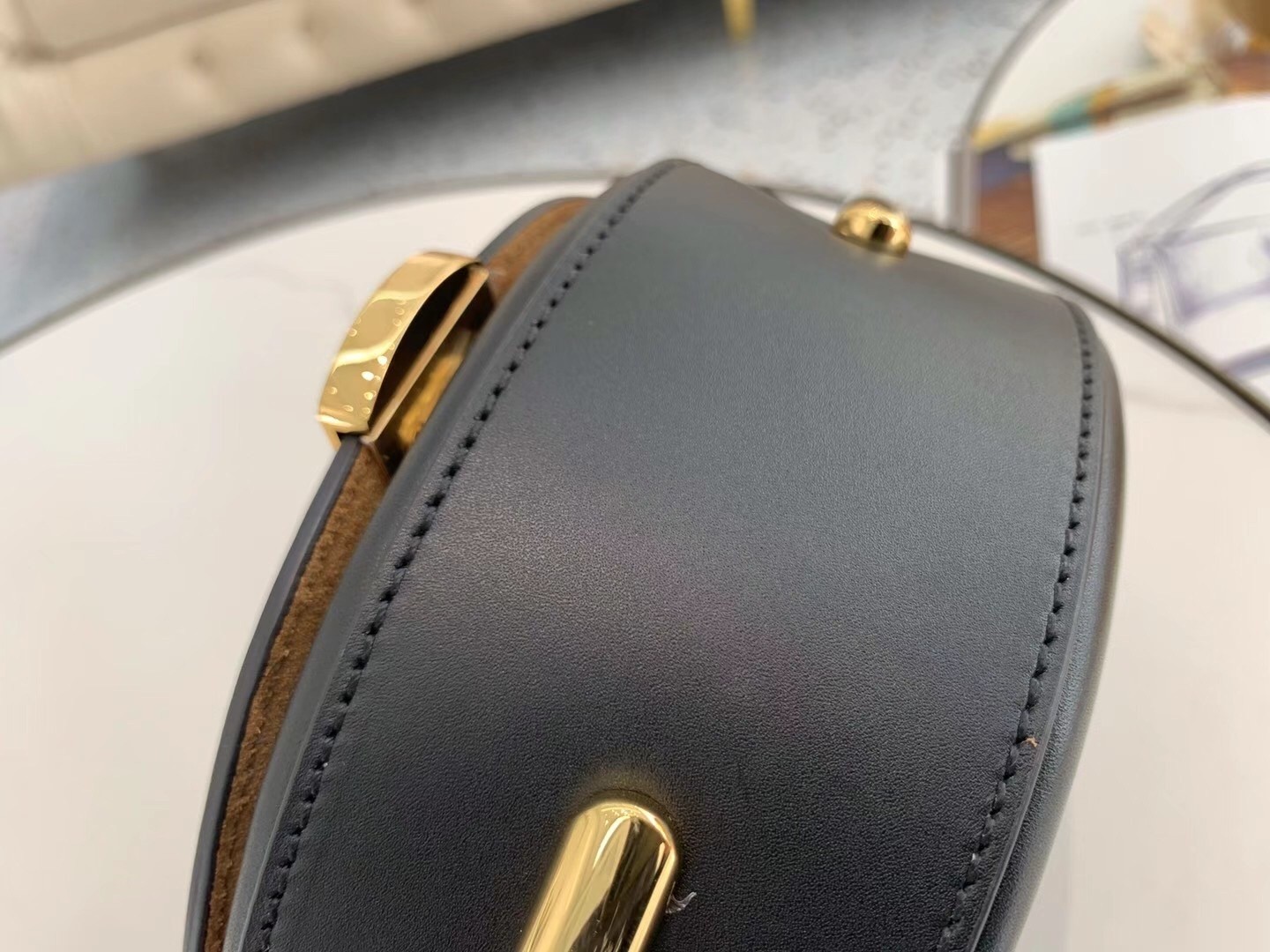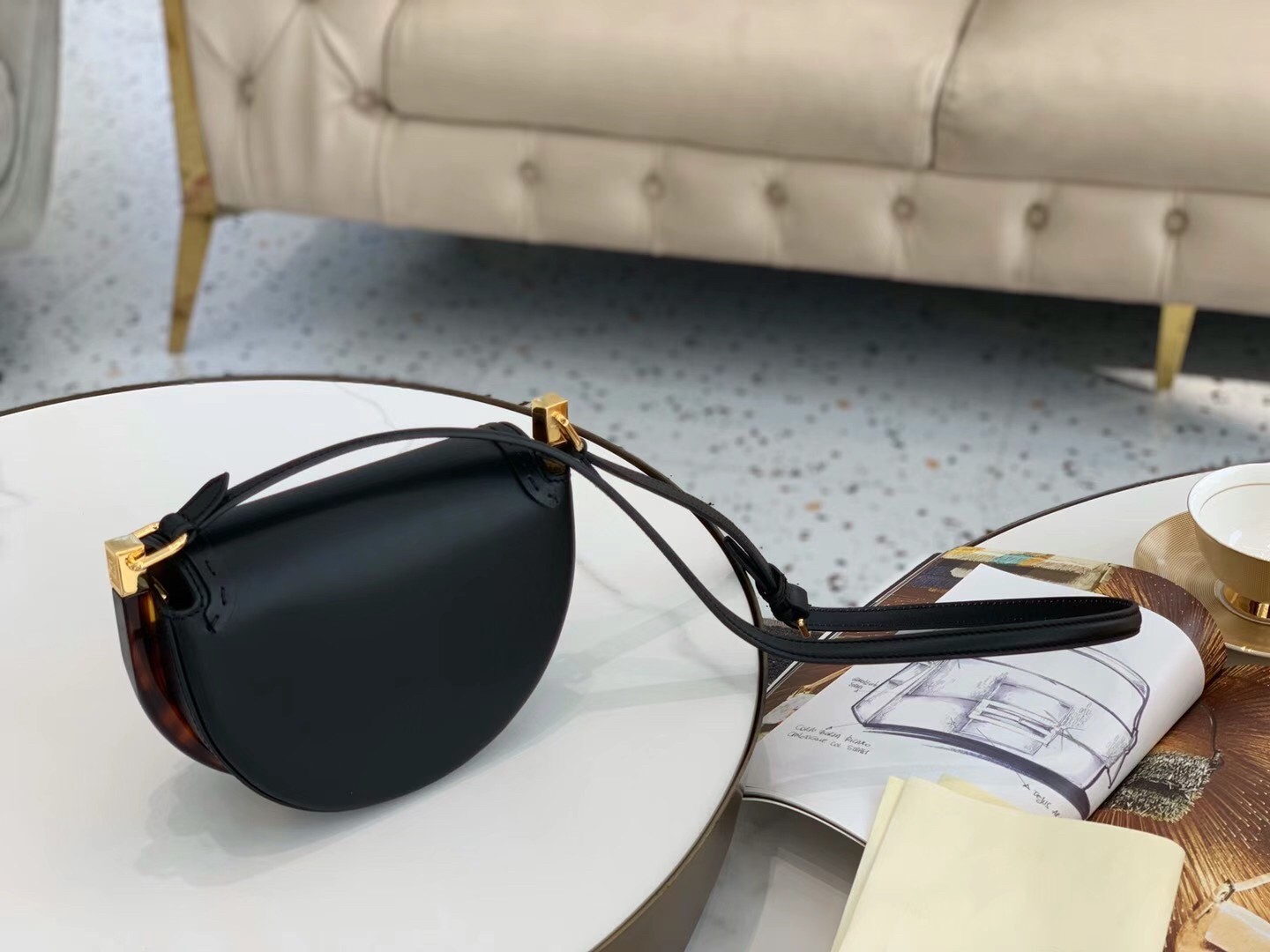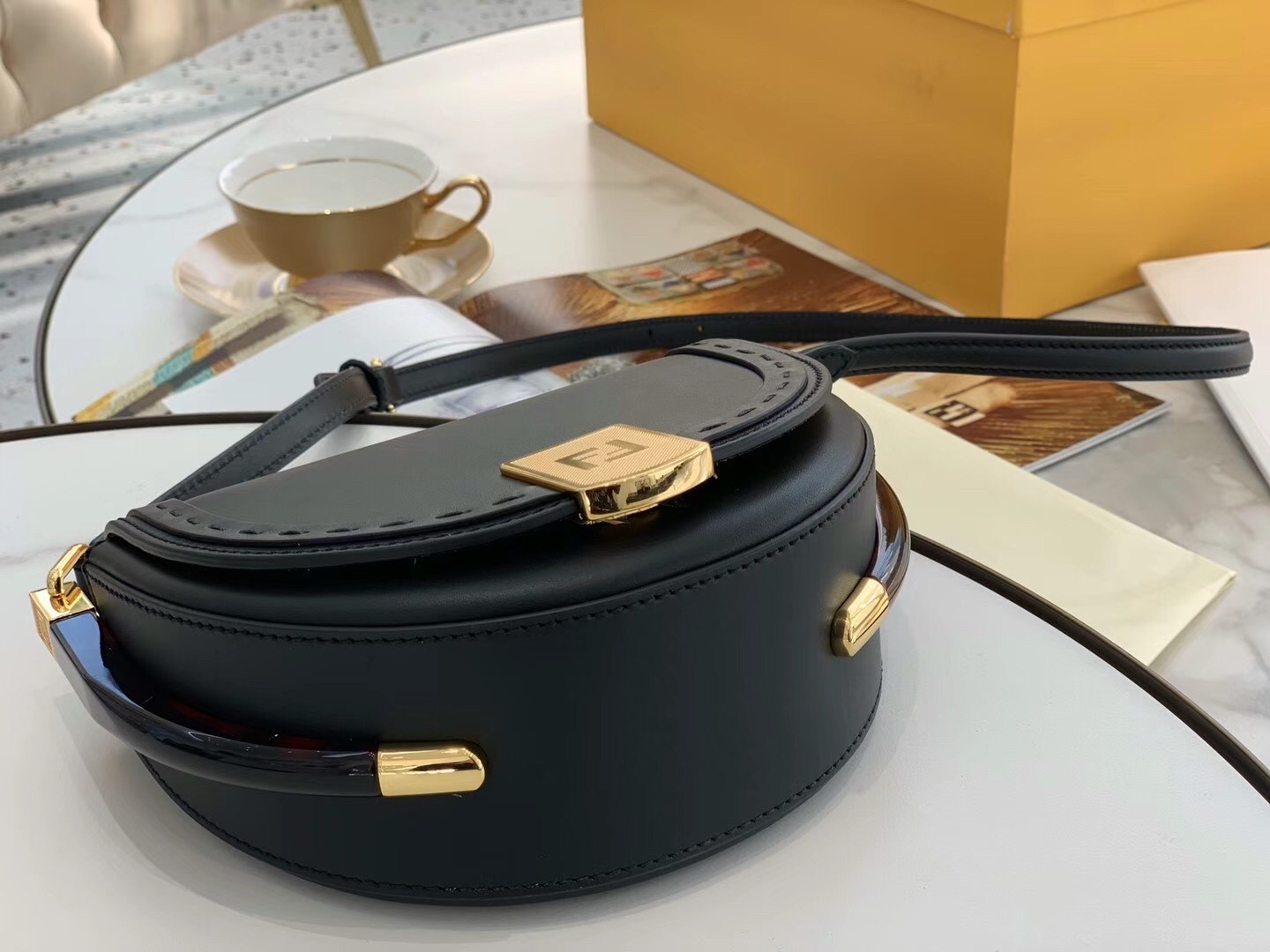 The Moonlight bag takes its name from its crescent shape, which also recalls, for other things, the lunar year collection launched last January and so dear to the Maison. To be used cross-body or as a handbag, the Moonlight presents all the distinctive codes of the Sunshine Shopper in a round design embellished on the sides with characteristic rigid tortoiseshell details. Bold, feminine and super cozy, the adjustable shoulder strap in contrasting colors that allows, as we anticipated, to carry it cross-body or on the shoulder.