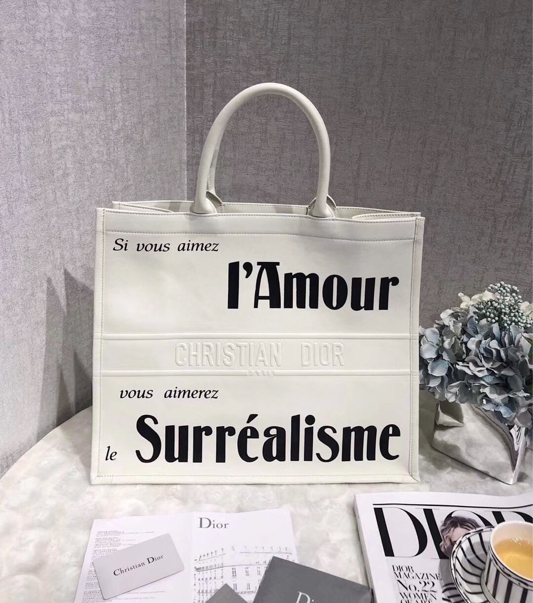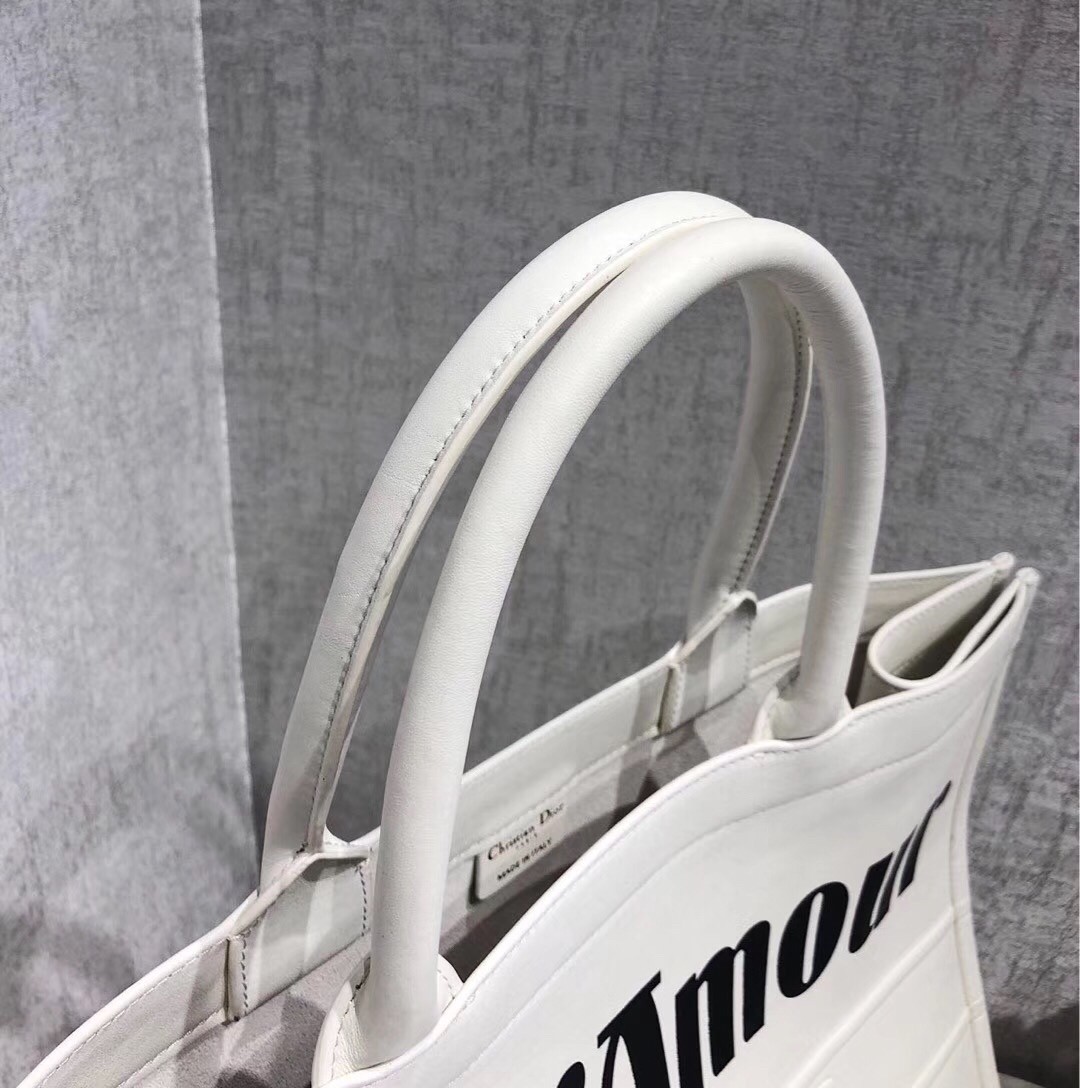 The Book Tote is the new upcoming classic tote of the house. The bag is large, durable and contemporary as new styles are being released every season. The Surrealism version is a limited edition and it’s made from smooth calfskin. The body is printed with motif inspired by Surrealism. The words like ‘Si Vous Aimez’ – if you like or if you love. ‘Vous Amerez’ – you will love and ‘L’amour’ – love, are imprinted on the body. And if you search for details – the name of the brand is marked in the center in leather. It reads: ‘Christian Dior’. And perhaps this is Dior’s version of Surrealism. It’s to hide the logo in the background while enhancing the French words.
