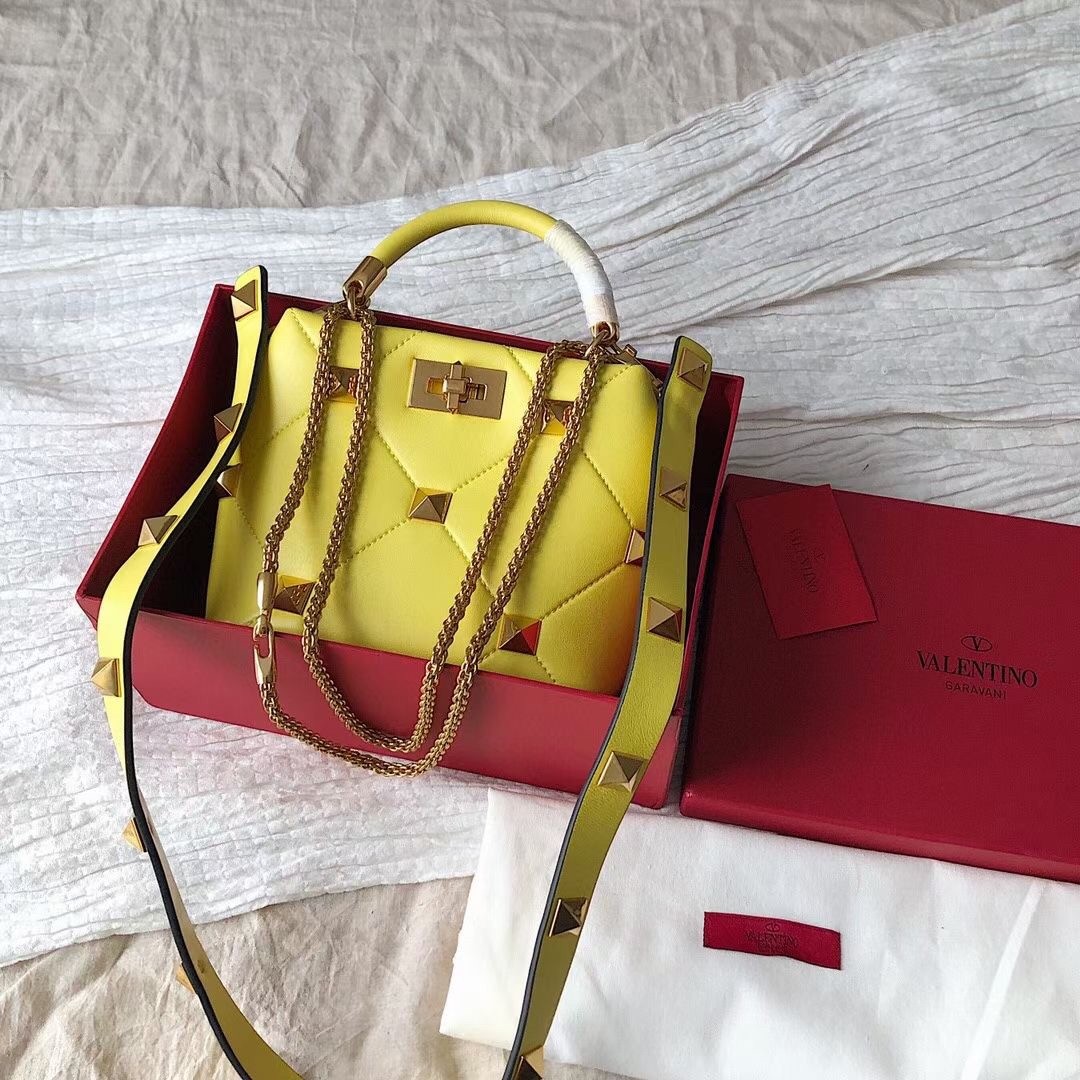 Valentino Garavani reimagines its signature pyramid-shaped embellishments with the Roman Stud top-handle bag. Crafted from nappa leather, it boasts oversized quilting that nods to one of the label’s most illustrious House codes, while the compartmentalised interior ensures a truly modern finish. Equipped with a single handle, it also features a detachable sliding chain strap and an alternative leather shoulder strap – making it the perfect companion no matter the event.