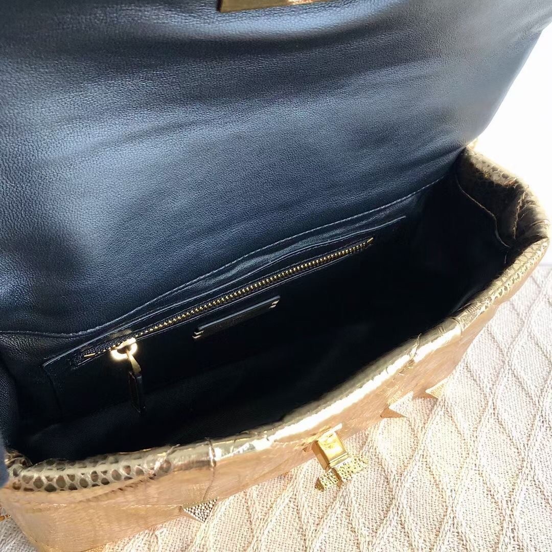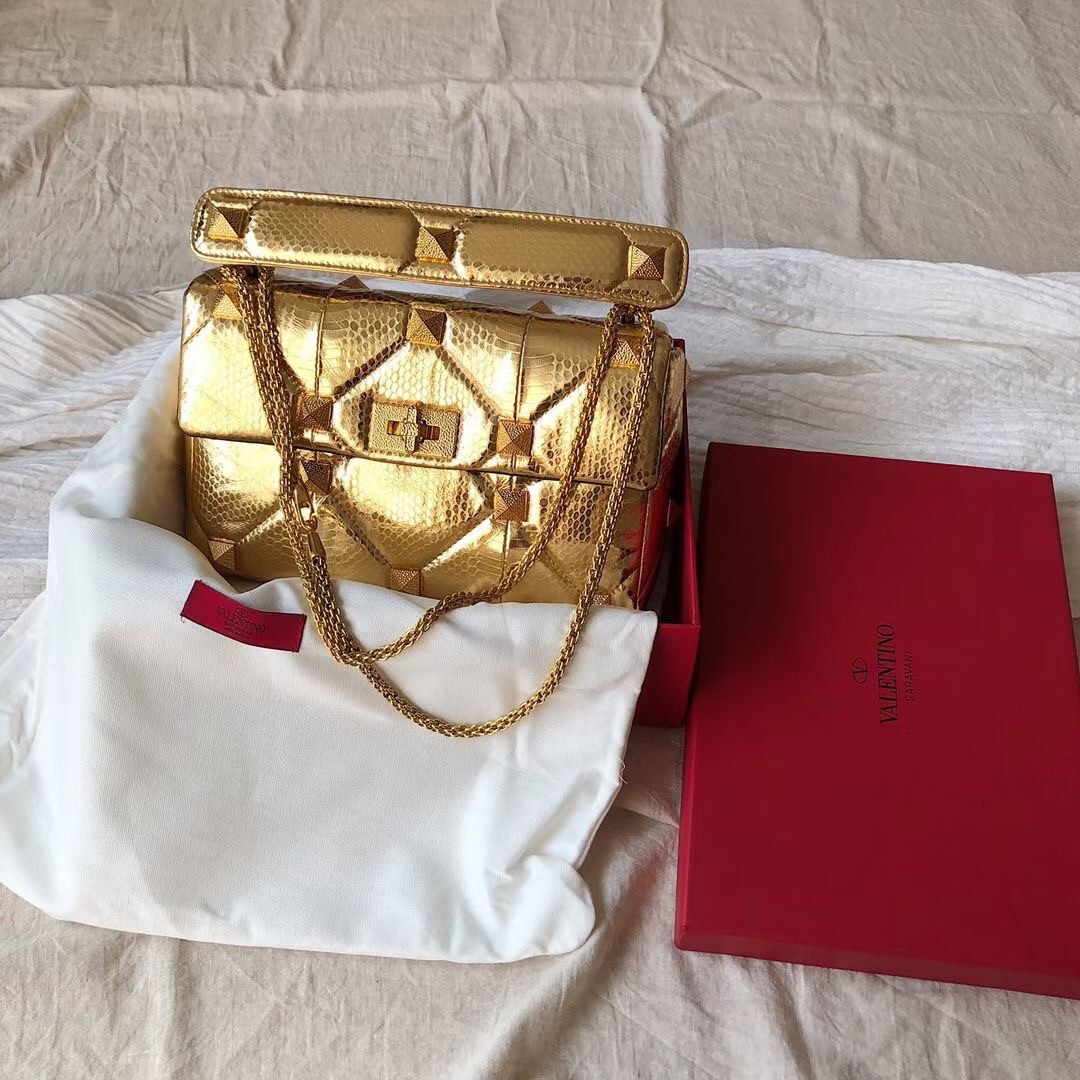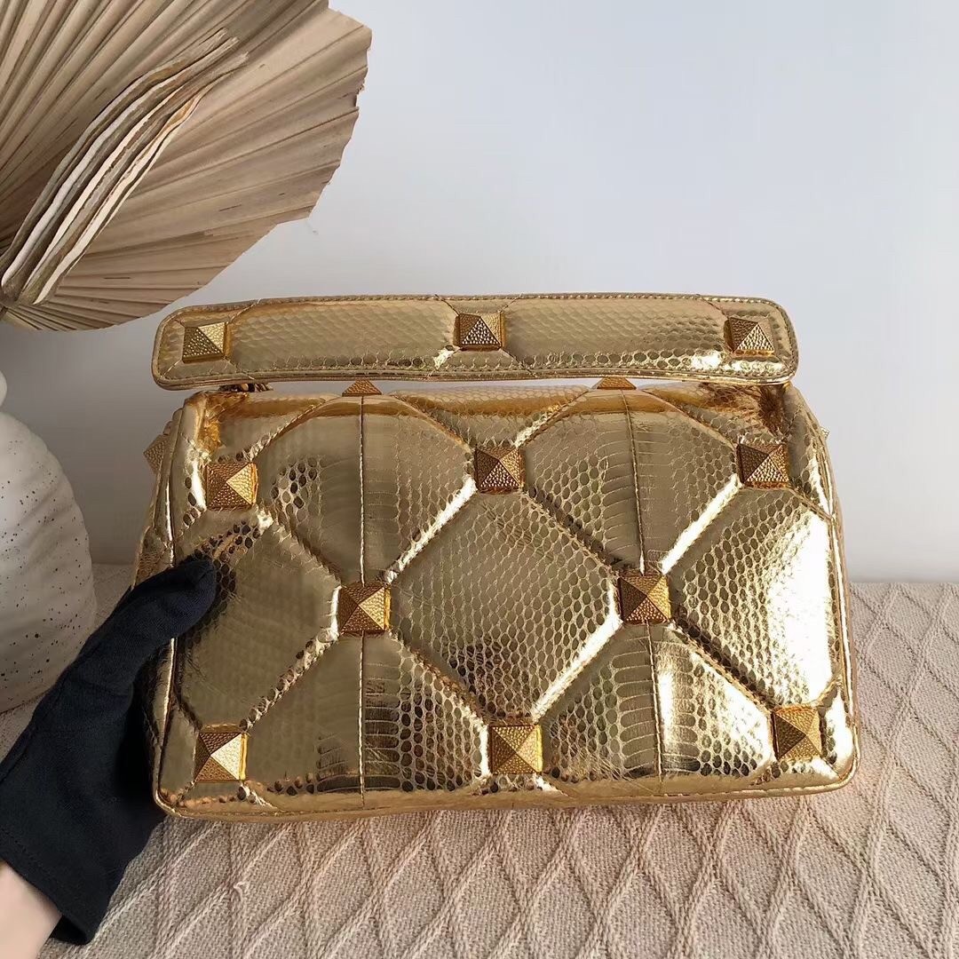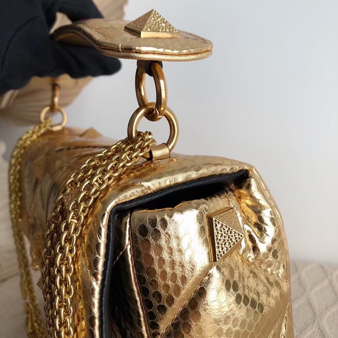 Remaining faithful to Valentino Garavani's celebrated heritage, the Roman Stud shoulder chain bag is adorned with the House's iconic Rockstuds. Crafted from metallic leather, the textured design – including the hammered hardware and quilted stitching – gives the piece a multidimensional finish, tapping into the label's coveted feminine-meets-rock aesthetic.