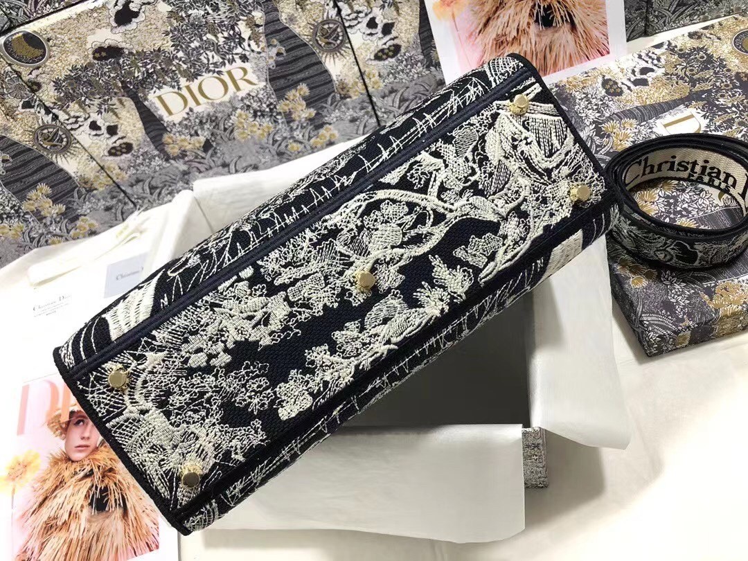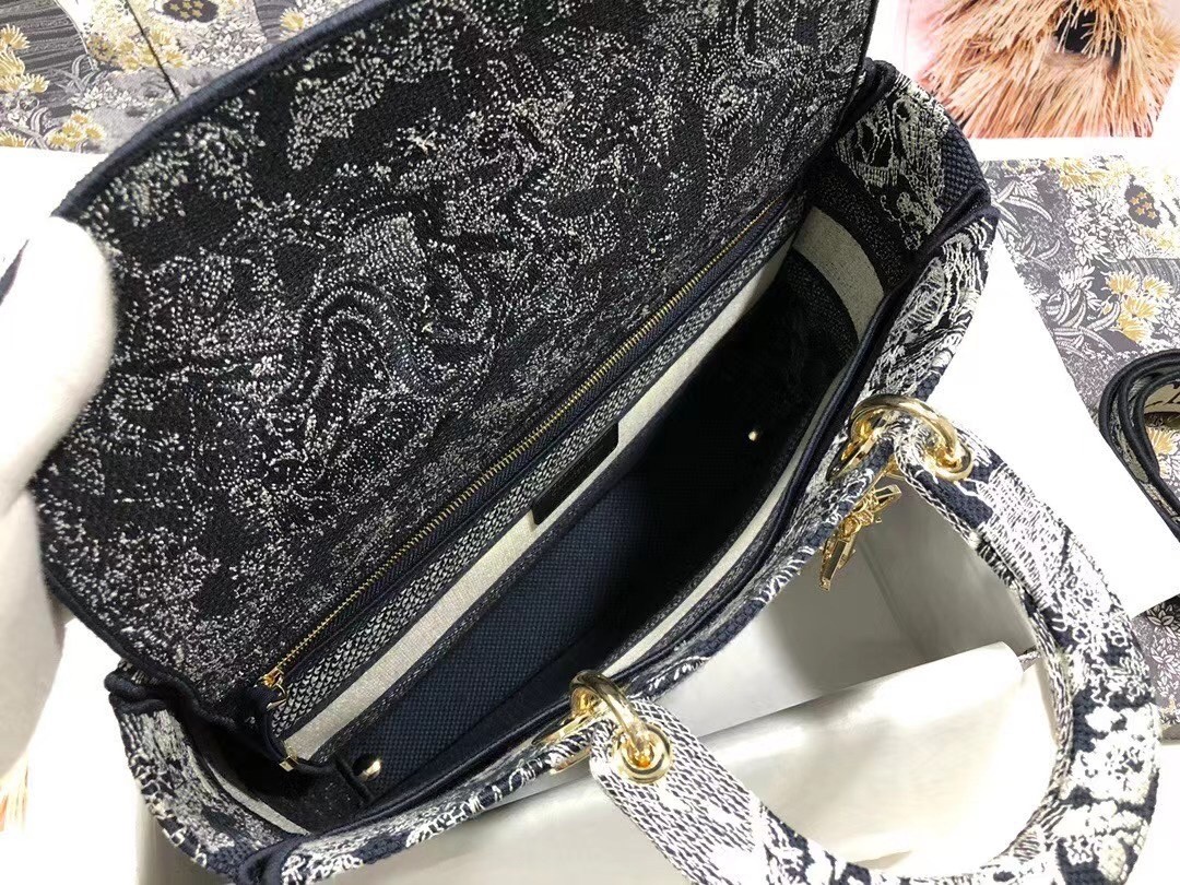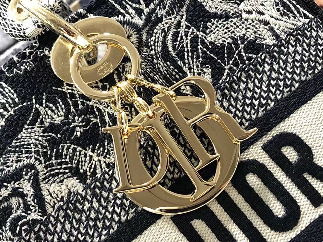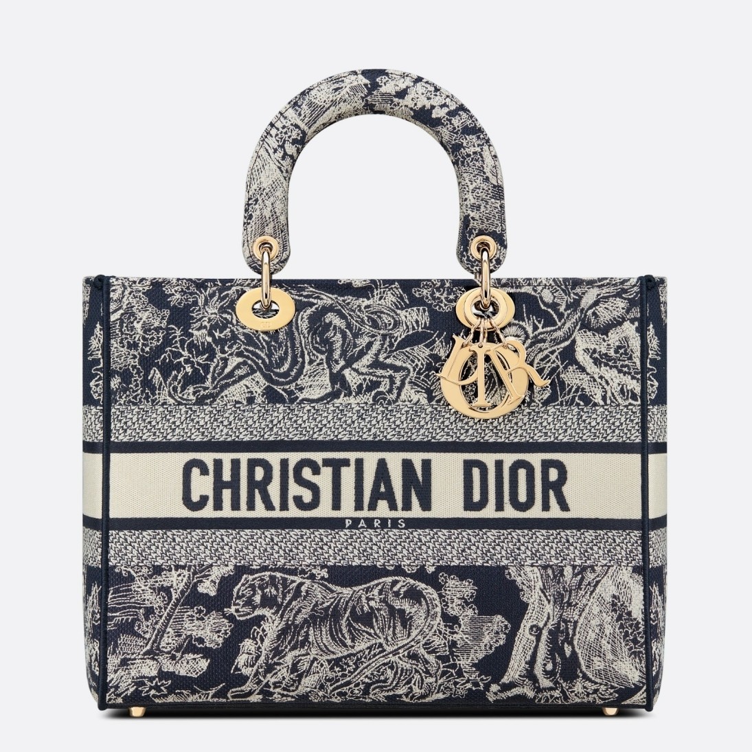 The Lady D-Lite bag combines classic elegance with House modernity. The style is fully embroidered with the blue Toile de Jouy Reverse motif, a variation of the hallmark House pattern with a play on reversed colors. The front features a 'CHRISTIAN DIOR' signature while the thick 'D.I.O.R.' charms in pale gold-finish metal enhance the silhouette. Equipped with a wide, reversible and removable embroidered shoulder strap, the large Lady D-Lite bag can be carried by hand, worn over the shoulder or crossbody.