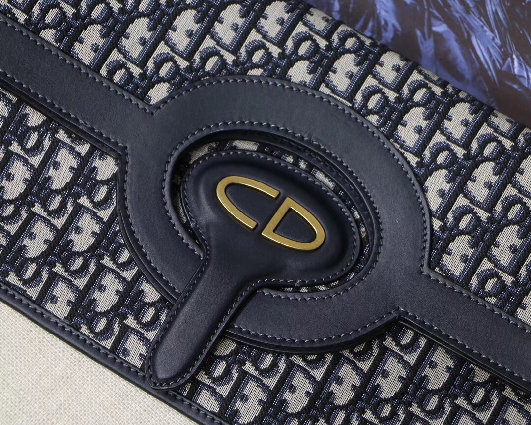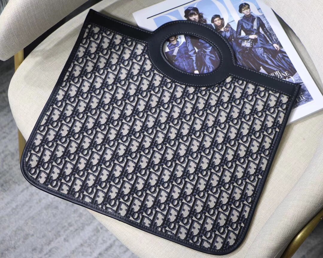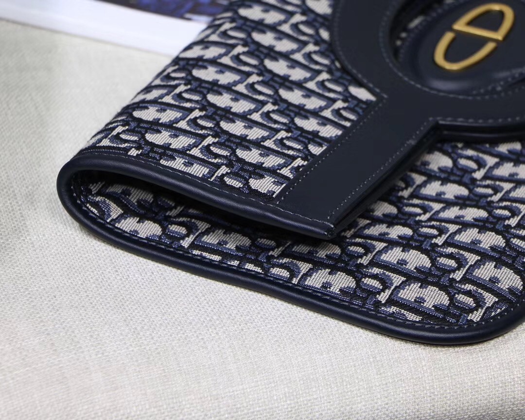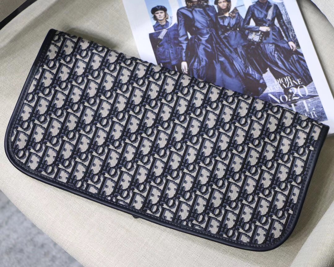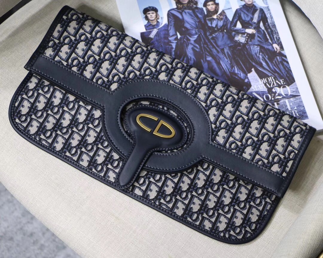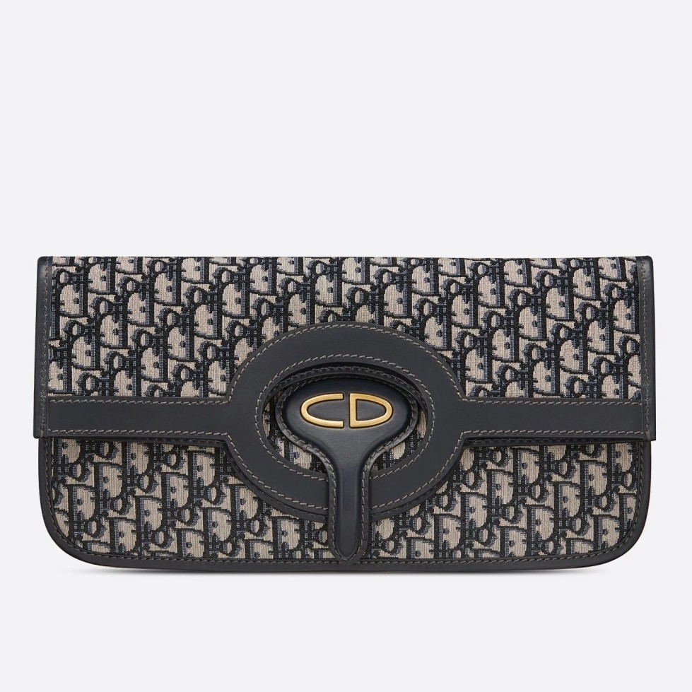 This Fold Over clutch is crafted of Dior Oblique canvas. The bag features navy blue cowhide leather trim around the edges and features a cutout handle, a gold CD logo closure and a simple beige linen interior. This versatile bag can be worn as a clutch or as a tote bag, and is perfect for daytime or evening essentials with the chic style from Christian Dior!