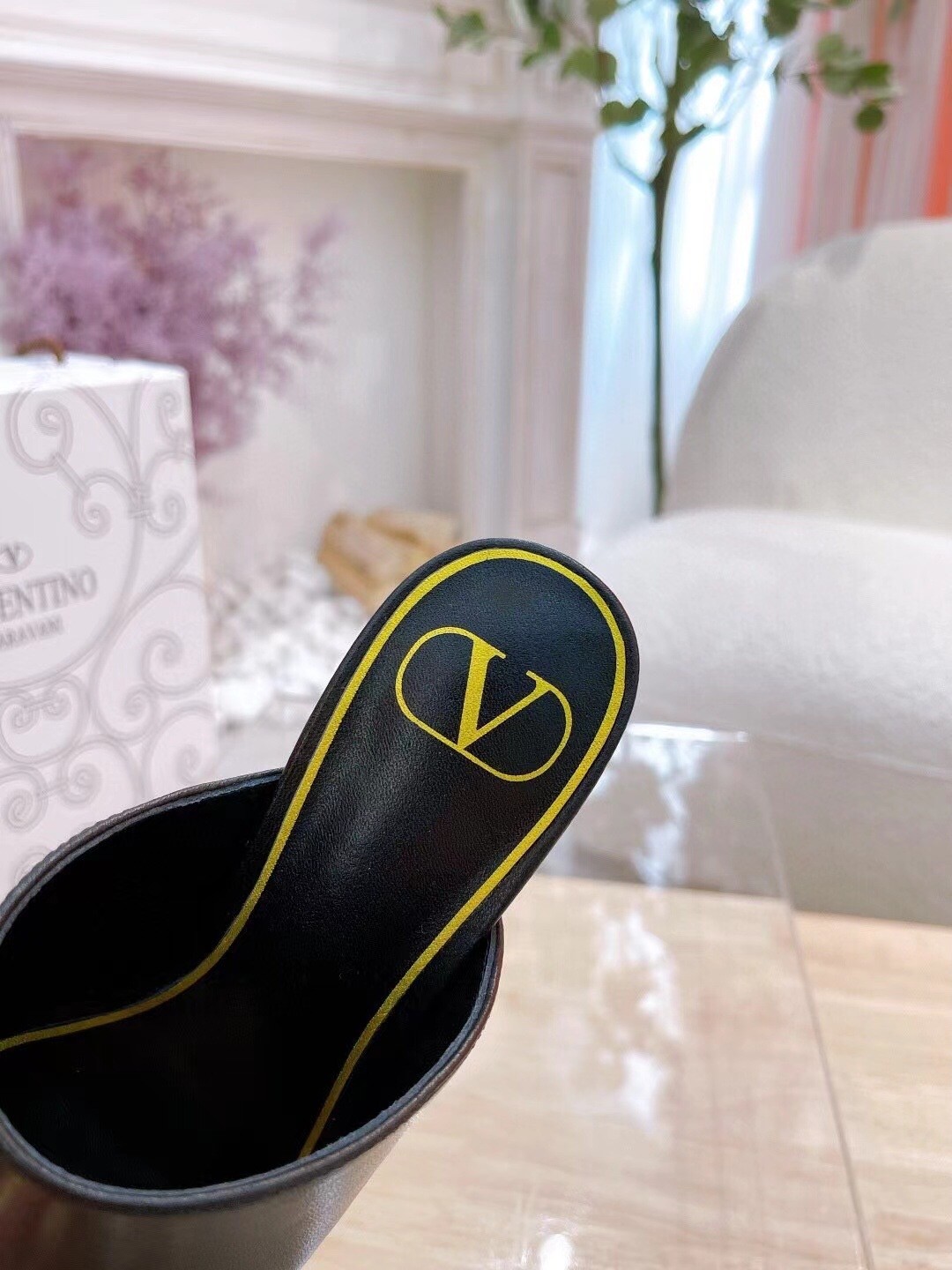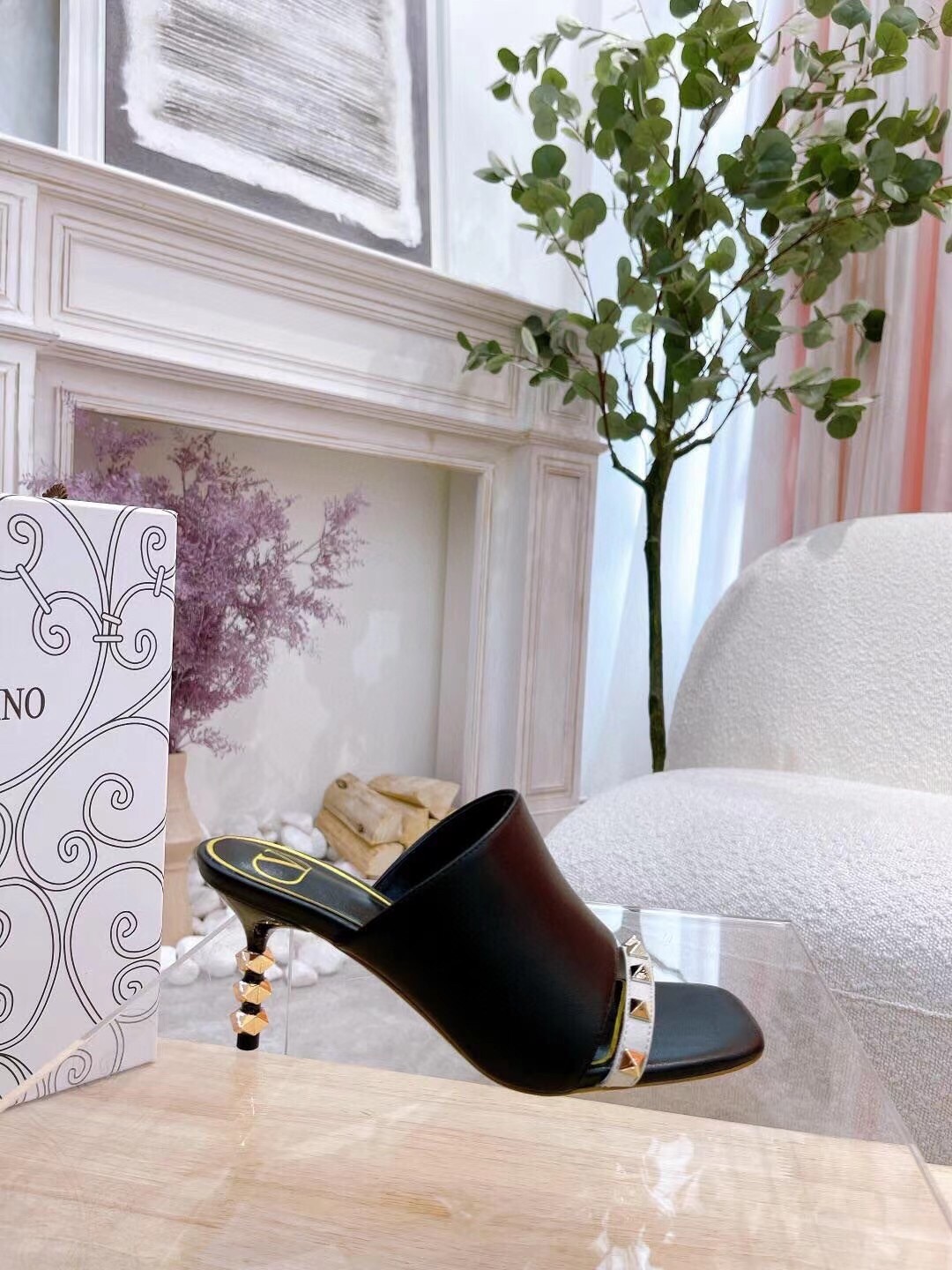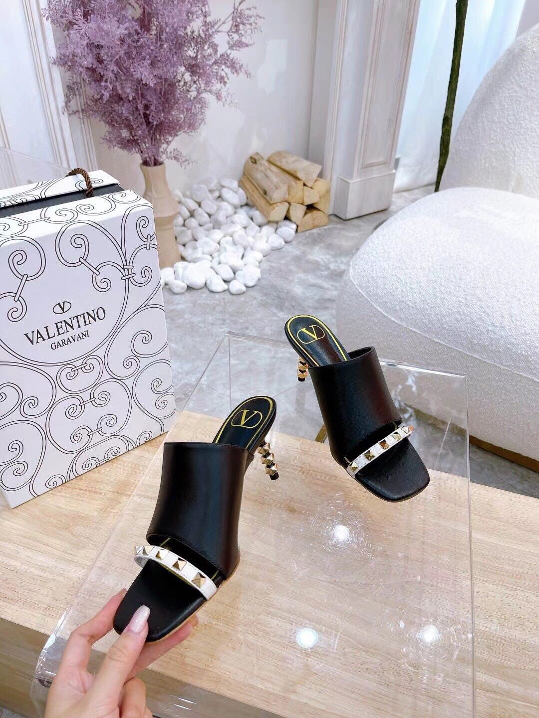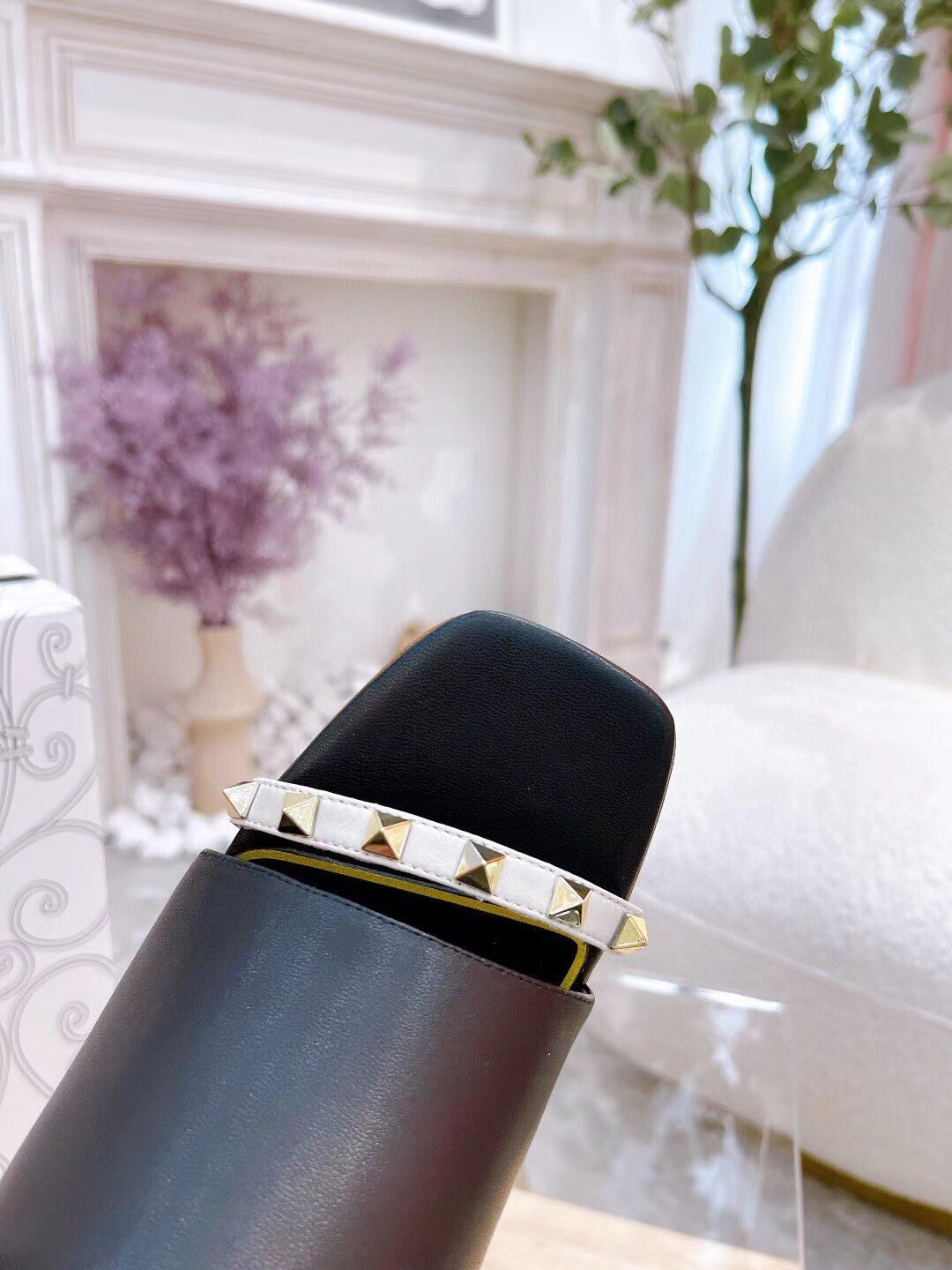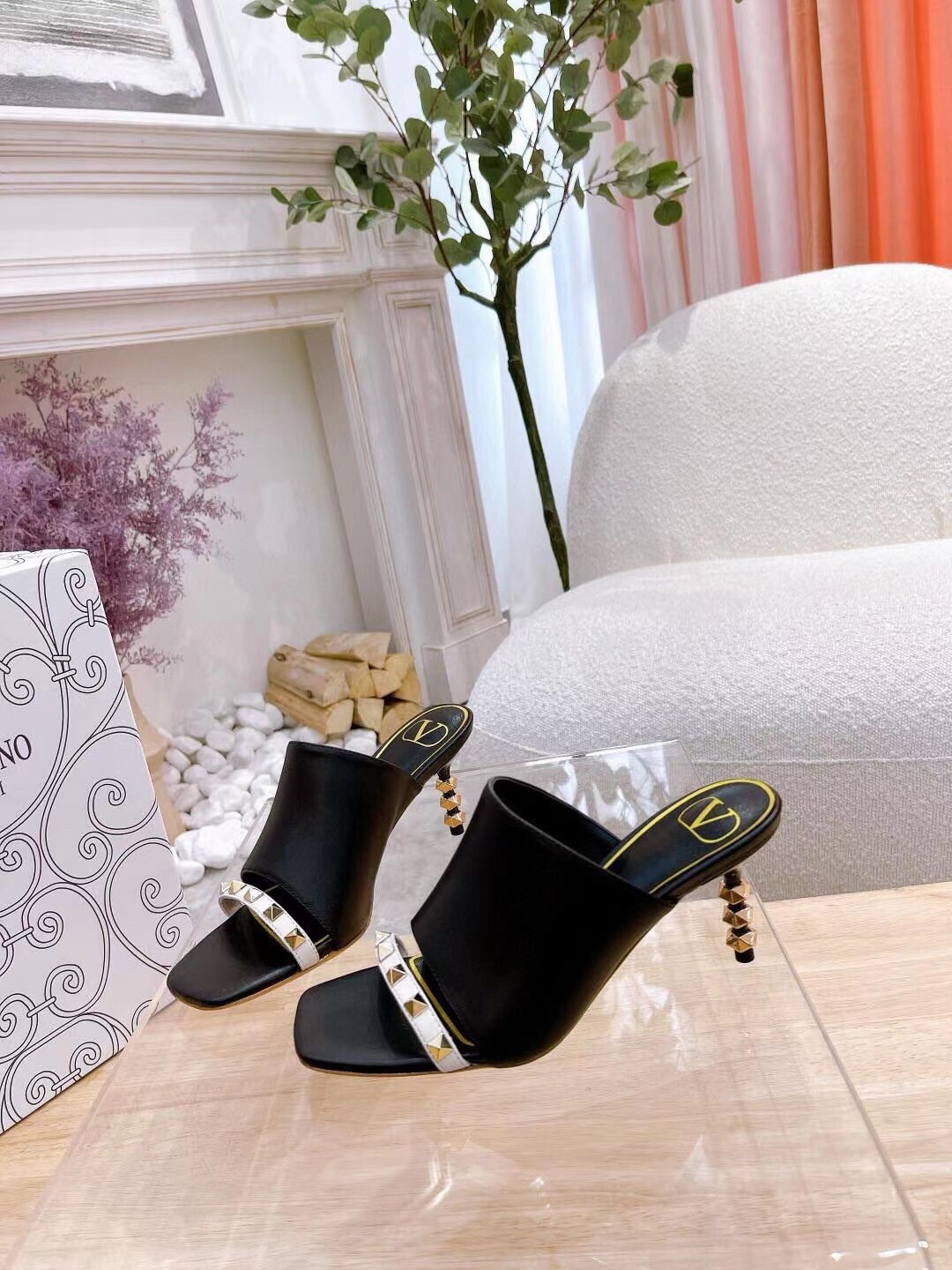 Valentino Garavani Rockstud Slide Sandal in lambskin with sculpted heel, these pairs feature heel detailed with a sequence of iconic four-sided studs, contrast-colour strap on upper with stud embellishments and antique-brass-finish studs