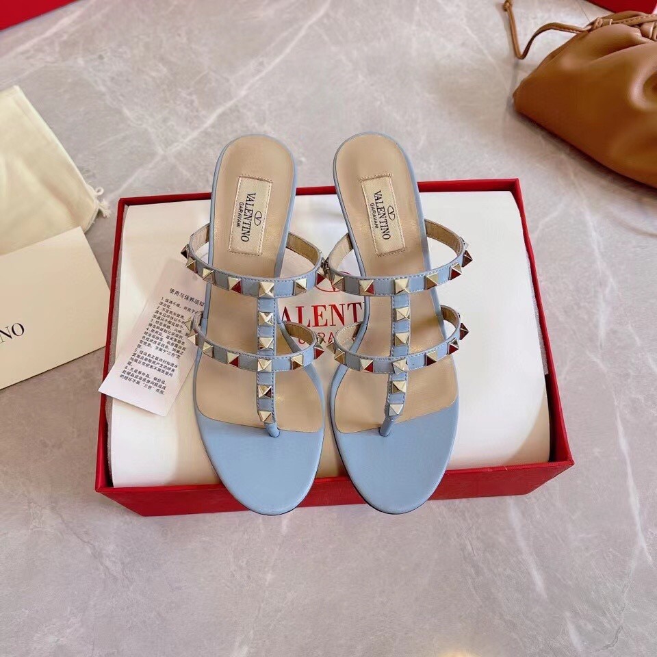 Valentino Rockstud Flip Flop Sandals 50mm In Blue Calfskin