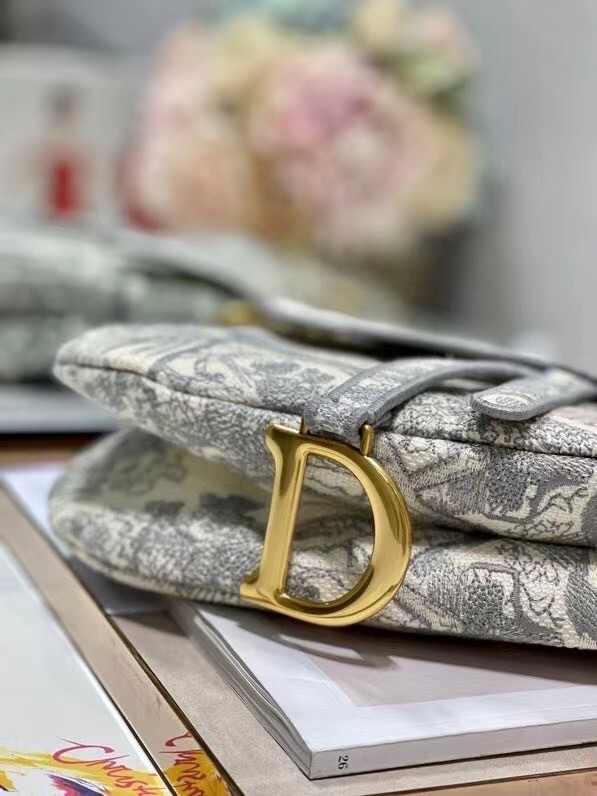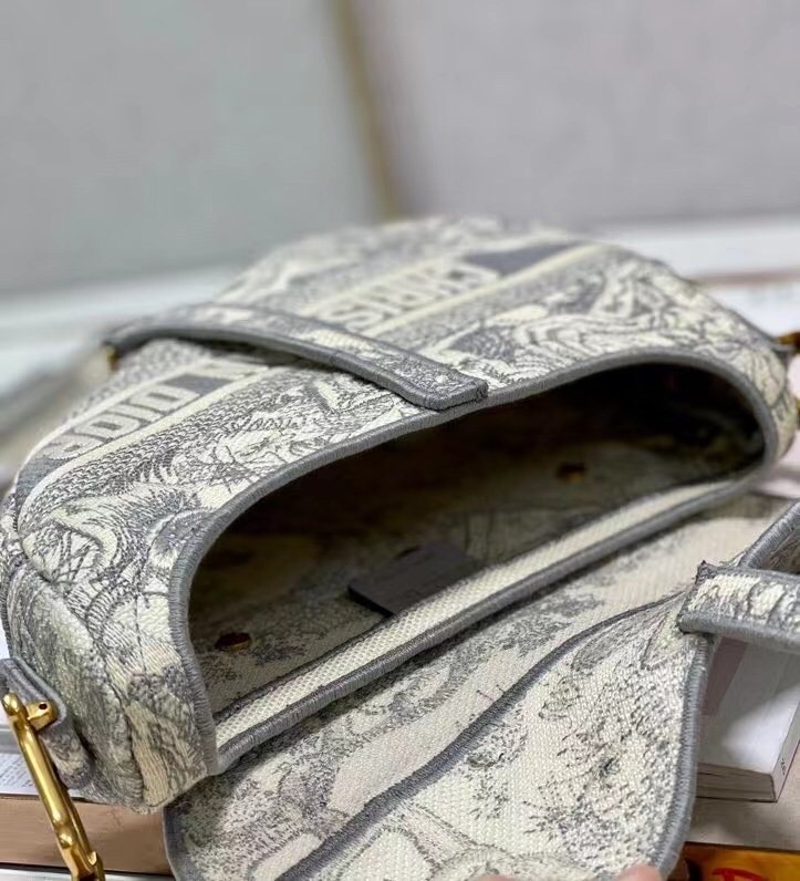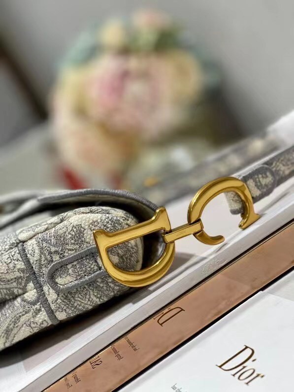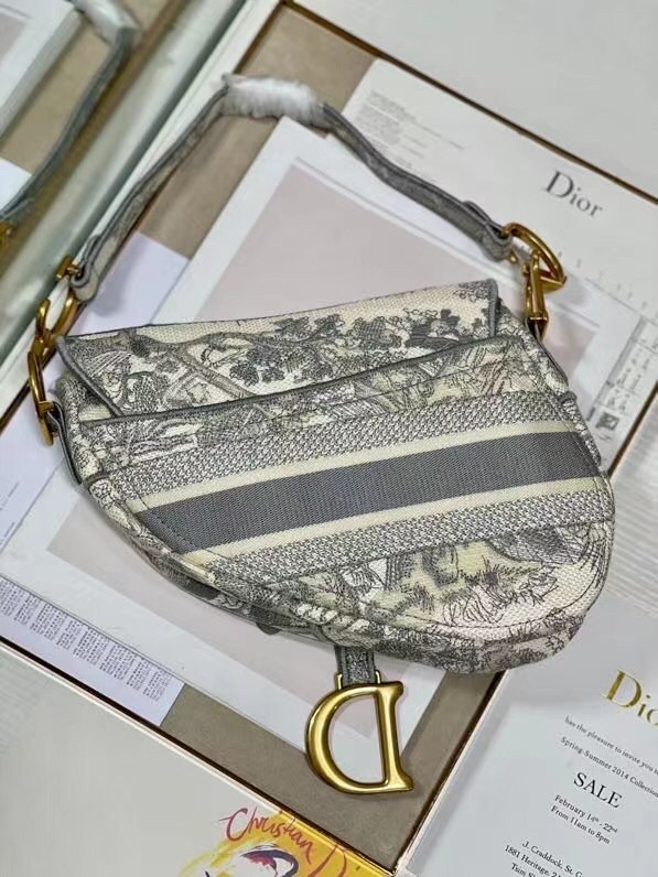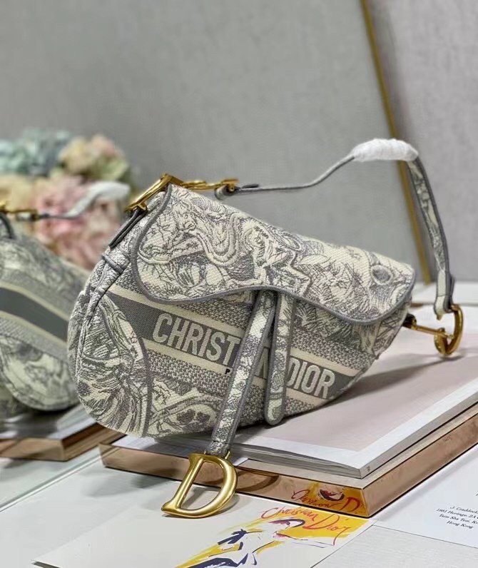 Maria Grazia Chiuri brings a fresh update to the iconic Saddle bag. The design is fully embroidered with the hallmark Toile de Jouy motif, further enhanced by a 'CHRISTIAN DIOR' signature on the front. The legendary design features a Saddle flap with a magnetic 'D' stirrup clasp and boasts an antique gold-finish metal 'CD' signature on each side of the handle. The bag can be customized with different shoulder straps and may be coordinated with the season's other Toile de Jouy creations.