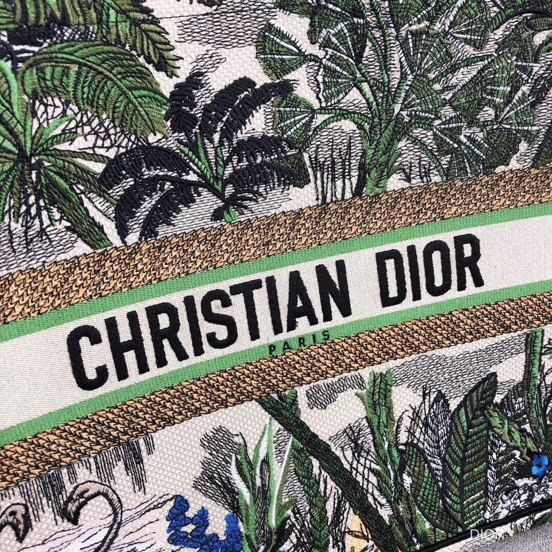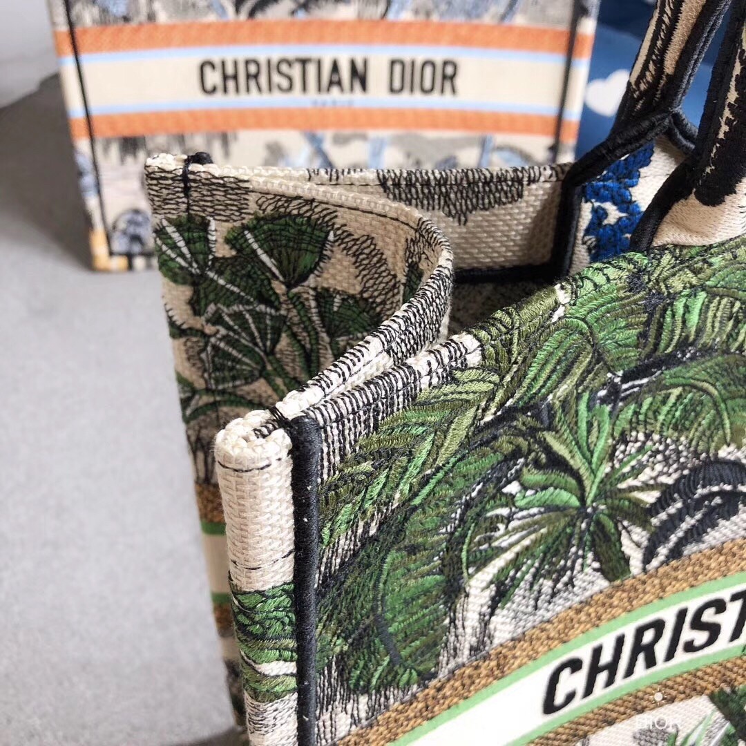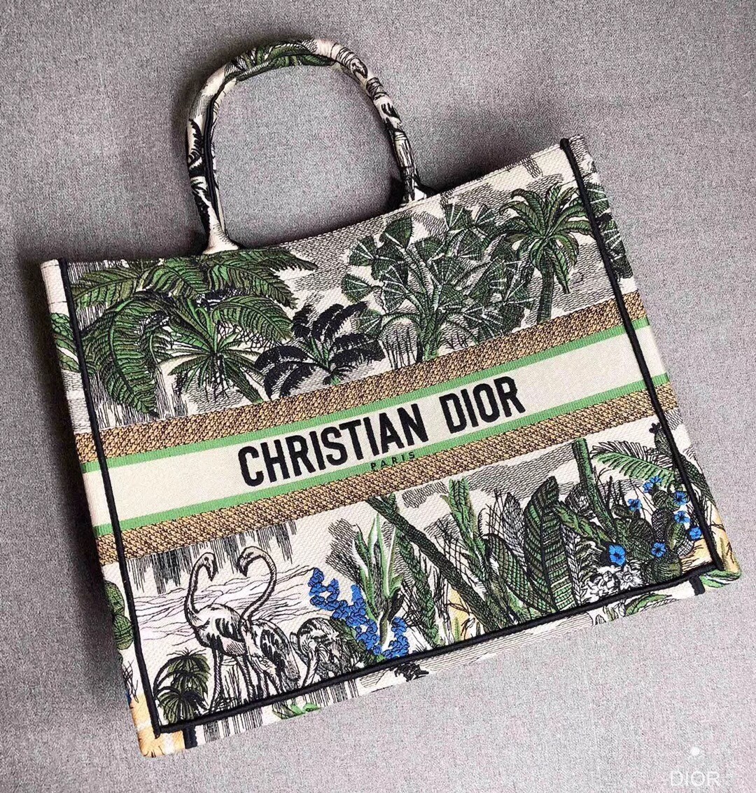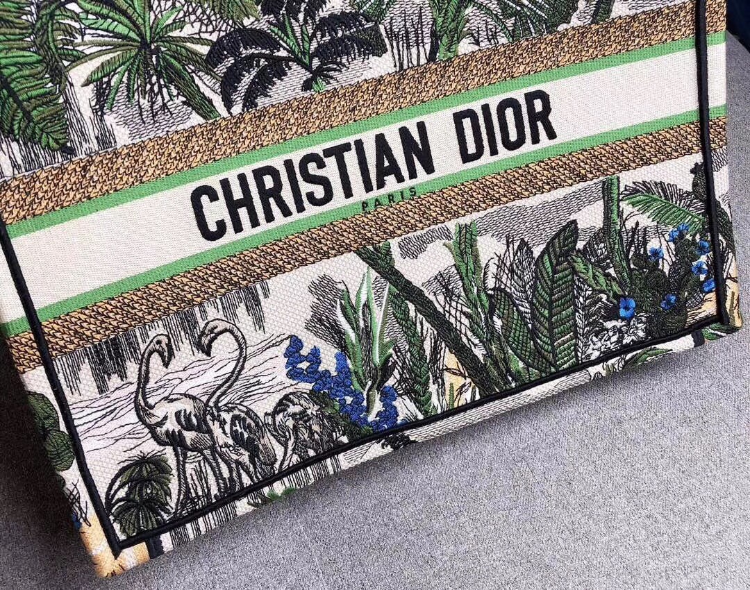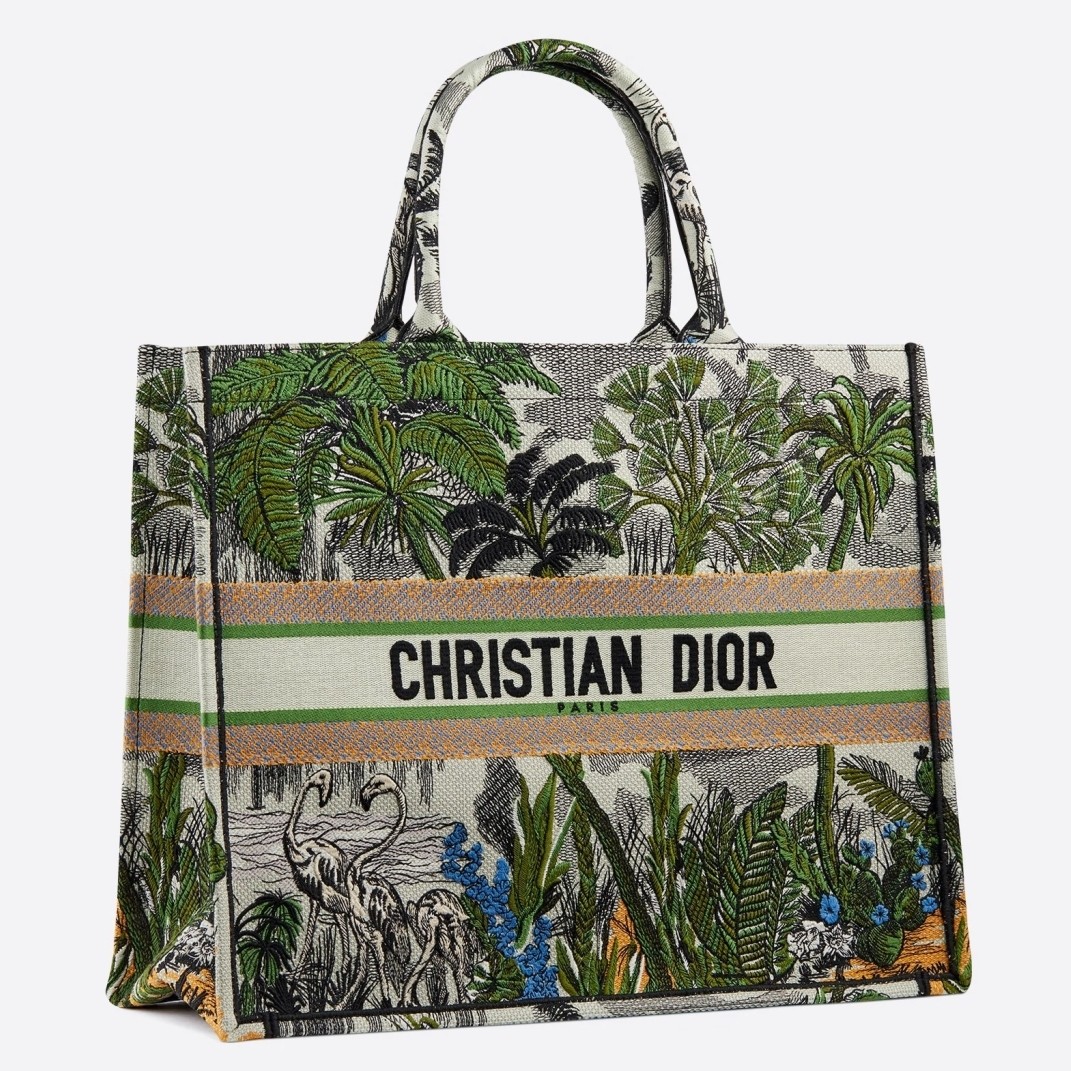 The French fashion house breaks down the creation of its newly designed Book Tote in canvas embroidered with a green Toile de Jouy Tropicalia motif for Fall Winter 2019 bag collection. Deriving from as early as 1947, the French textile reimagined on the bag first was seen on the walls of the couturier’s first boutique, “Colifichets.”