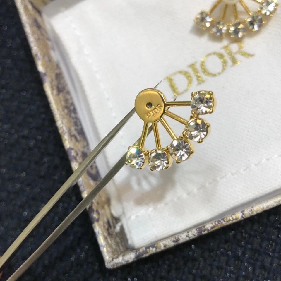 The Petit CD earrings are timeless and elegant with an asymmetric design. A 'CD' signature adorns one side, while the other has a white resin pearl and a star. On the back of the ear, a fan of white crystals illuminates the earlobe. These earrings will lend sparkle to any look, and can be worn with other Petit CD styles.