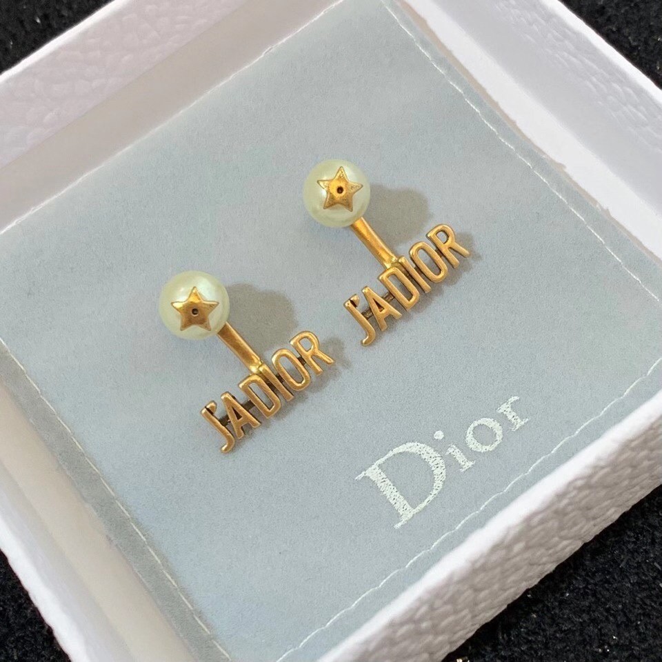 The J'Adior earrings were shown on the runway and stand out for their modern design. A white resin pearl sits at the base of the ear and is adorned with a star while the antique gold-finish metal 'J'Adior' signature hangs on the back side. Effortless for the day or night, these earrings can be worn with other J'Adior styles.