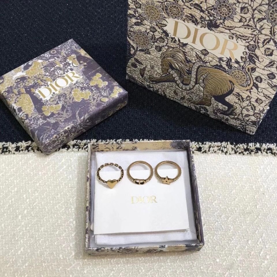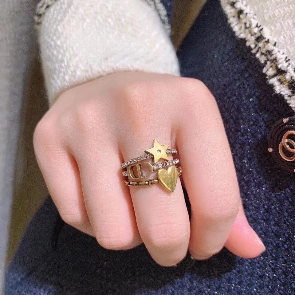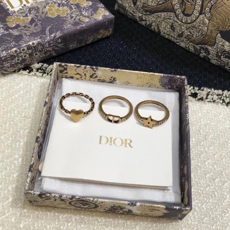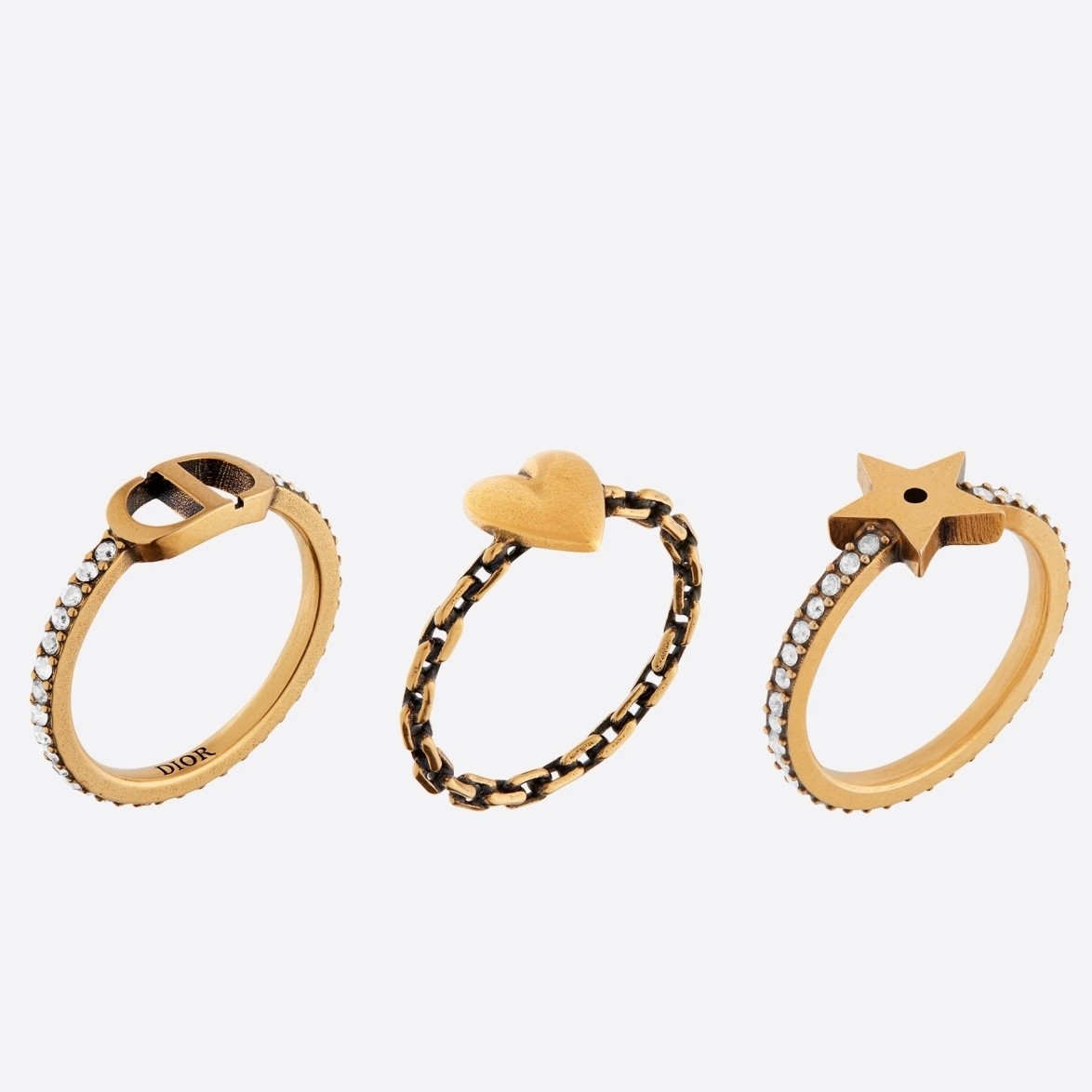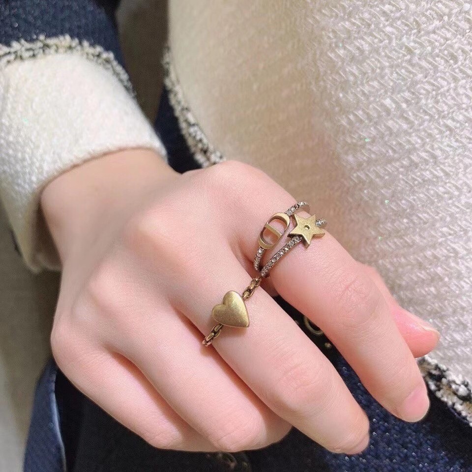 The ring set is part of the new Lucky CD line and has a delicate, elegant look. The antique gold-finish metal rings feature crystals or a chain-like finish, with a 'CD' signature and Christian Dior's emblematic star and heart charms. These rings can be worn together or separately, or with other styles from the Lucky CD collection.