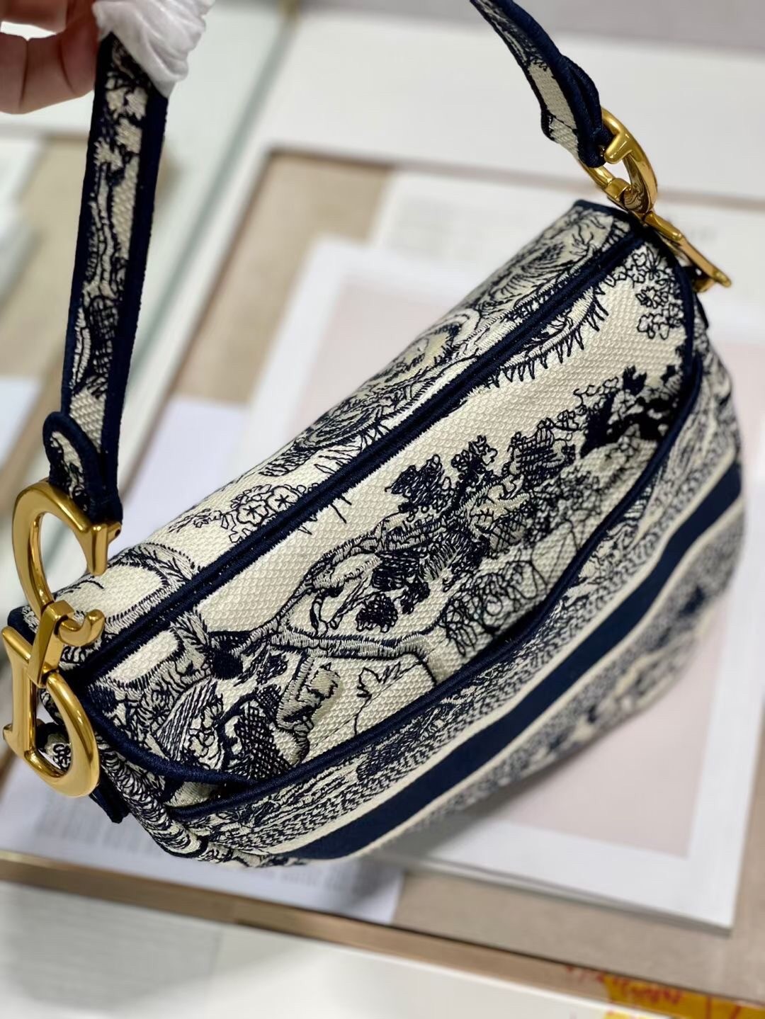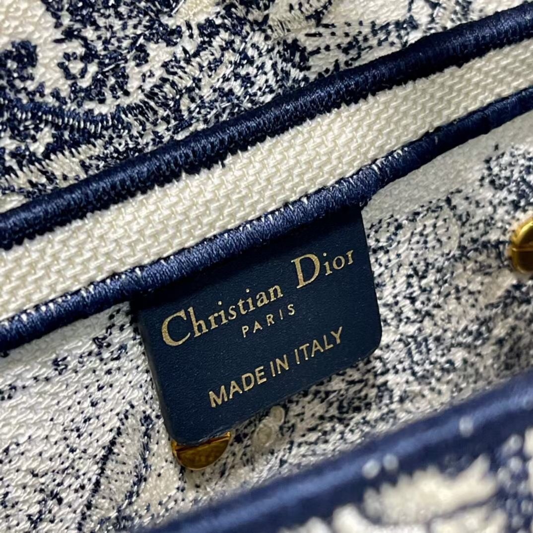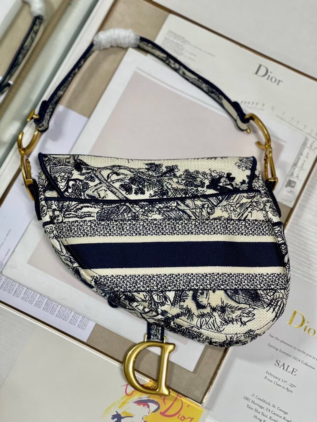 Maria Grazia Chiuri brings a fresh update to the iconic Saddle bag. The design is fully embroidered with the hallmark Toile de Jouy motif, further enhanced by a 'CHRISTIAN DIOR' signature on the front. The legendary design features a Saddle flap with a magnetic 'D' stirrup clasp and boasts an antique gold-finish metal 'CD' signature on each side of the handle. The bag can be customized with different shoulder straps and may be coordinated with the season's other Toile de Jouy creations.