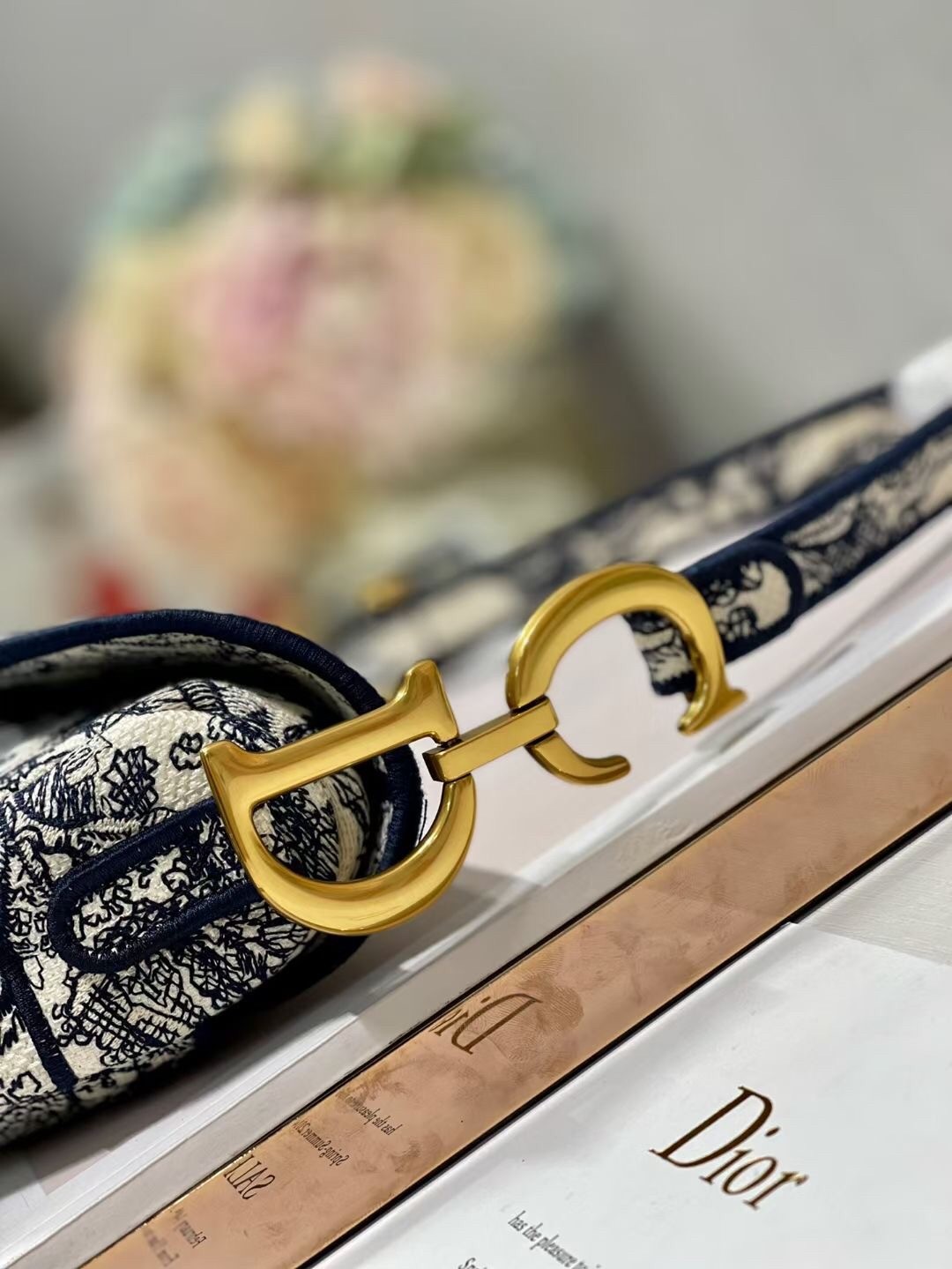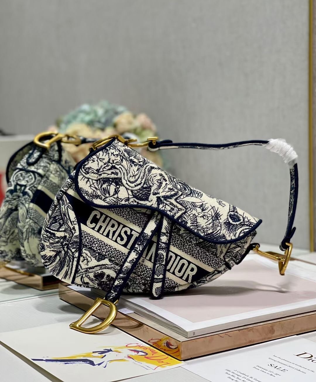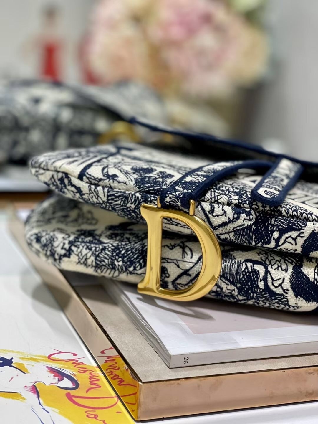 Maria Grazia Chiuri brings a fresh update to the iconic Saddle bag. The design is fully embroidered with the hallmark Toile de Jouy motif, further enhanced by a 'CHRISTIAN DIOR' signature on the front. The legendary design features a Saddle flap with a magnetic 'D' stirrup clasp and boasts an antique gold-finish metal 'CD' signature on each side of the handle. The bag can be customized with different shoulder straps and may be coordinated with the season's other Toile de Jouy creations.