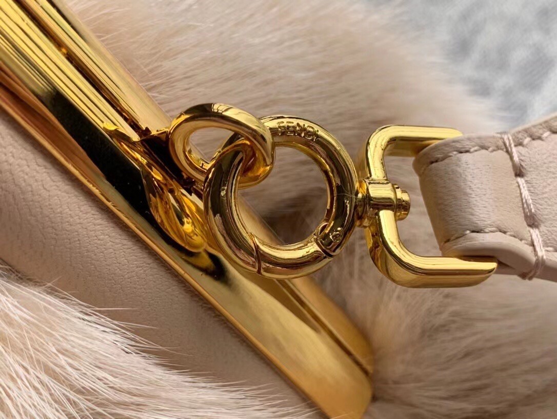 Small Fendi First bag made of soft, pale pink mink with oversized metal F clasp bound in tone on tone nappa leather. Featuring an internal compartment lined in leather, pull out internal attachment points and gold-finish metalware. Can be carried by hand as a clutch or worn on the shoulder thanks to the detachable shoulder strap.