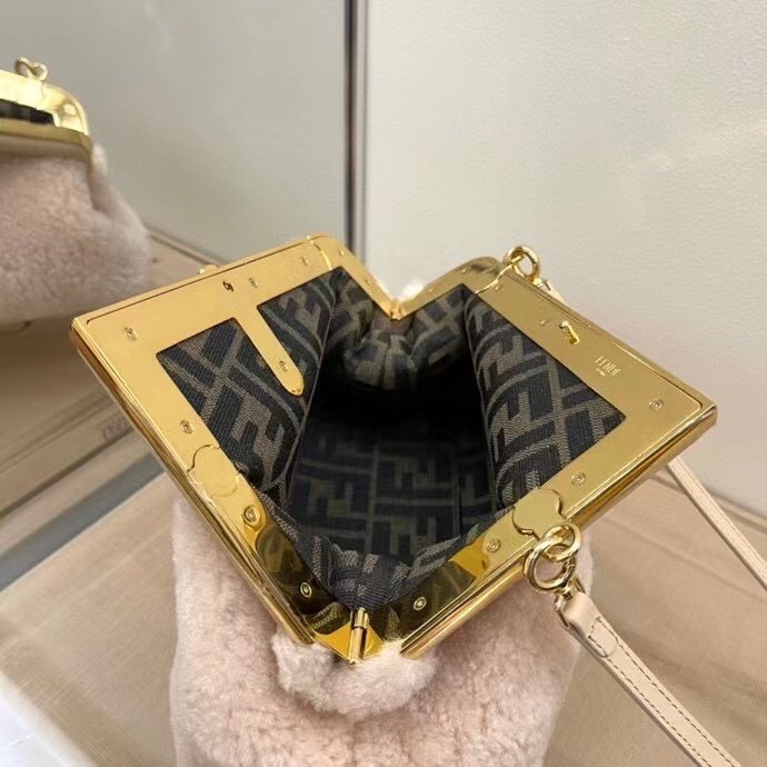 Small Fendi First bag made of soft pink merino sheepskin with oversized metal F clasp bound in tone on tone nappa leather. Featuring an interior compartment lined in fabric with the iconic FF motif, removable inner hooks and gold-finish metalware. Can be carried by hand as a clutch or worn on the shoulder thanks to the detachable shoulder strap.