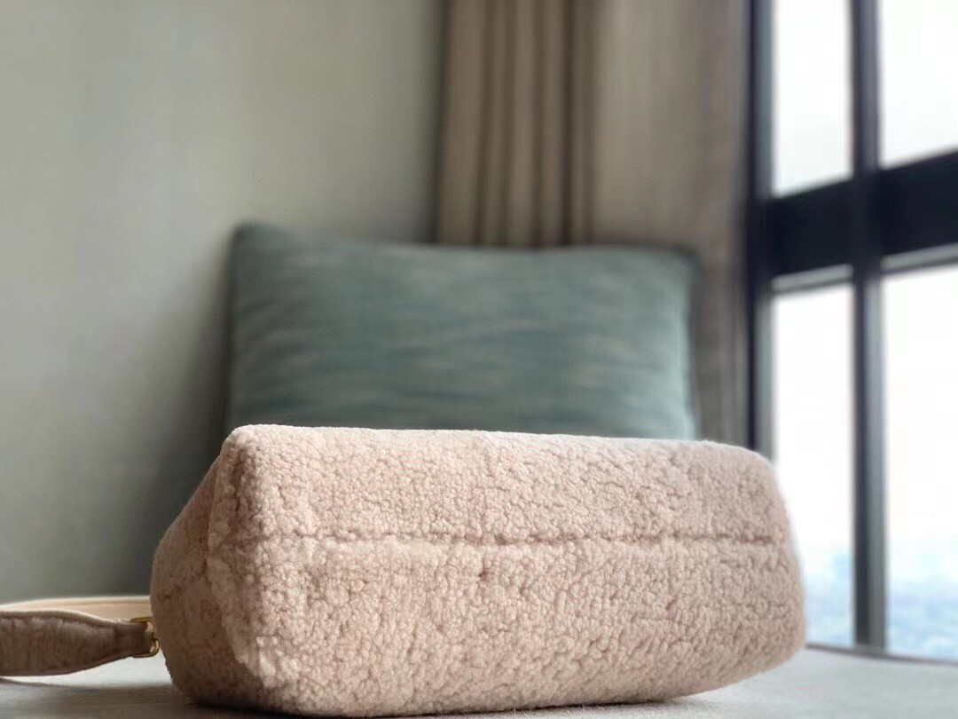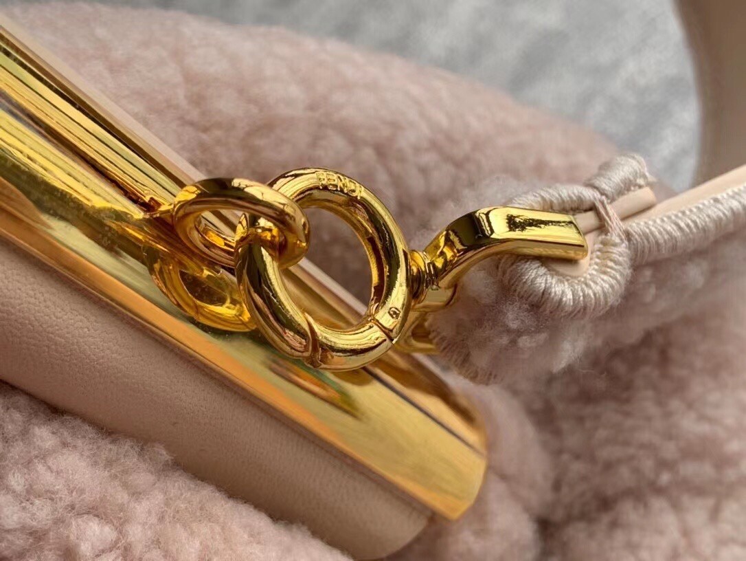 Fendi First medium bag made of soft pink merino sheepskin with oversized metal F clasp bound in tone on tone nappa leather. Featuring an interior compartment lined in fabric with the iconic FF motif, removable inner hooks and gold-finish metalware. Can be carried by hand as a clutch or worn on the shoulder thanks to the detachable shoulder strap.