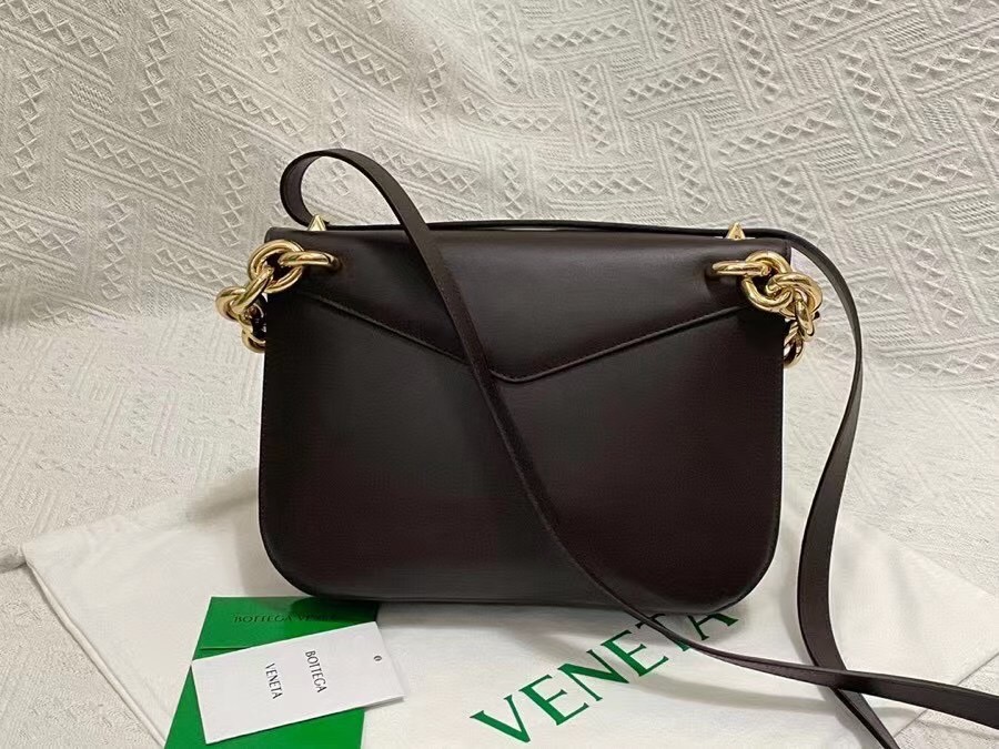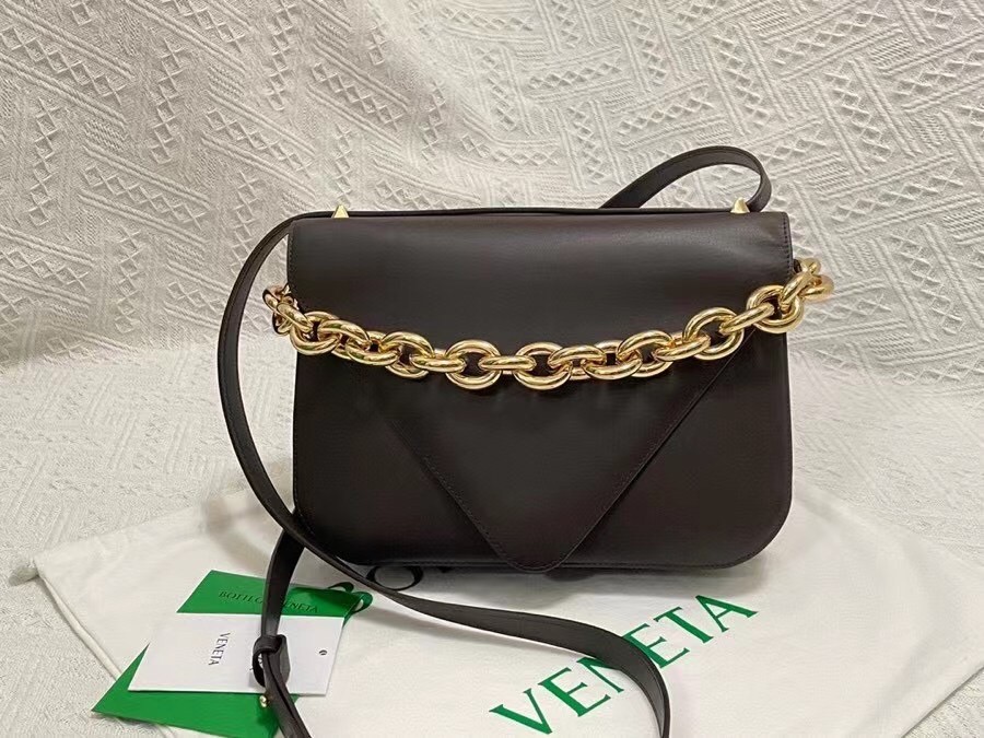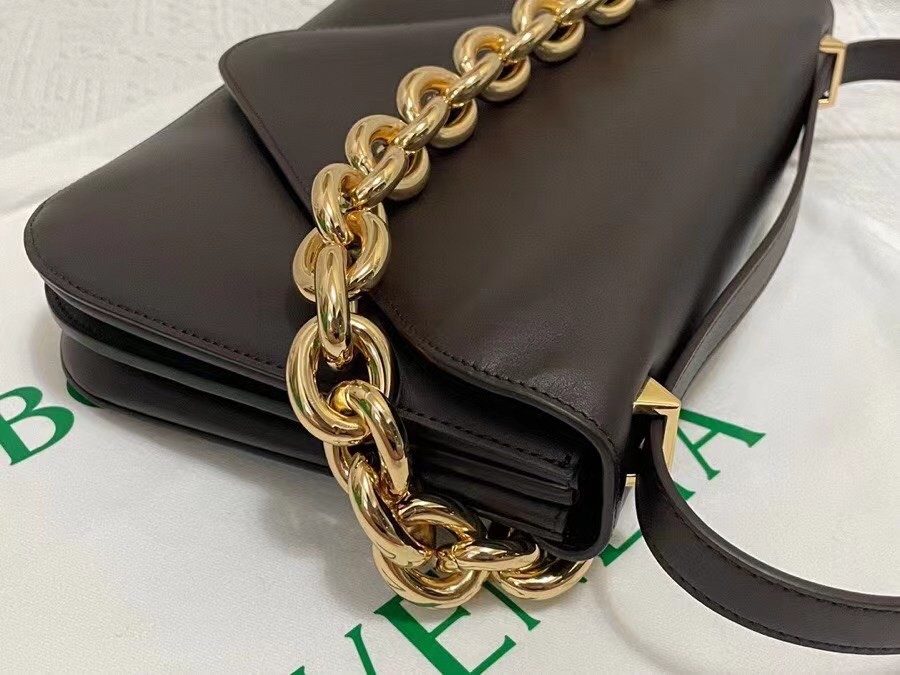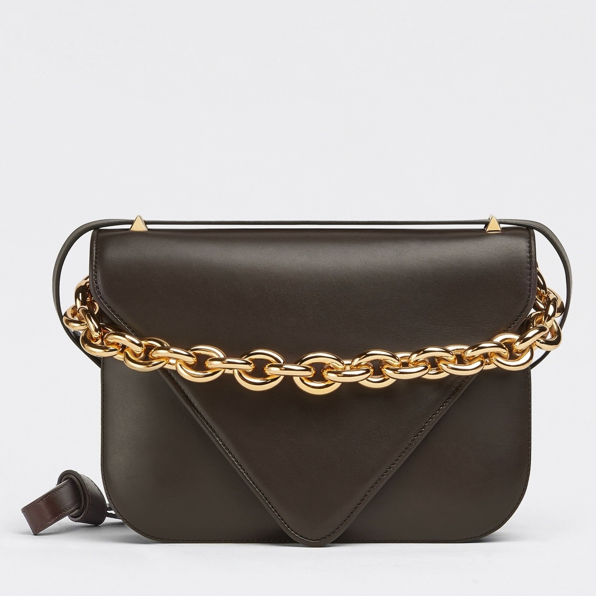The Mount from Bottega Veneta is part of a family of bags that has acquired must-have status in fashion insider circles. This particular design features the now-signature golden chainlink strap and pointed foldover flap. In terms of practicality, it's made from smooth calfskin leather, and is equipped with a detachable strap for shoulders and cross-body.