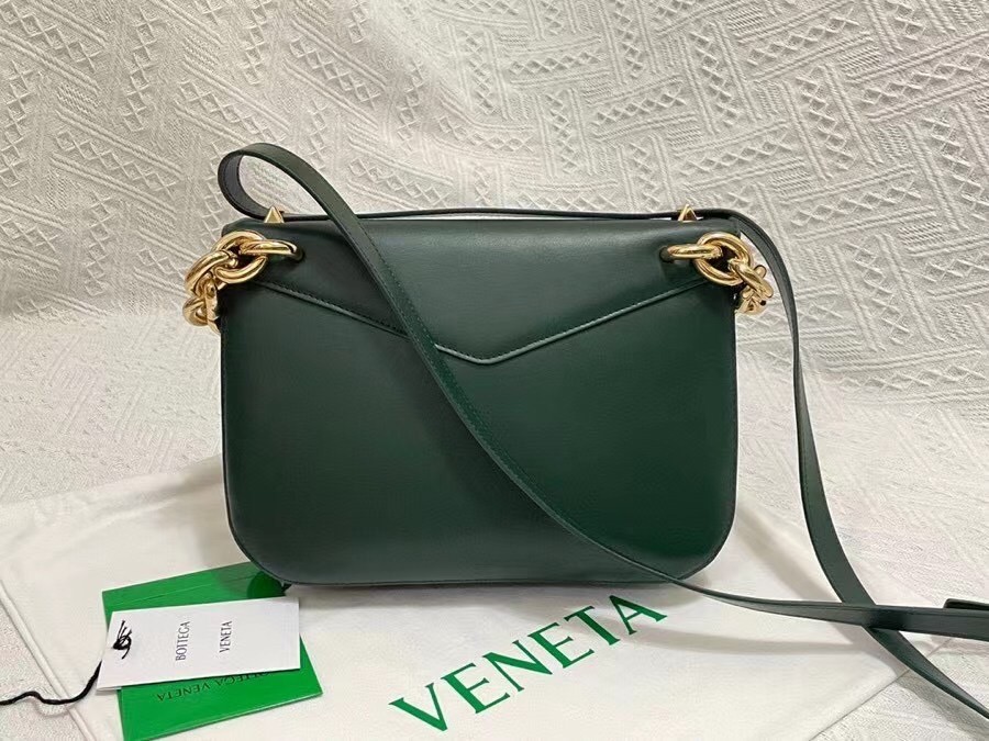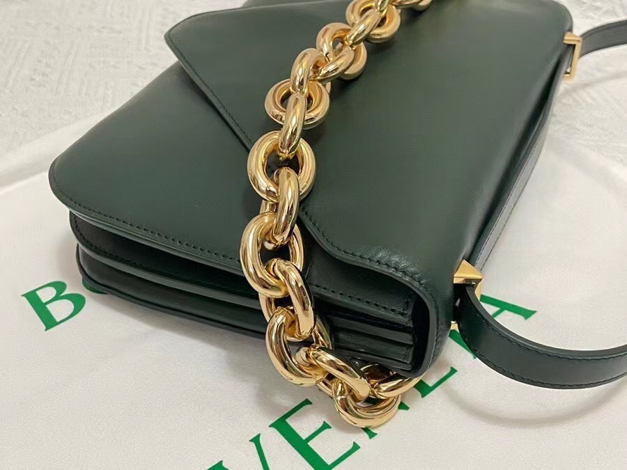 The Mount from Bottega Veneta is part of a family of bags that has acquired must-have status in fashion insider circles. This particular design features the now-signature golden chainlink strap and pointed foldover flap. In terms of practicality, it's made from smooth calfskin leather, and is equipped with a detachable strap for shoulders and cross-body.