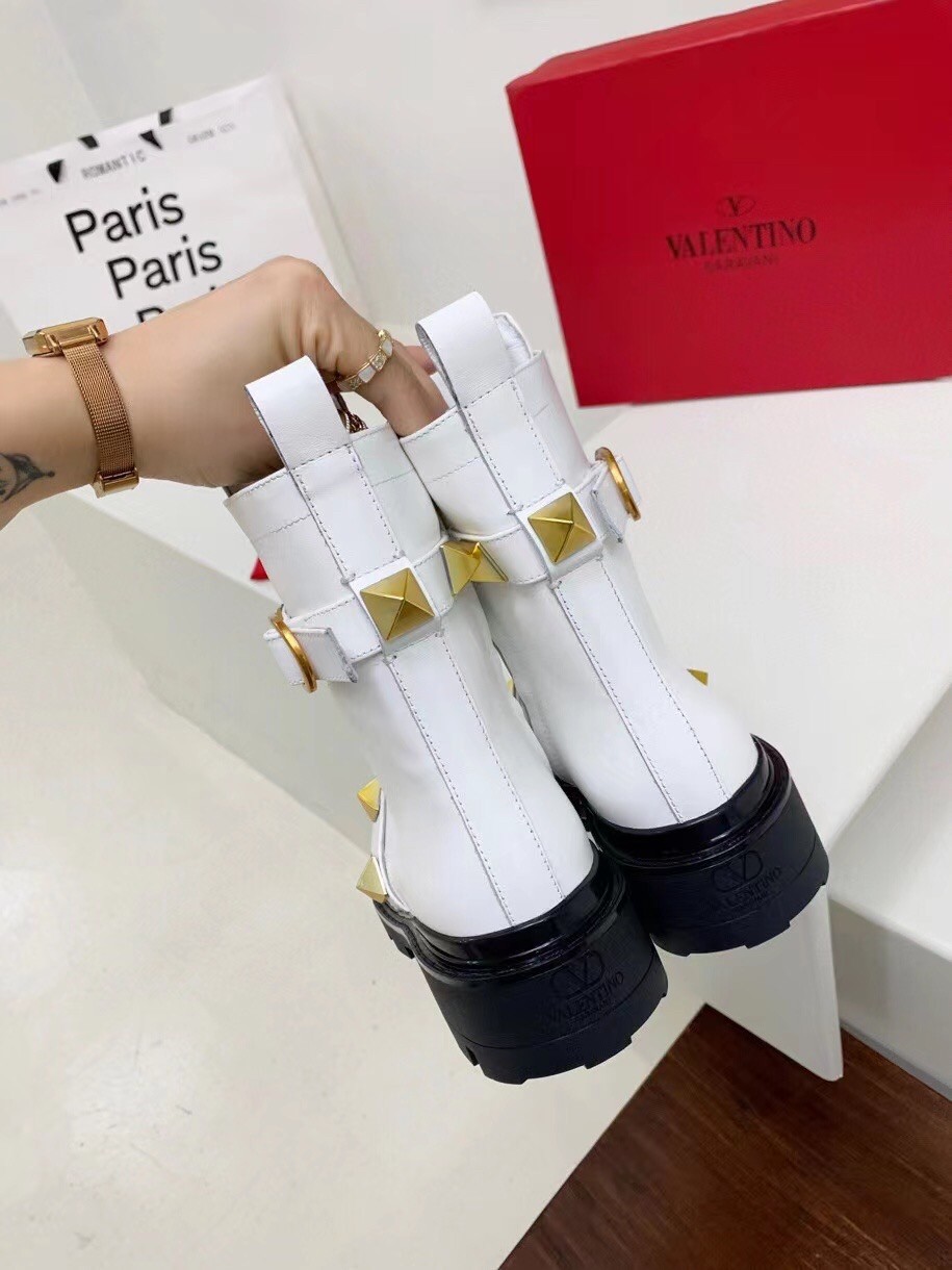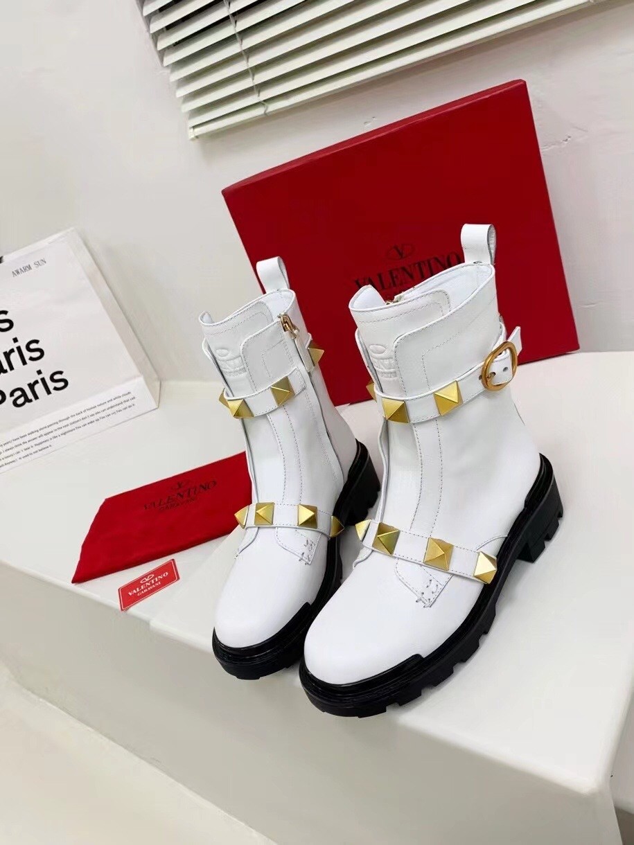 Valentino Roman Stud Combat Boots In White Calfskin