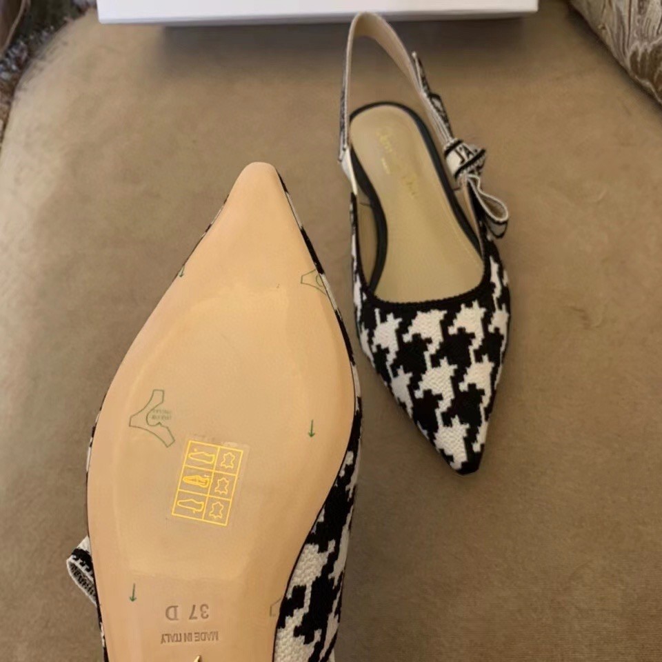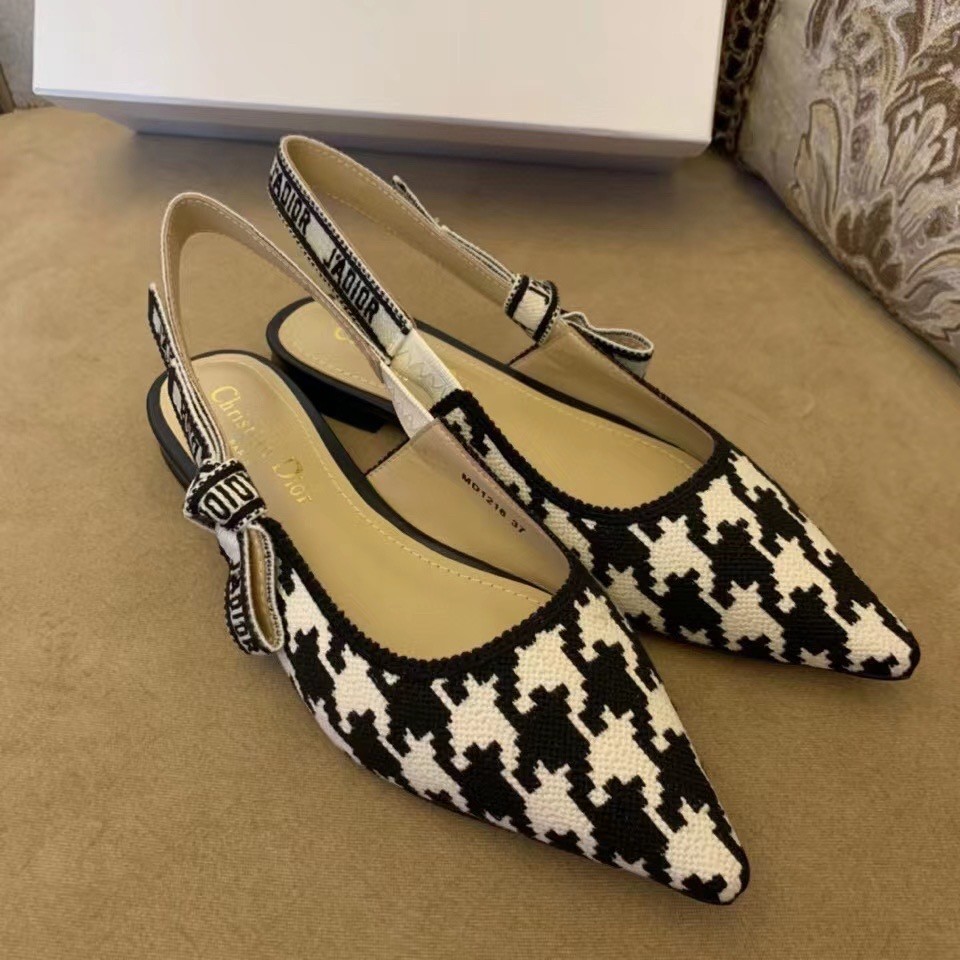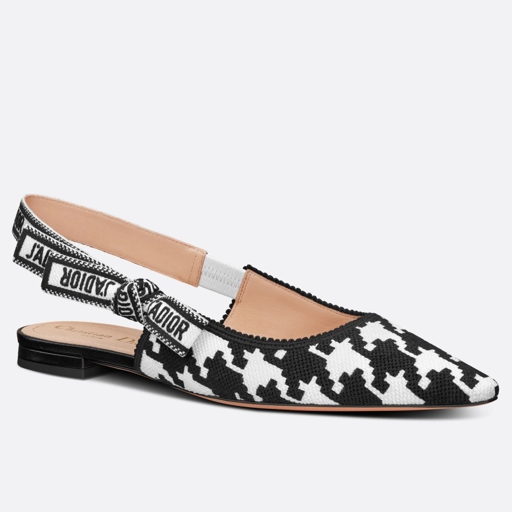 The J'Adior slingback ballerina flat is a prime example of Dior's savoir-faire. Elegantly playing on the House codes, this embroidered cotton style features a macro version of the House's iconic black and white Houndstooth motif. The two-tone 'J'ADIOR' signature on the embroidered cotton ribbon and flat bow complete this refined and elegant style.